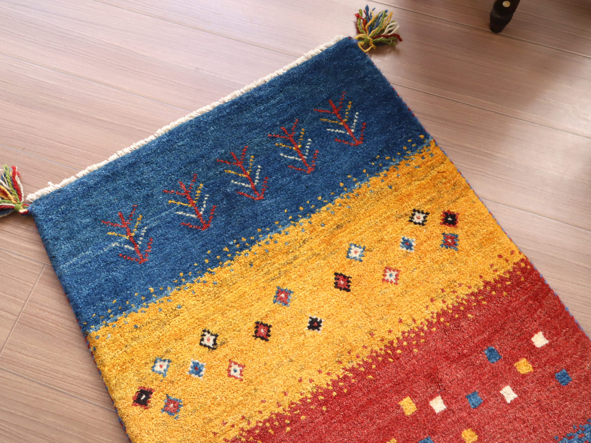 | 四隅にはカラフルな毛糸でできたポンポンがついています。 ギャッベの中で最もベーシックな織りのグレードです。動物や植物などが入った素朴なデザインが多く、一番ギャッベらしさを感じられるスタンダードな織り。 |