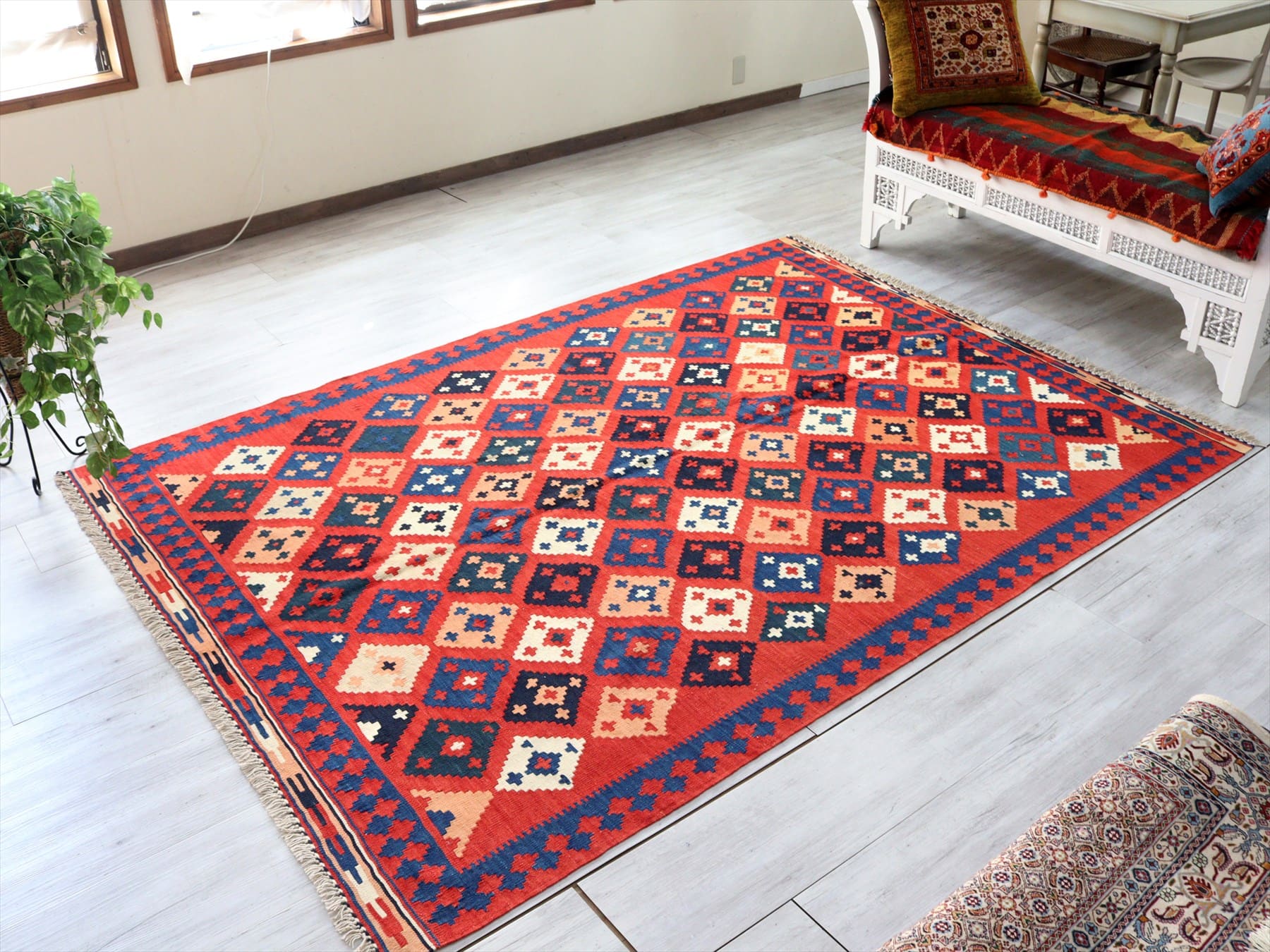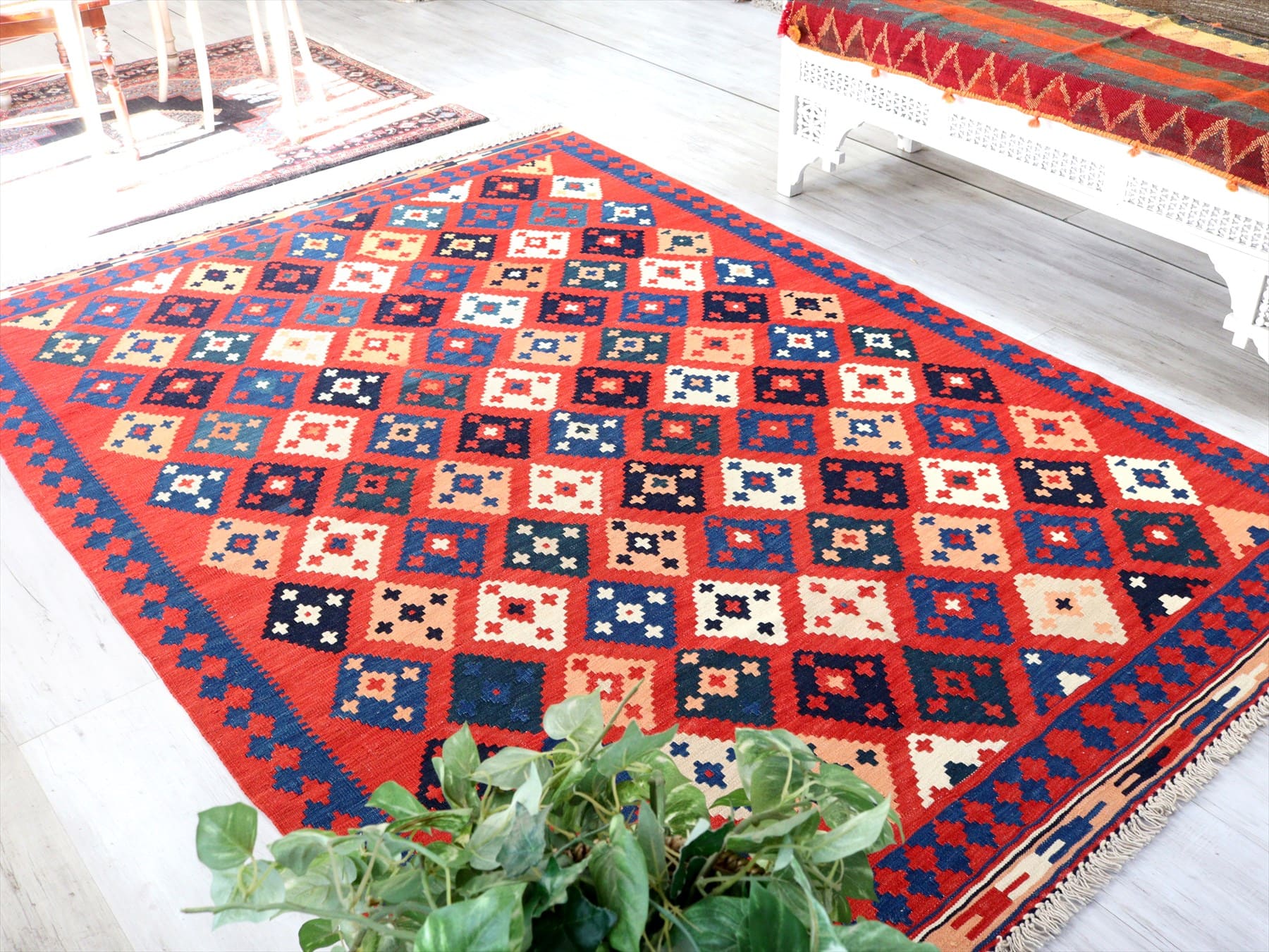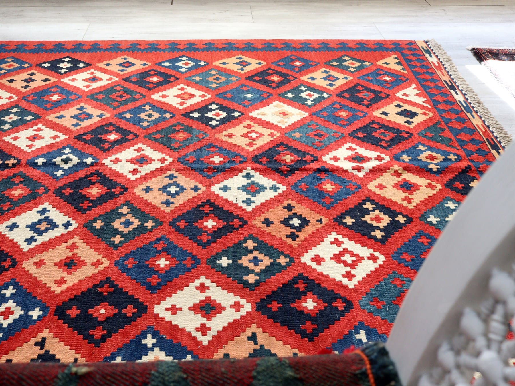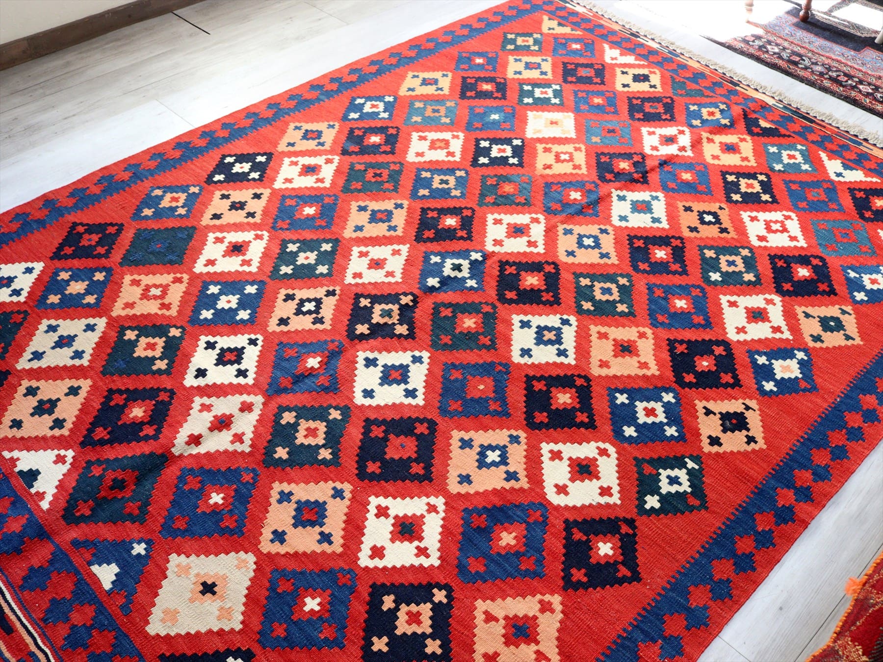 - キリム・カシュカイ族の手織りキリム239×173cm レッド カラフルなひし形モチーフ