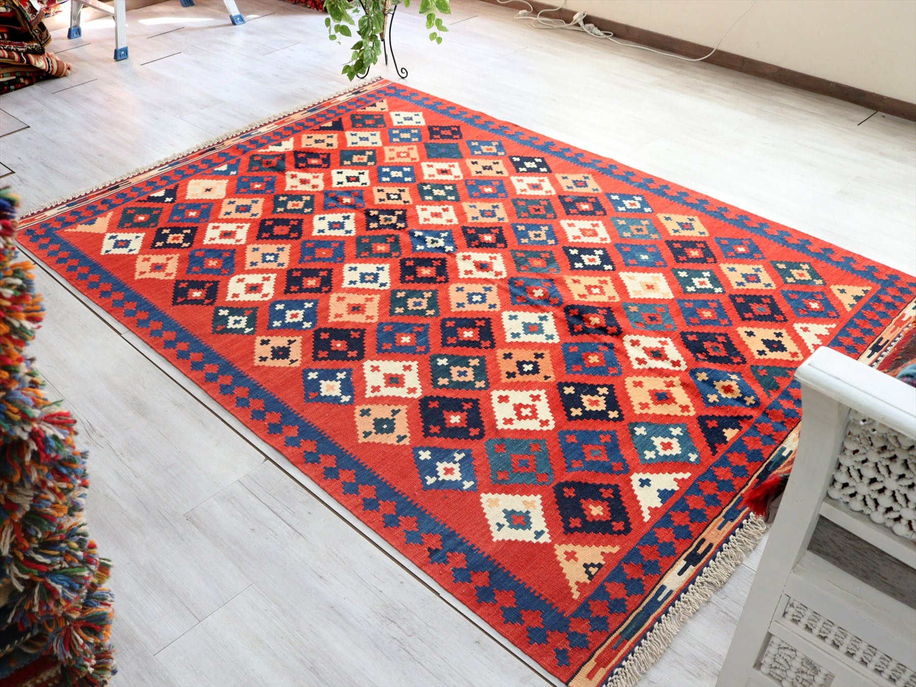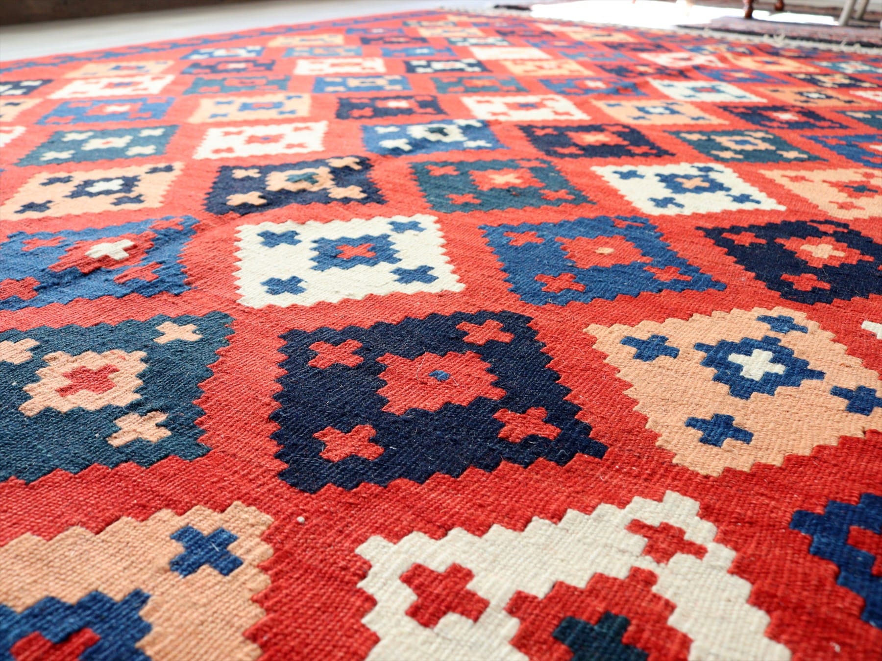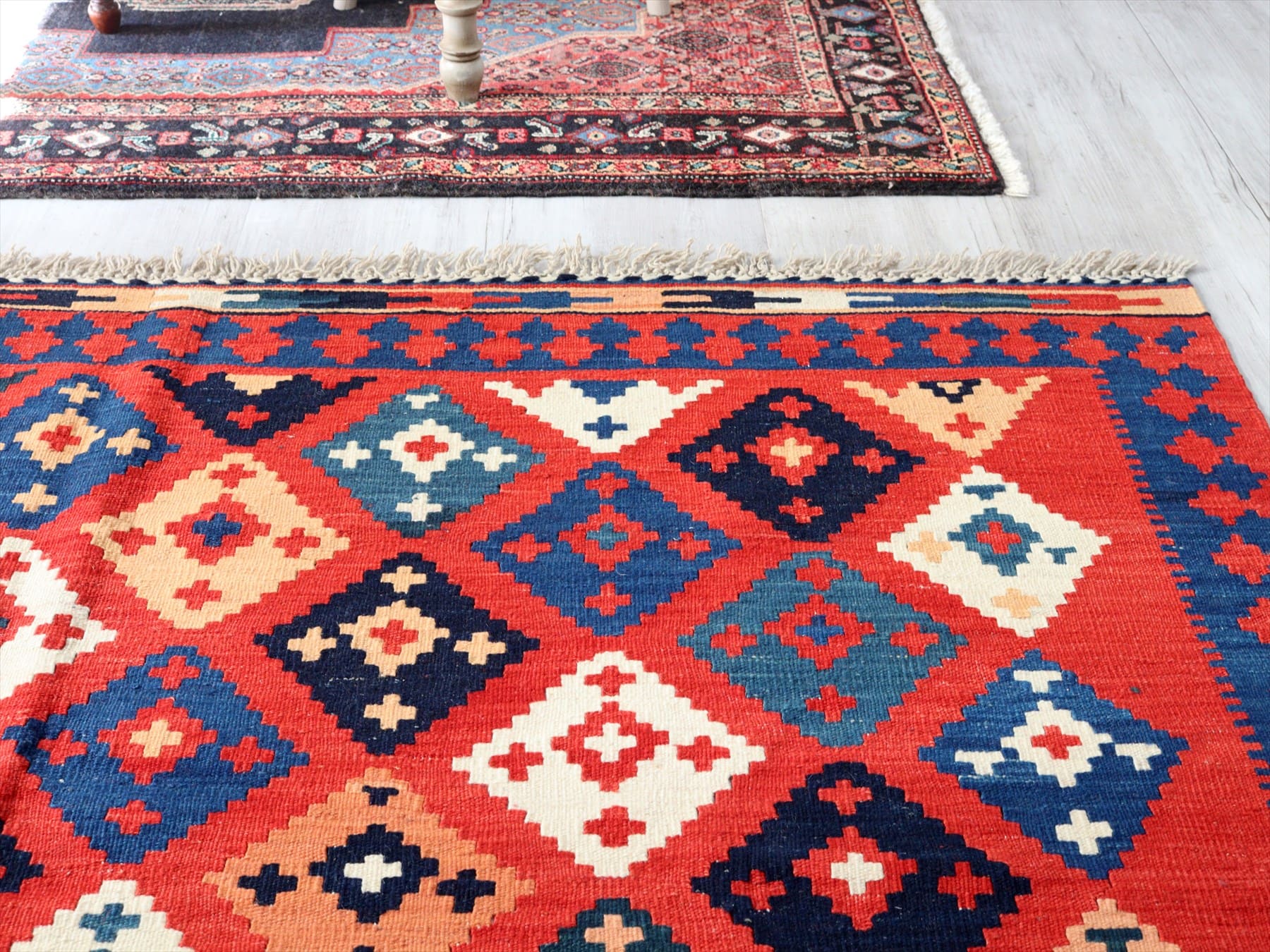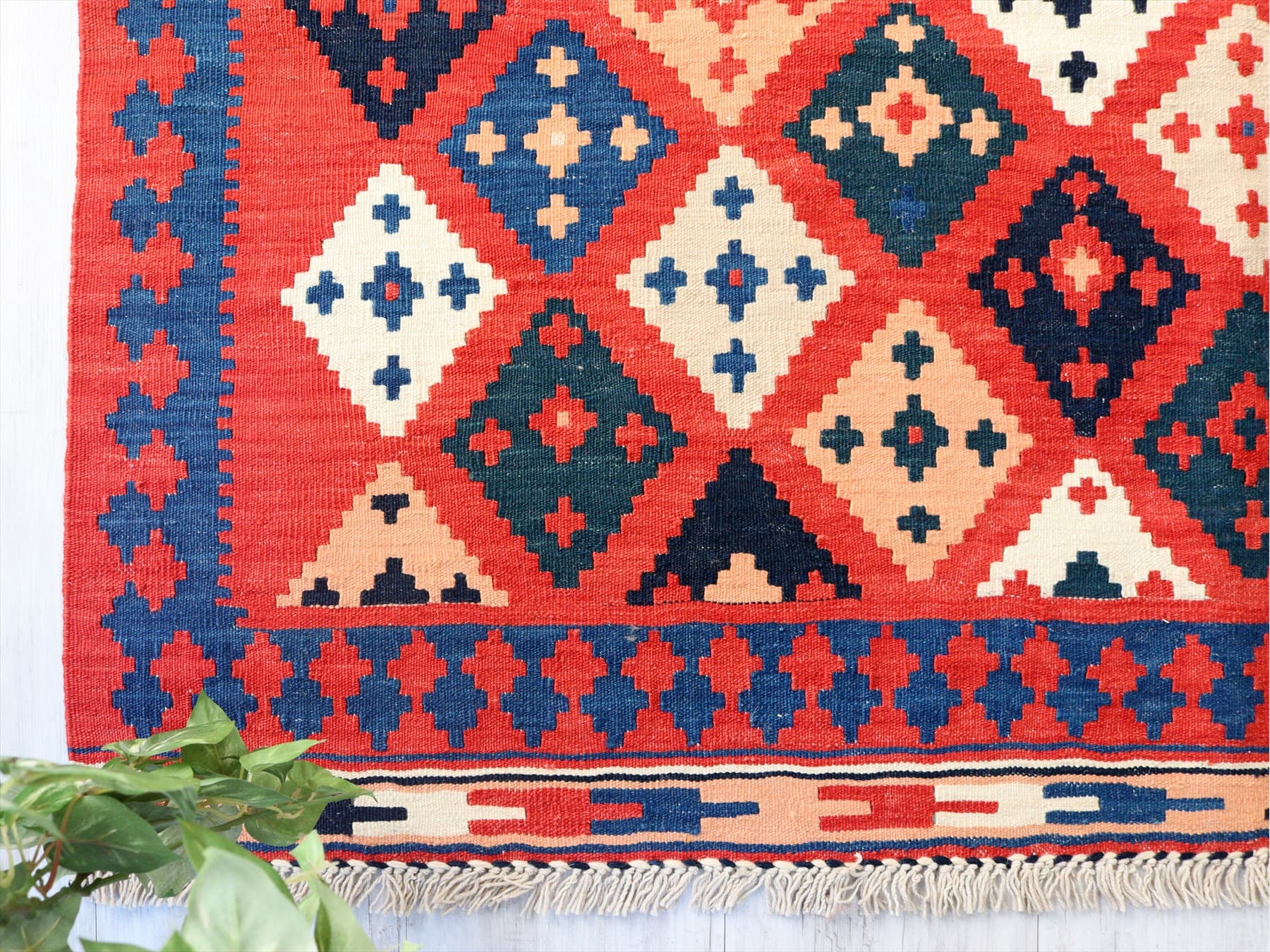 - キリム・カシュカイ族の手織りキリム239×173cm レッド カラフルなひし形モチーフ