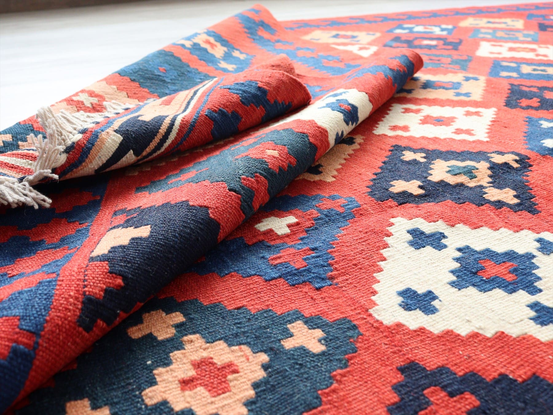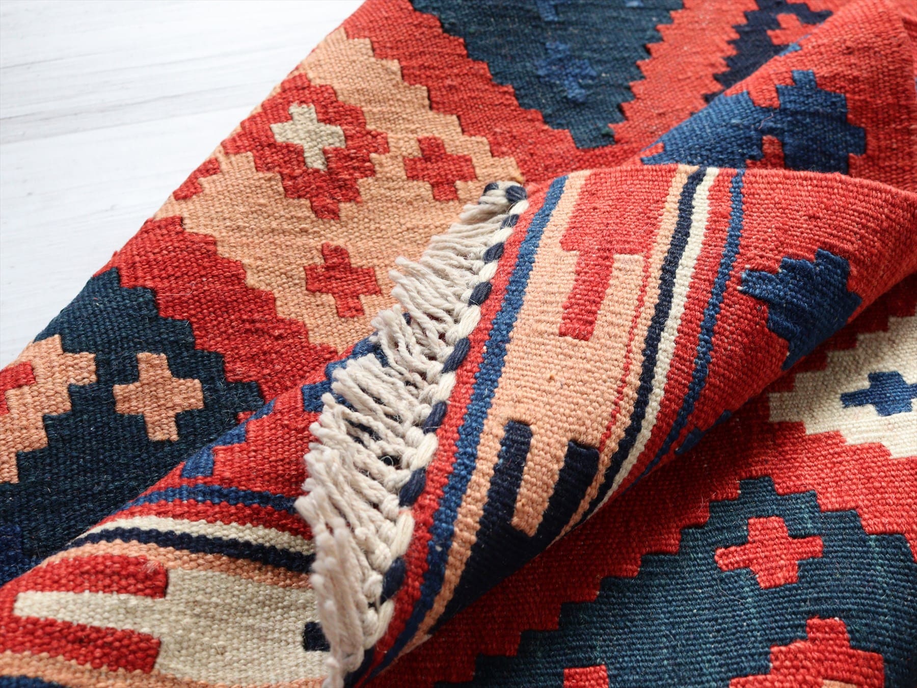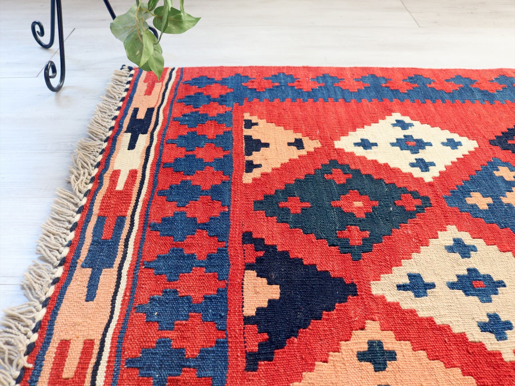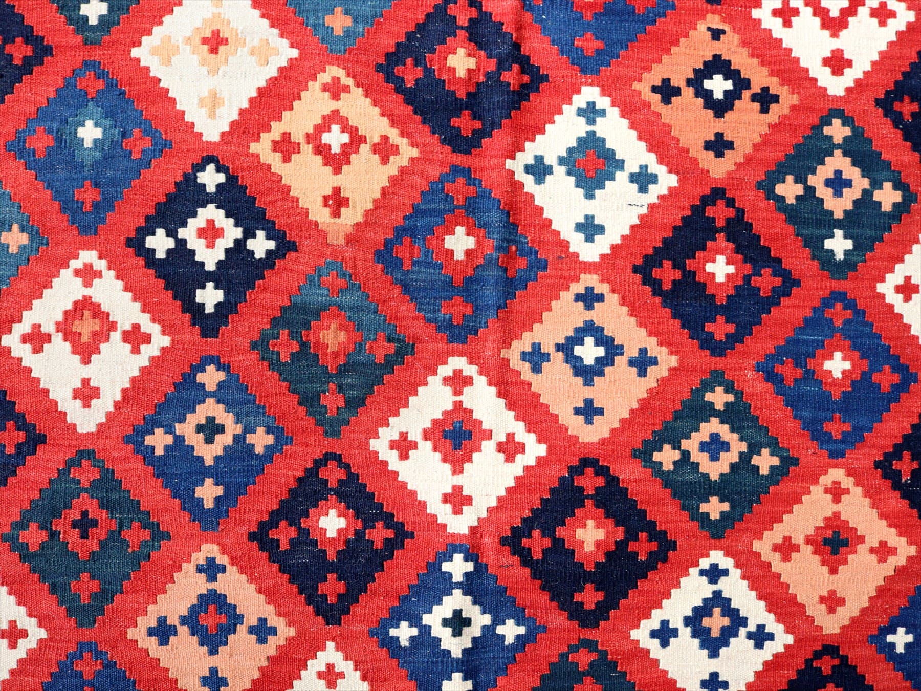 | 発色のよいレッド、ブルーが鮮やかで目をひくイラン南部・シーラーズを中心としたエリアで暮らす遊牧民「カシュカイ族」の織る手織りキリム。 トルコ系の言葉を話すカシュカイ族は、絨毯やキリムの文化もトルコやクルディッシュに似ていて、ユニークで色鮮やかな幾何学模様のキリムが多く織られています。 |