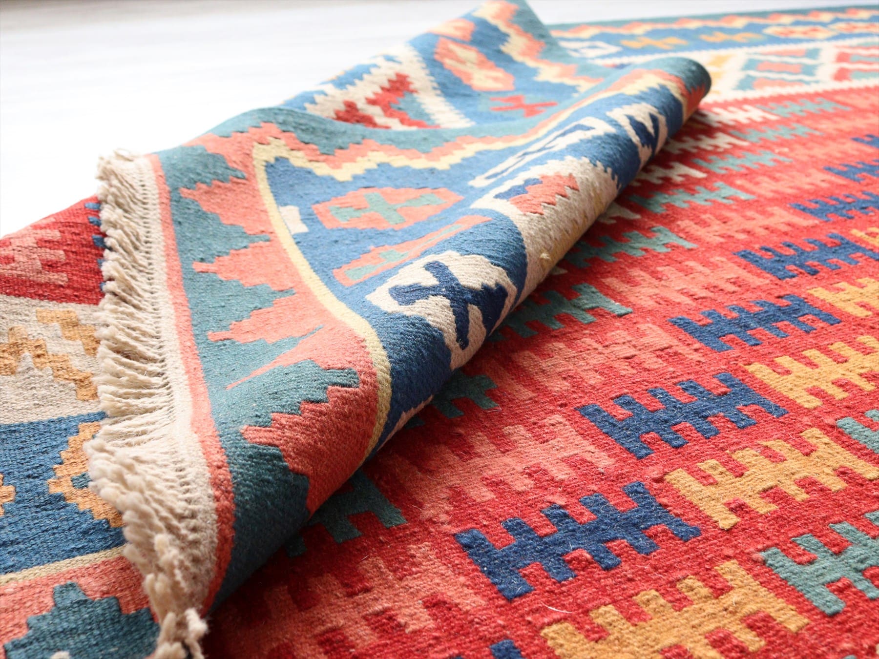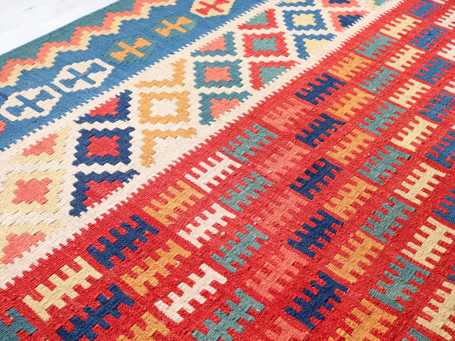 | カシュカイ族の織るキリムは一般的にトルコキリムより厚みがありがっちりとした質感です。織り地は厚みがあり、ぎゅっと目が詰まって、固くしっかりとしています。 |