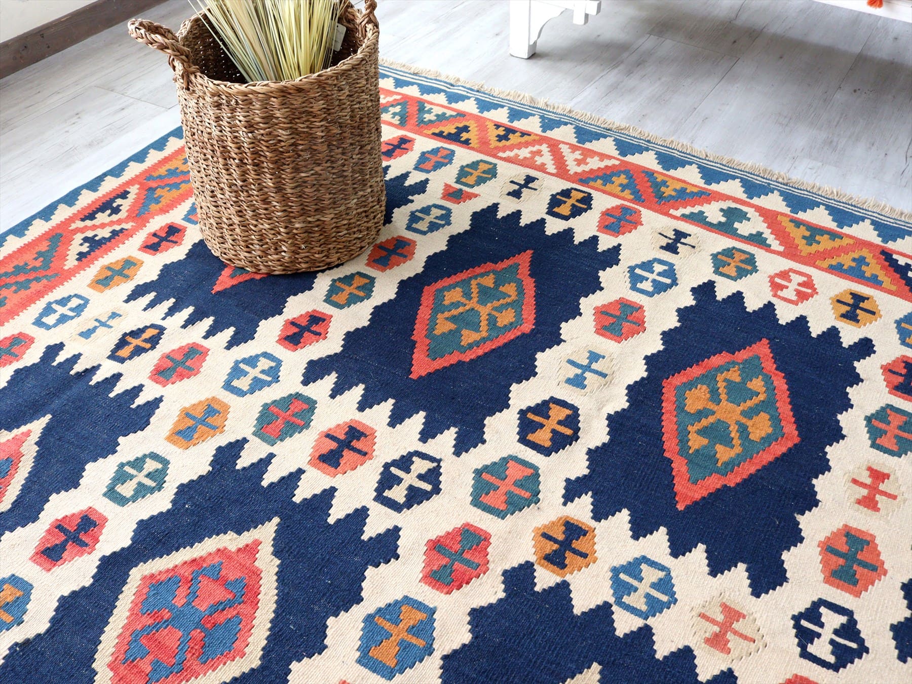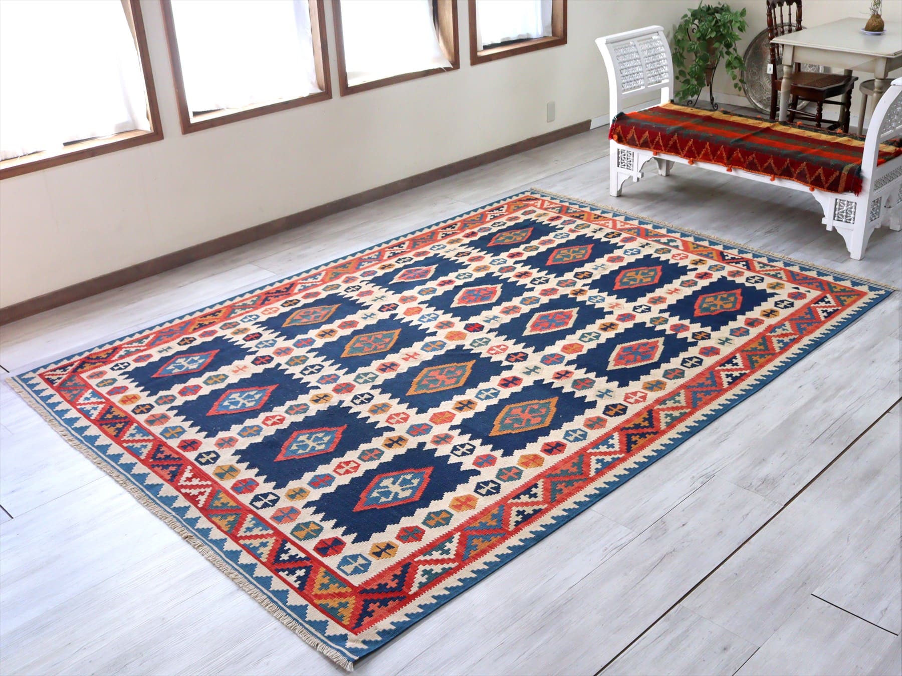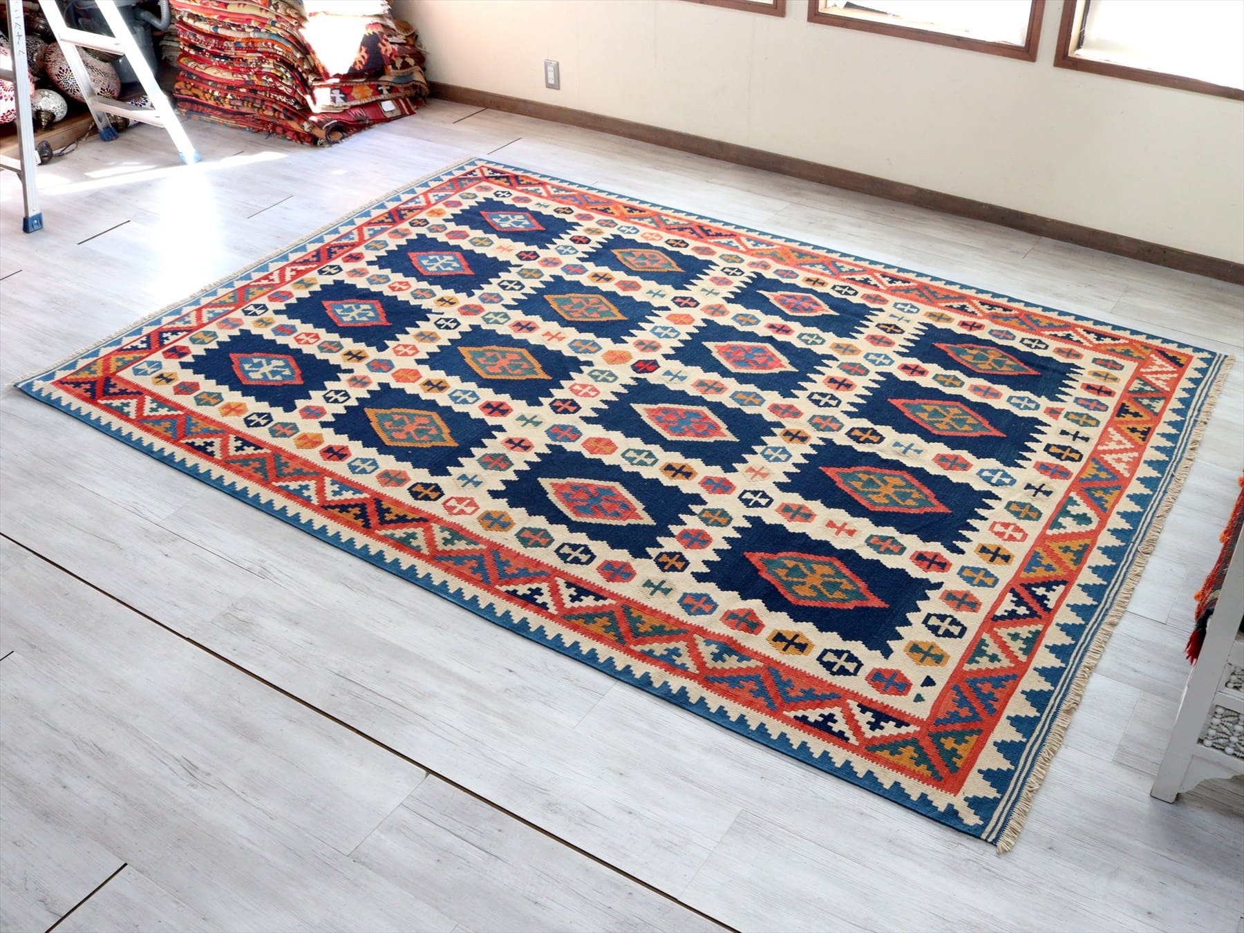 - キリム・カシュカイ族の手織りキリム282×201cm ネイビーブルー 伝統柄・ガーデンデザイン