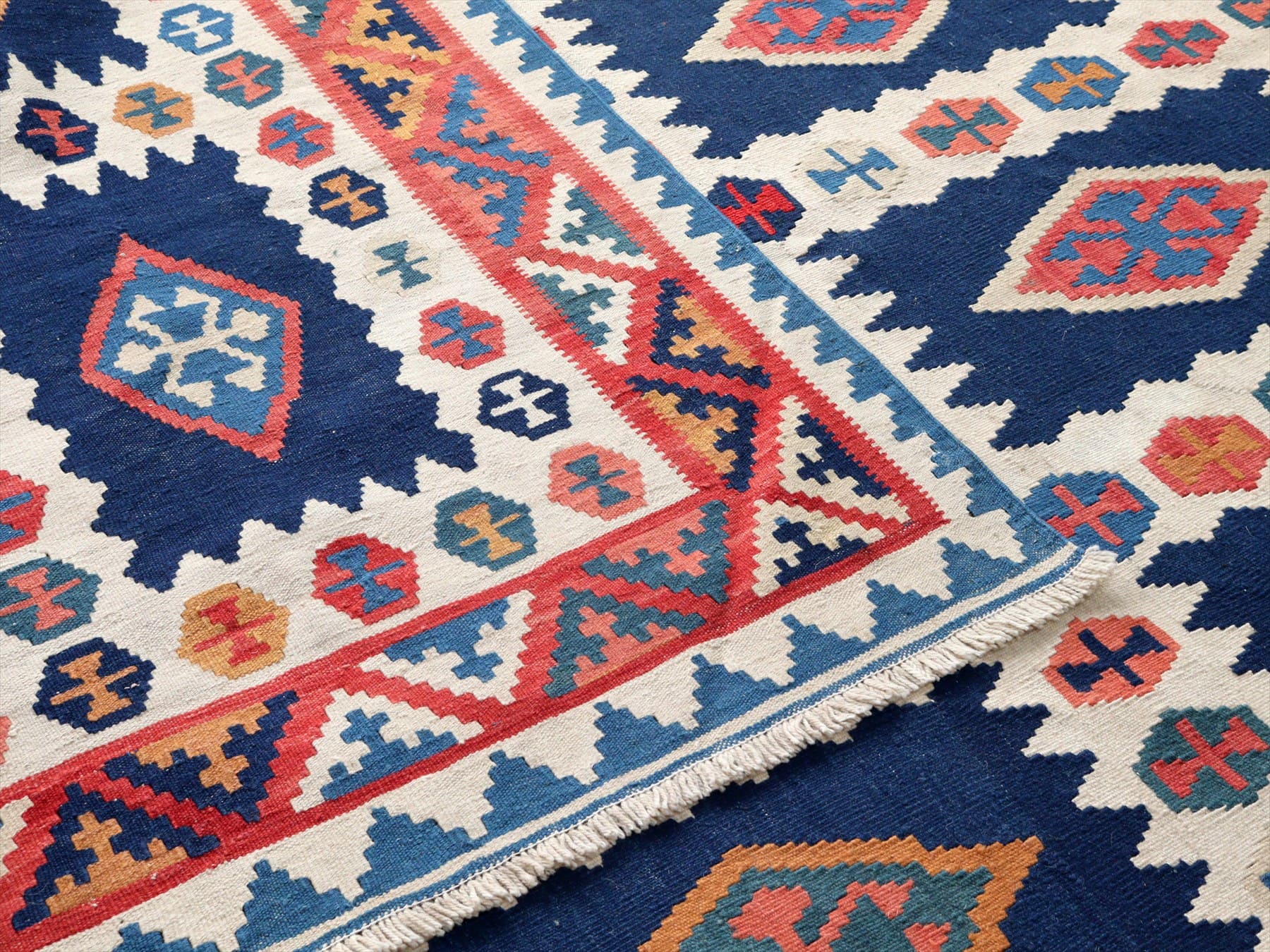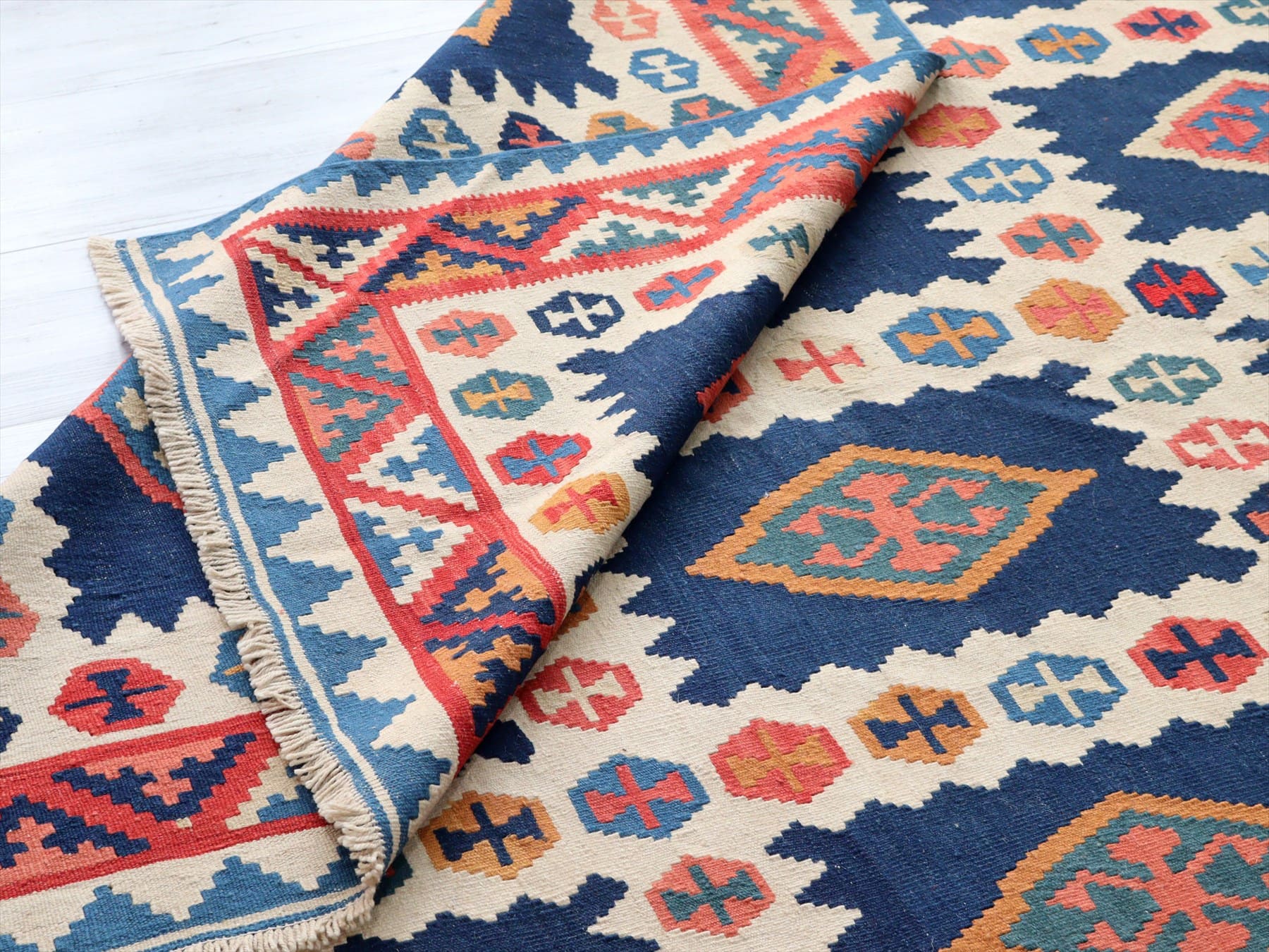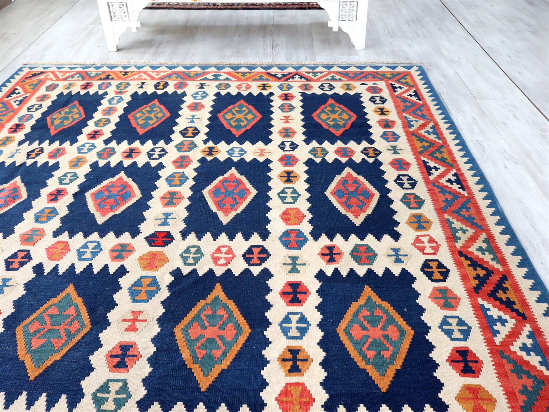 キリム・カシュカイ族の手織りキリム282×201cm ネイビーブルー 伝統柄・ガーデンデザイン