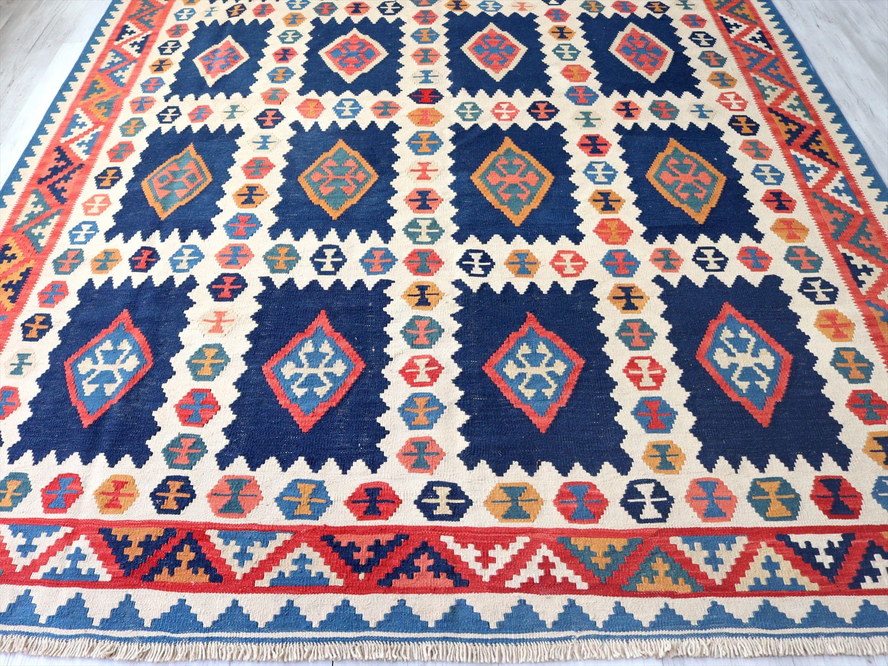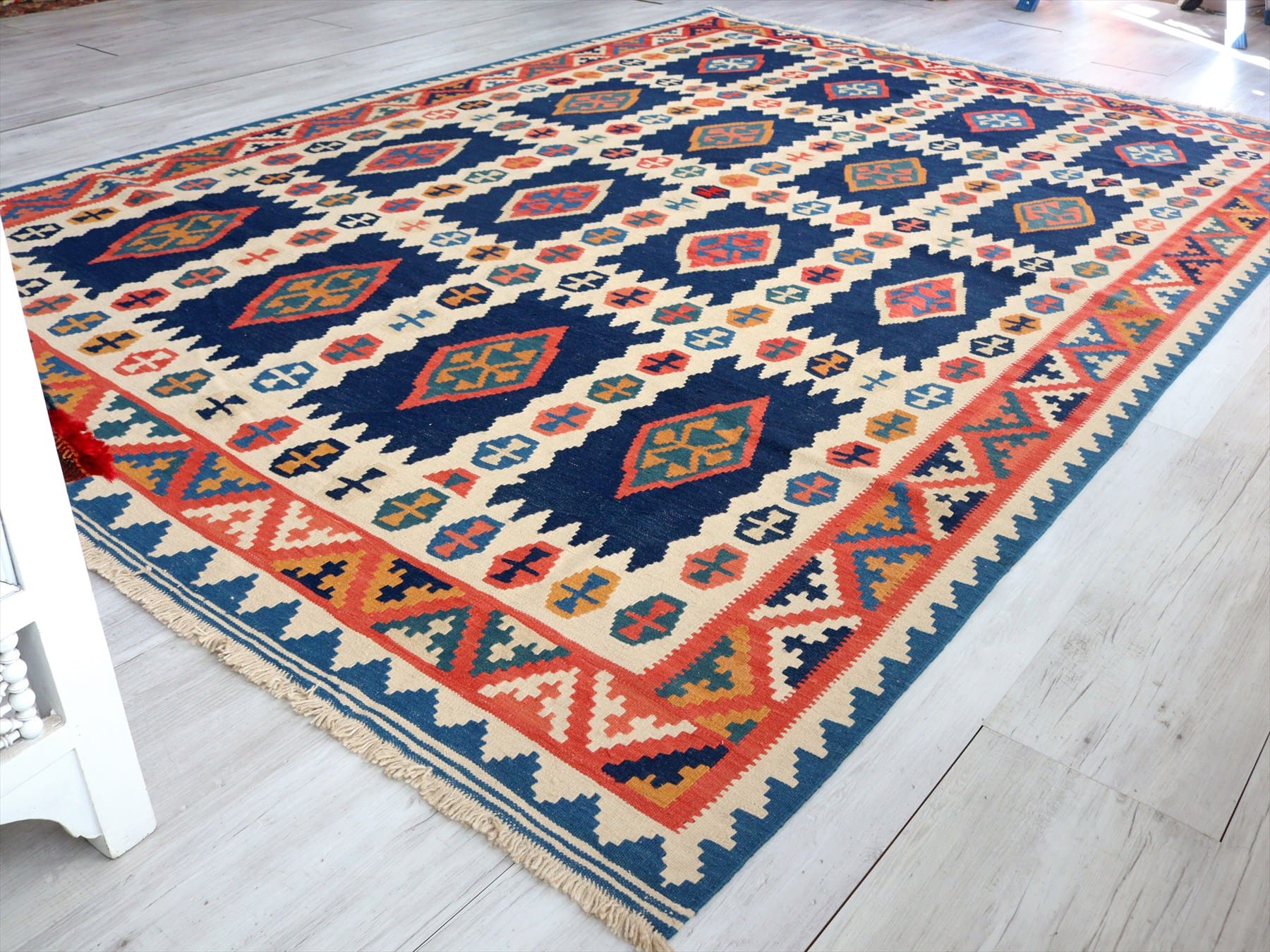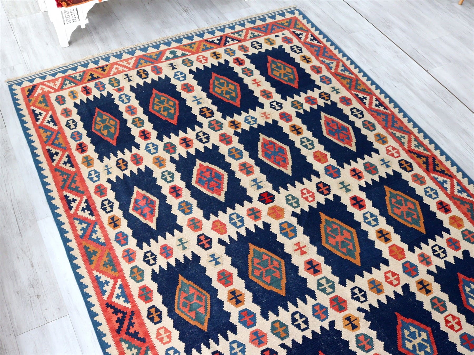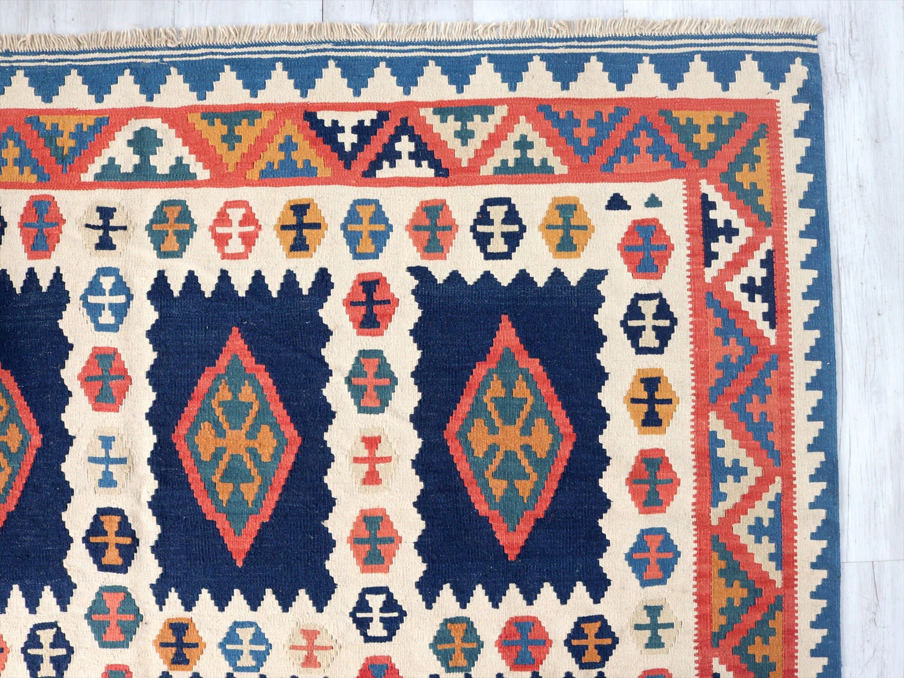 キリム・カシュカイ族の手織りキリム282×201cm ネイビーブルー 伝統柄・ガーデンデザイン