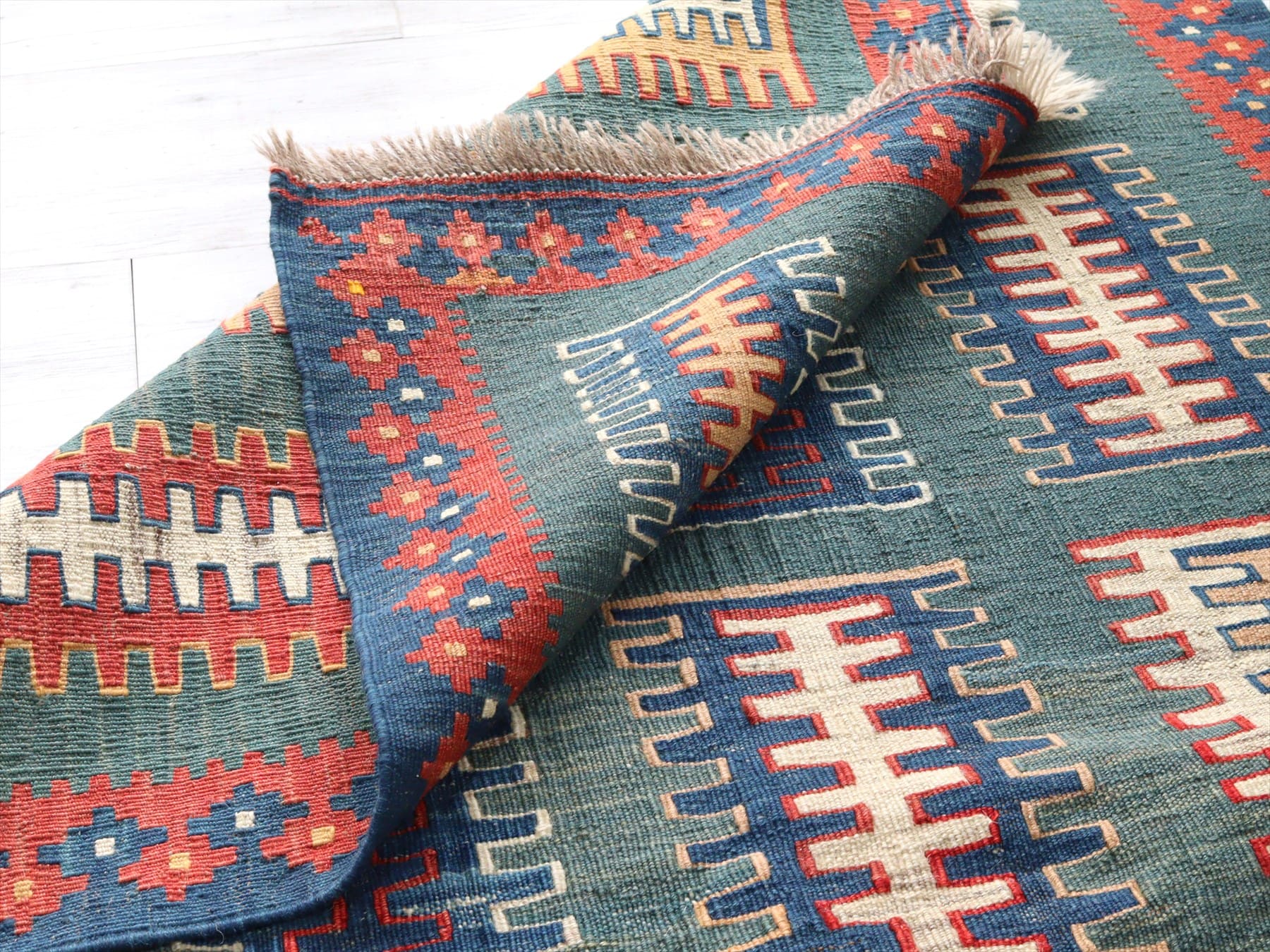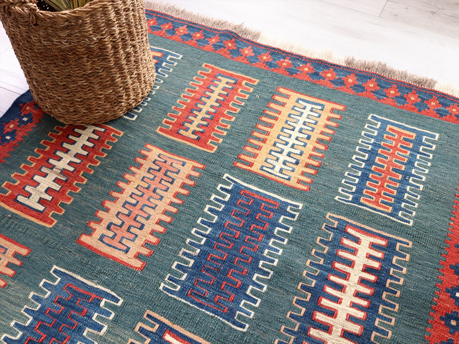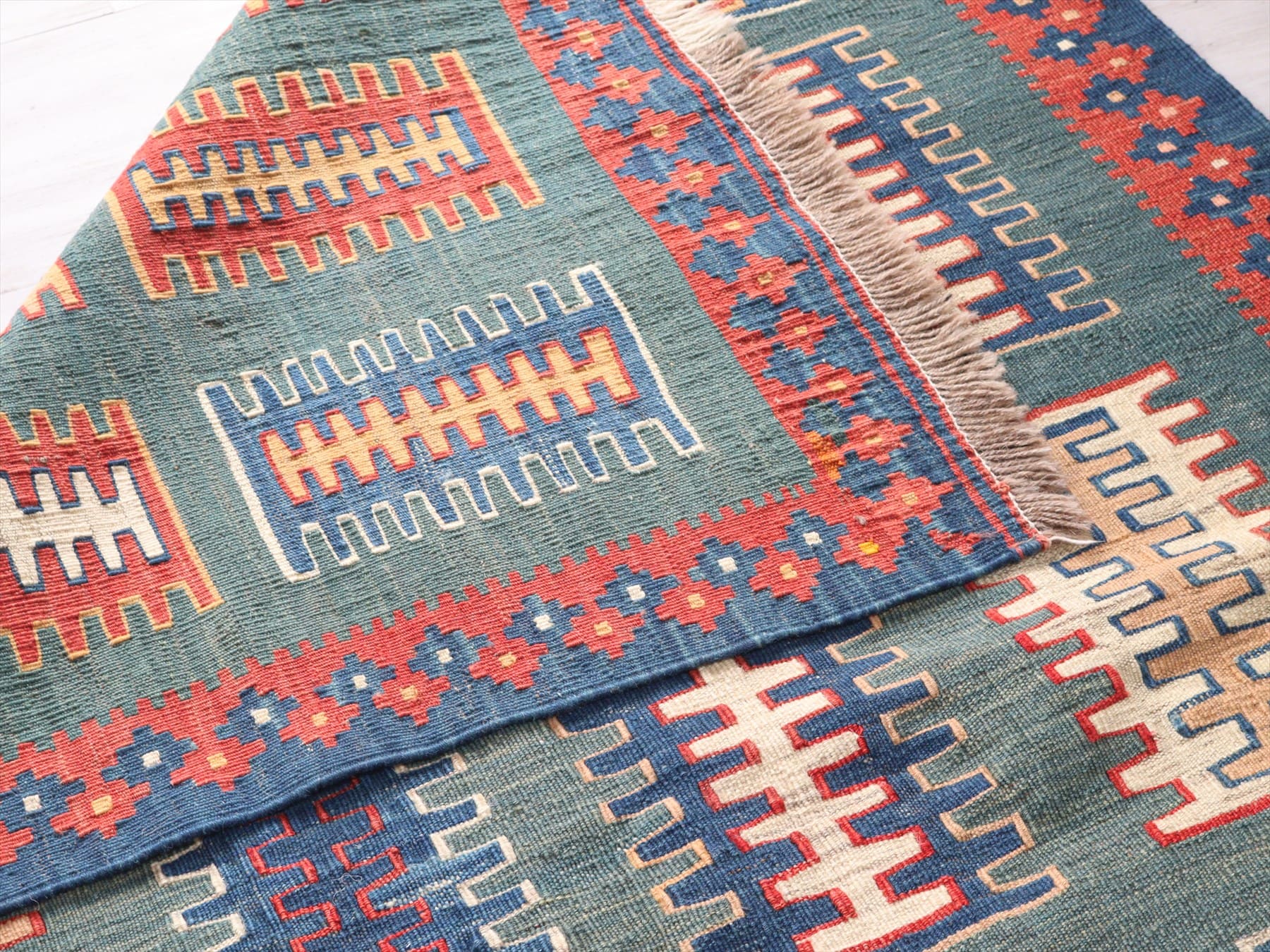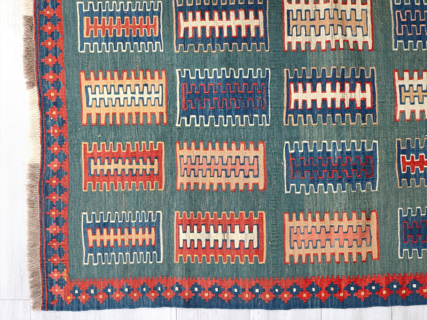 | 草木染めの色糸で織られた全体的にやさしい色合いのパステル調のピース。 ブルーグリーンのフィールドにカラフルなくしのモチーフがきれいに並ぶように描かれたデザイン。イラン南部・シーラーズを中心としたエリアで暮らす遊牧民「カシュカイ族」の織る手織りキリム。 トルコ系の言葉を話すカシュカイ族は、絨毯やキリムの文化もトルコやクルディッシュに似ていて、ユニークで色鮮やかな幾何学模様のキリムが多く織られています。 |