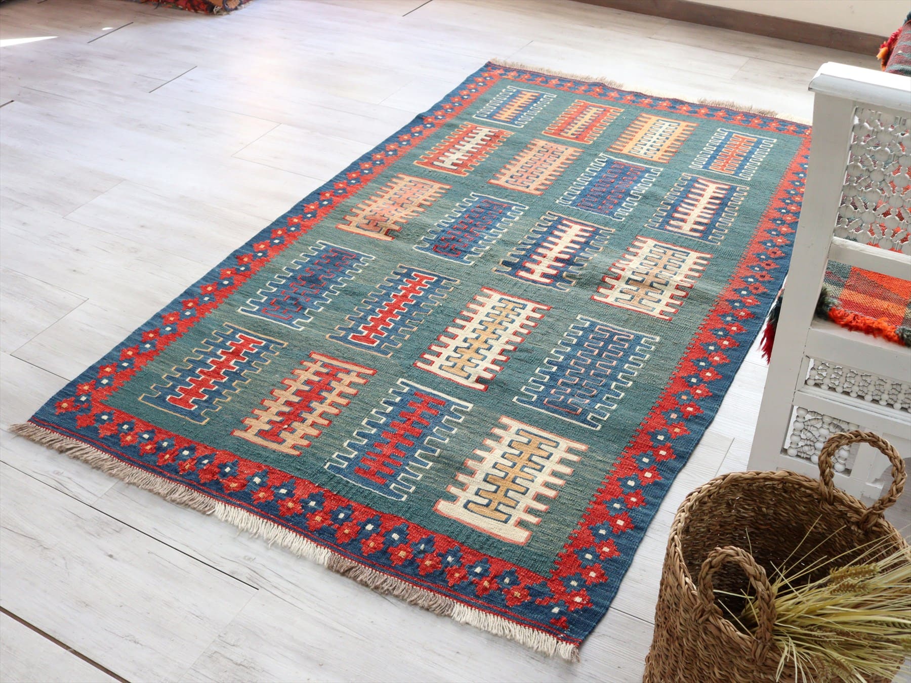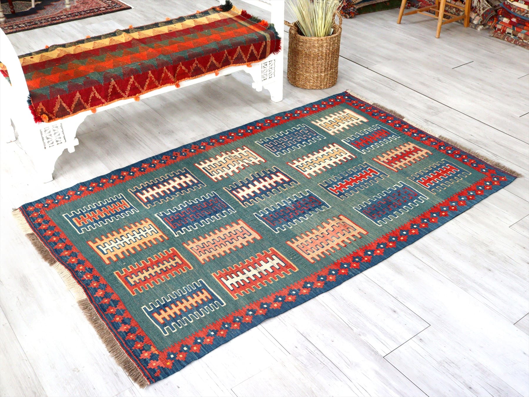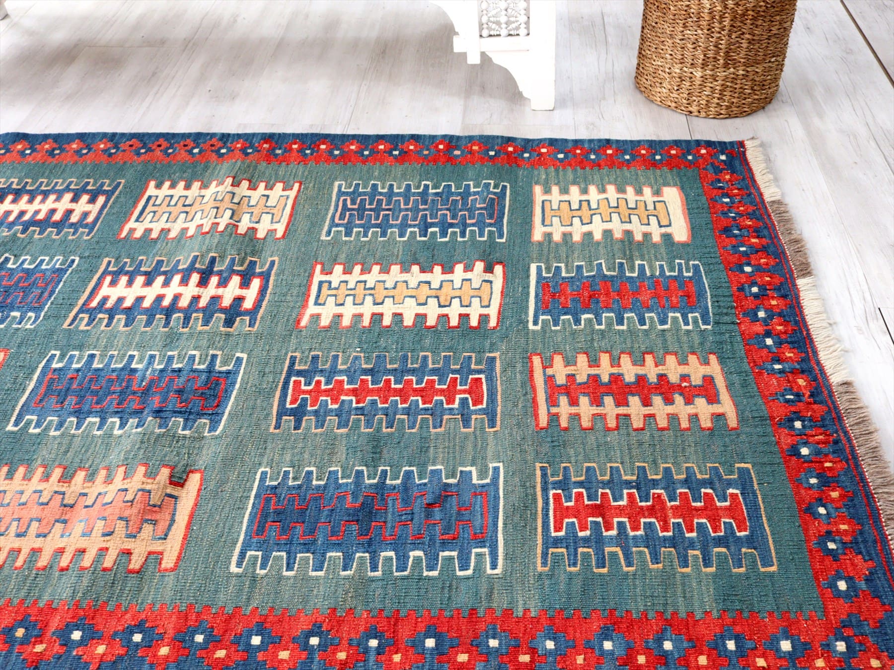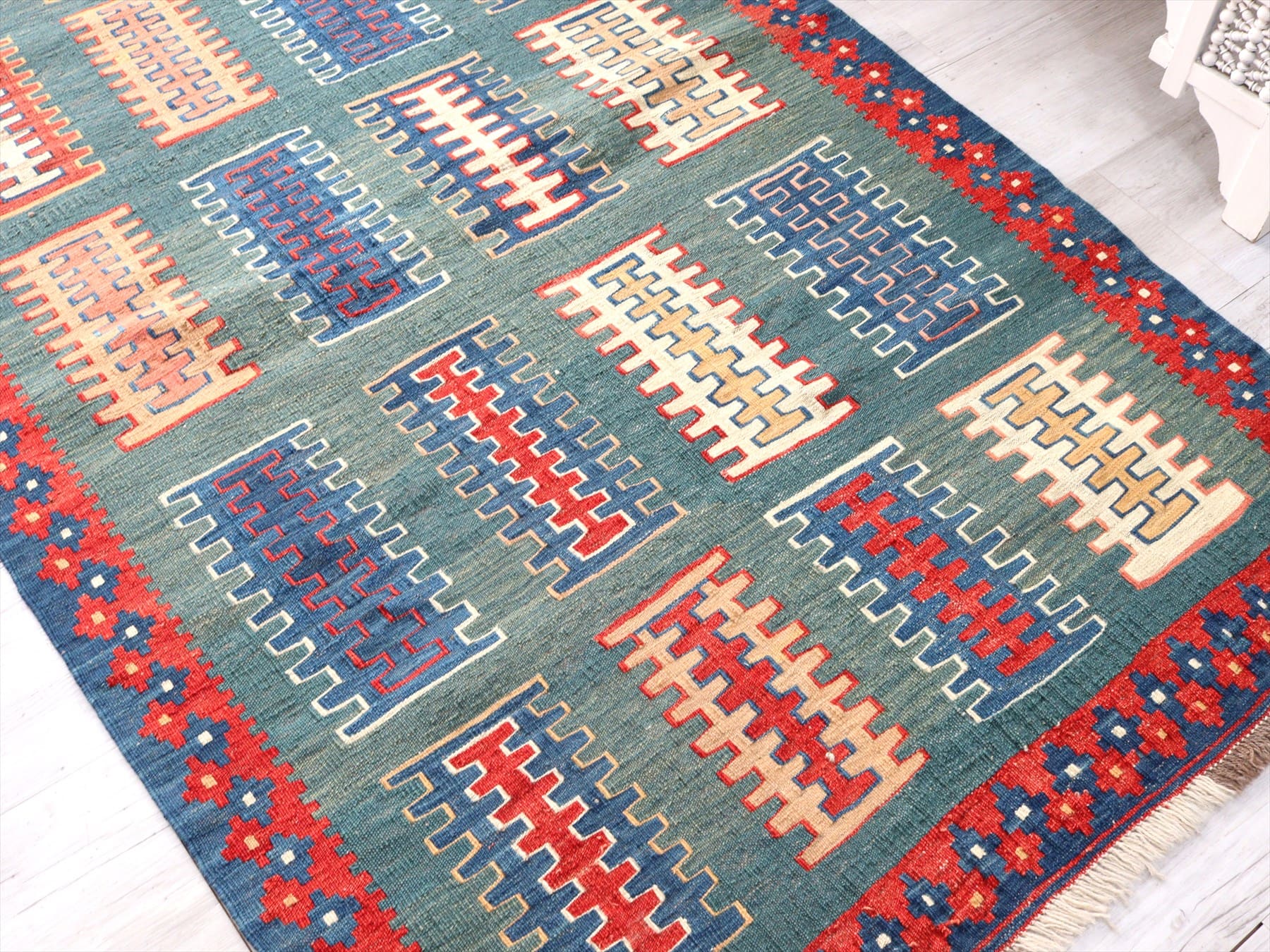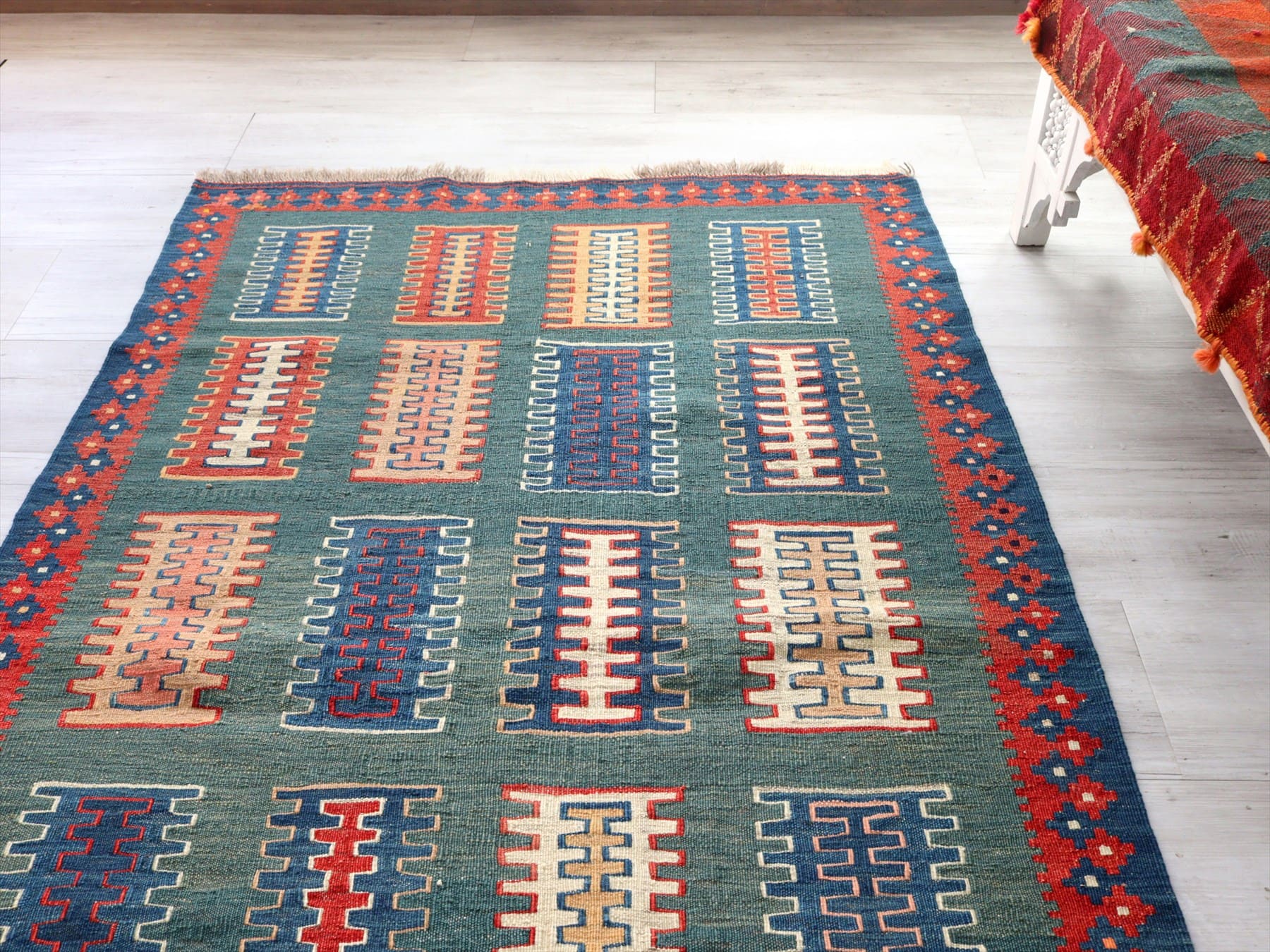 | 草木染めの色糸で織られた全体的にやさしい色合いのパステル調のピース。 ブルーグリーンのフィールドにカラフルなくしのモチーフがきれいに並ぶように描かれたデザイン。イラン南部・シーラーズを中心としたエリアで暮らす遊牧民「カシュカイ族」の織る手織りキリム。 トルコ系の言葉を話すカシュカイ族は、絨毯やキリムの文化もトルコやクルディッシュに似ていて、ユニークで色鮮やかな幾何学模様のキリムが多く織られています。 |