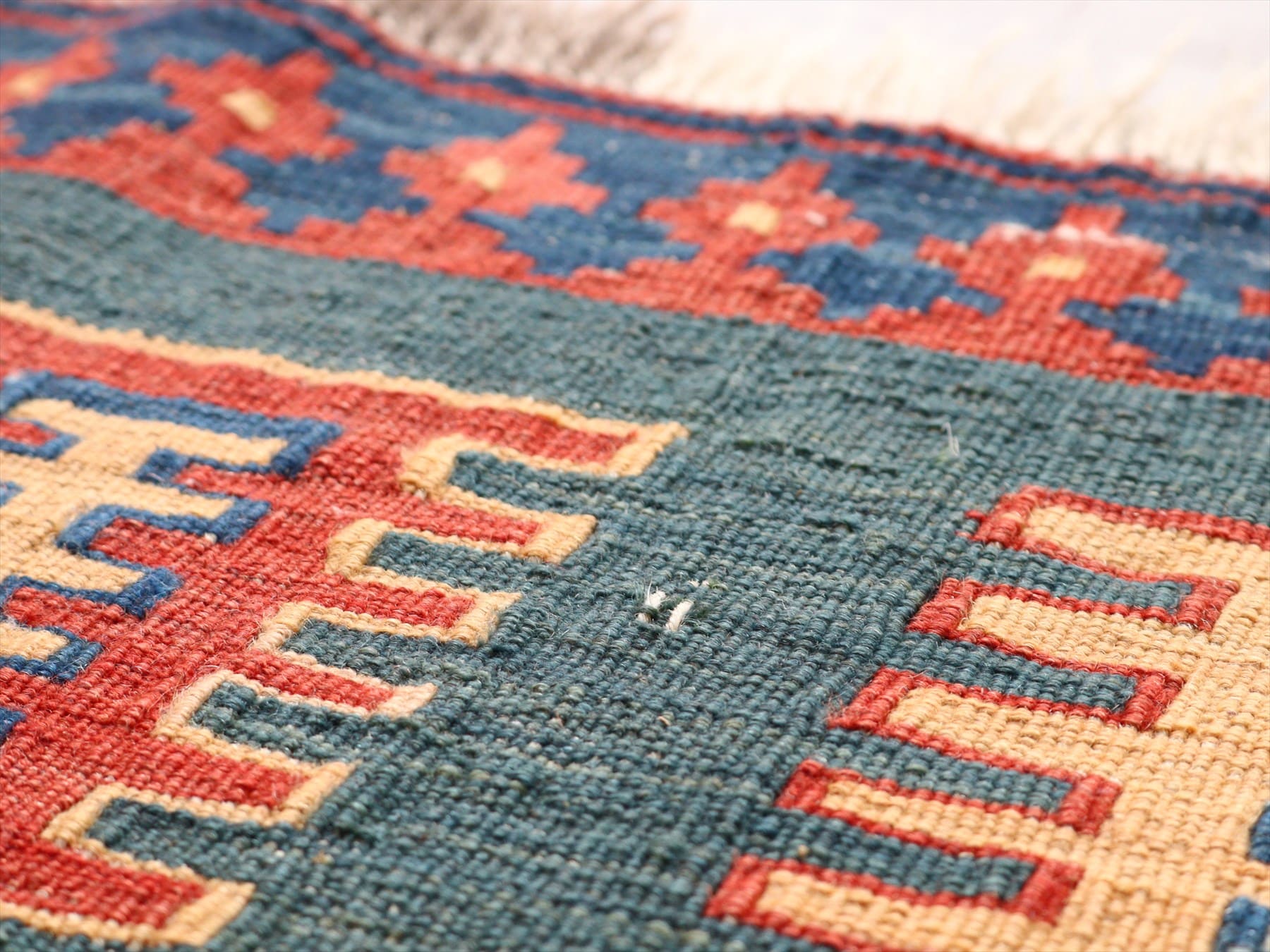 | もともと家庭向きに織られたものと思われますが、それが何年か経ち市場に出回ったようです。 わずかに縦糸が出ていますが目立たない程度です。 カシュカイ族の織るキリムは一般的にトルコキリムより厚みがありがっちりとした質感です。織り地は厚みがあり、ぎゅっと目が詰まって、固くしっかりとしています。 |