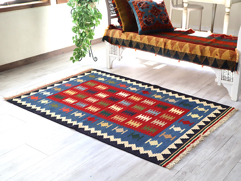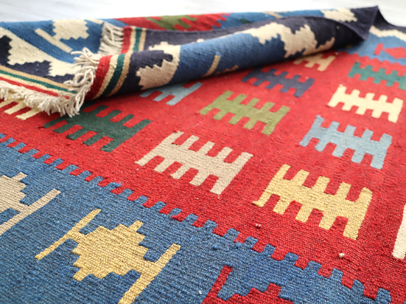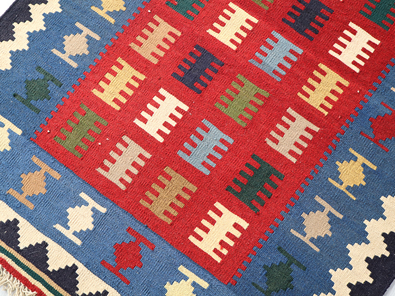 - キリム・カシュカイ族の手織りキリム152×104cm レッド&ブルー 櫛のモチーフ