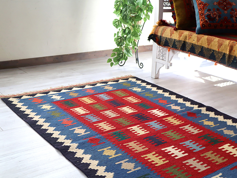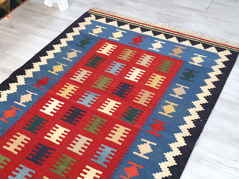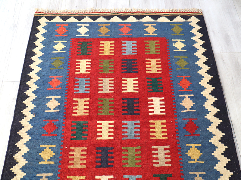 キリム・カシュカイ族の手織りキリム152×104cm レッド&ブルー 櫛のモチーフ