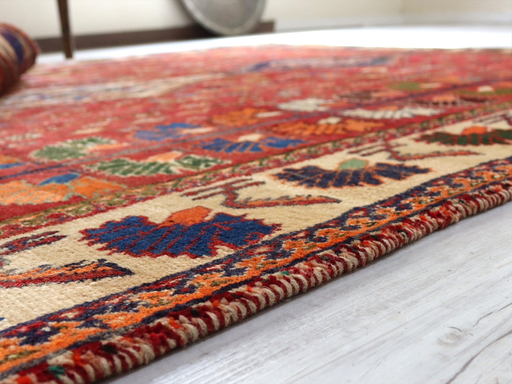 | 濃淡のあるレッドのグラデーションのフィールドにメダリオンが3つ並んだデザイン。 メダリオンの色もネイビーの濃淡で織られていて手織りらしさを感じられます。メダリオンの両側には植物からブルー、グリーン、オレンジ、ナチュラルアイボリーといった色使いで花が華やかに描かれています。その周りには鳥や草花、人も描かれていてたくさんのモチーフが詰まった1枚です。 |