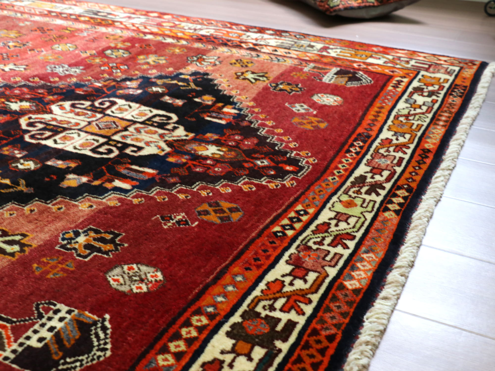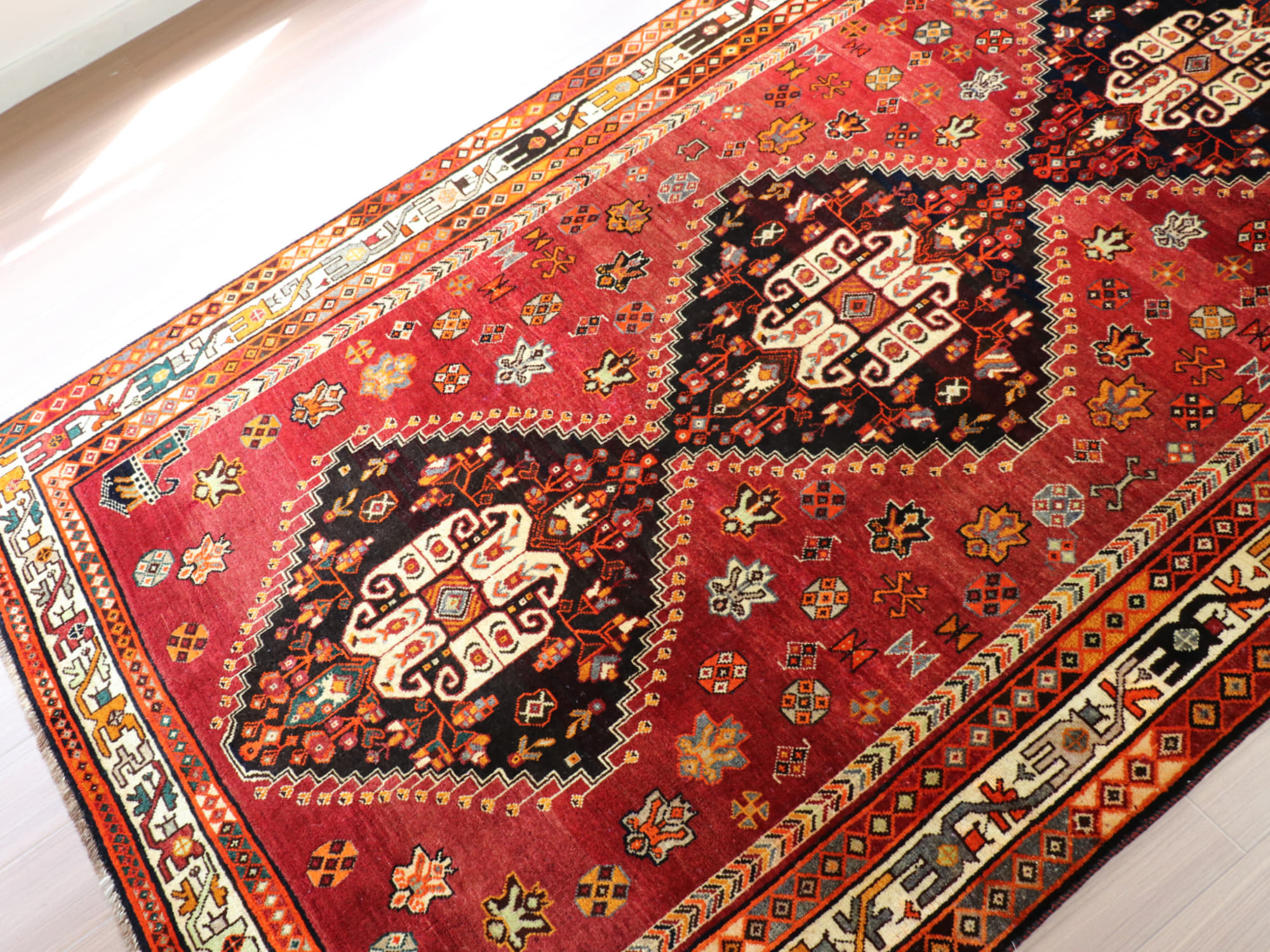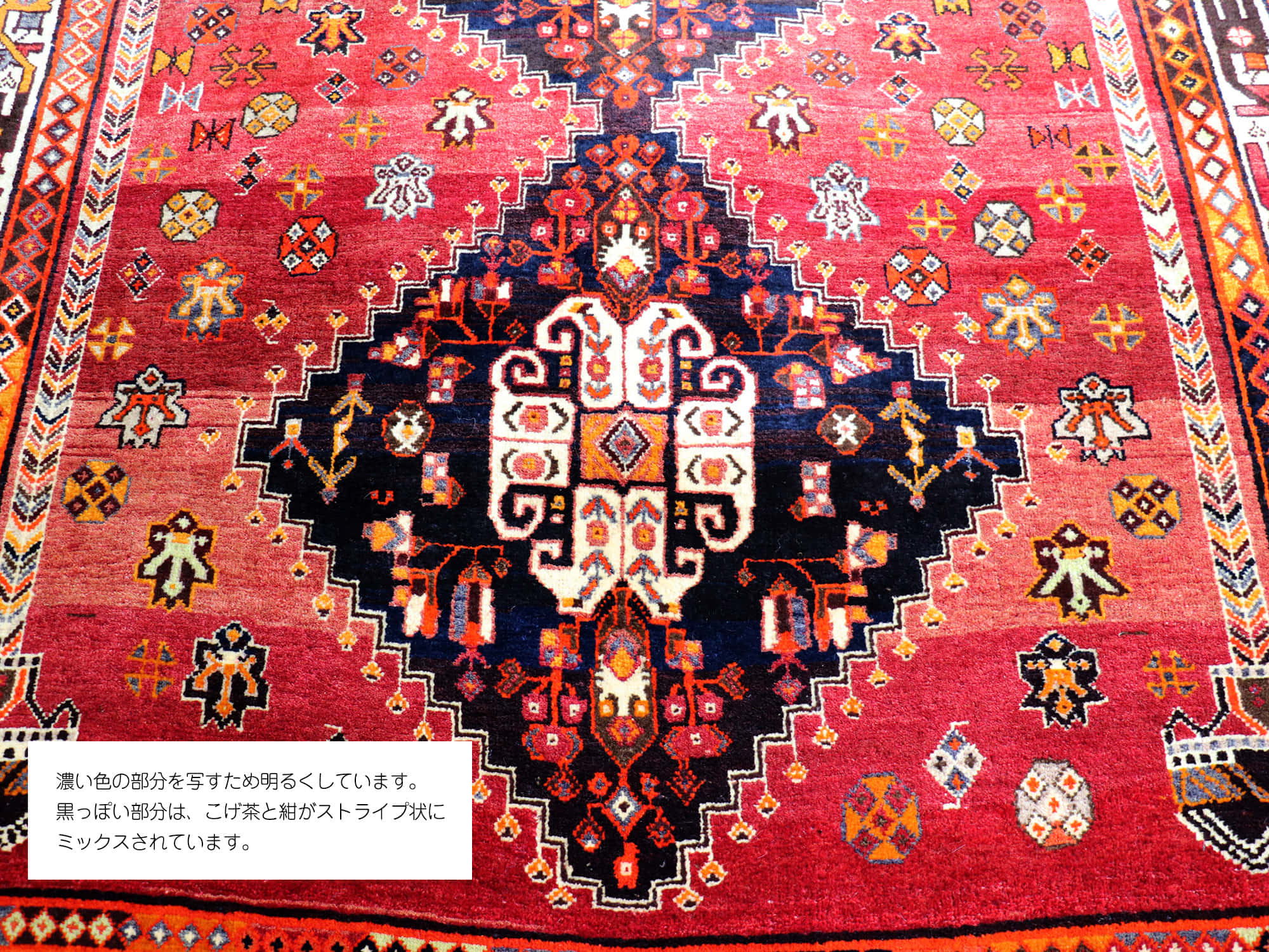 | 濃い色合いのネイビーとブラウンの色糸を使って3つのメダリオンが並んだピース。レッドのフィールドには幾何学モチーフや蝶、小花のようなものが描かれています。縁取りは人が手をつないでいるように見えるユニークなデザインです。 ギャベを織ることで知られるカシュカイ族。カシュカイ族は比較的大きな部族で、いくつものグループに分かれて広いエリアを遊牧しているのですが、同じ部族だけあって織られる絨毯のデザインは似ているものが多いのです。六角形のメダリオンデザインは、カシュカイカーペットの中でもっともポピュラーなパターンでサファビー王朝時代に数多く織られています。 |