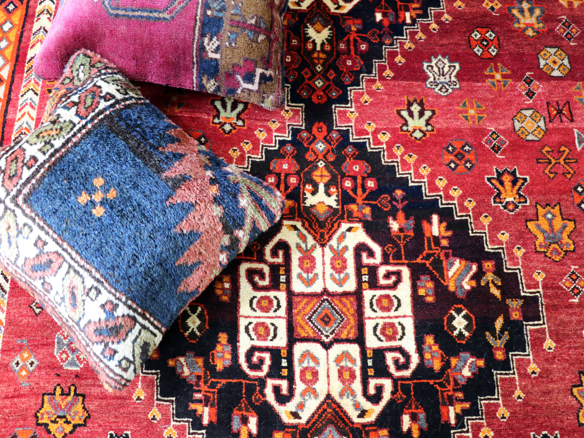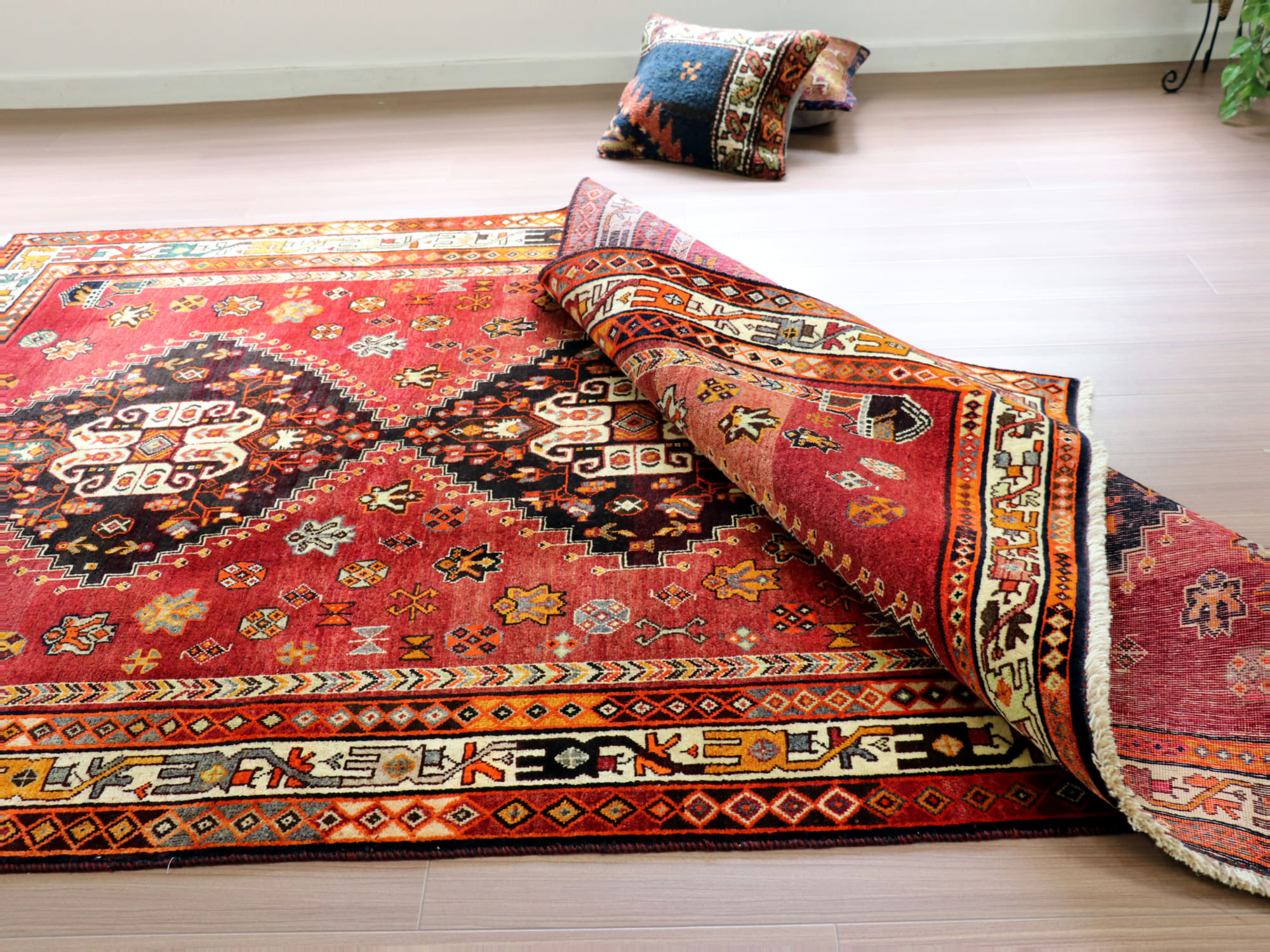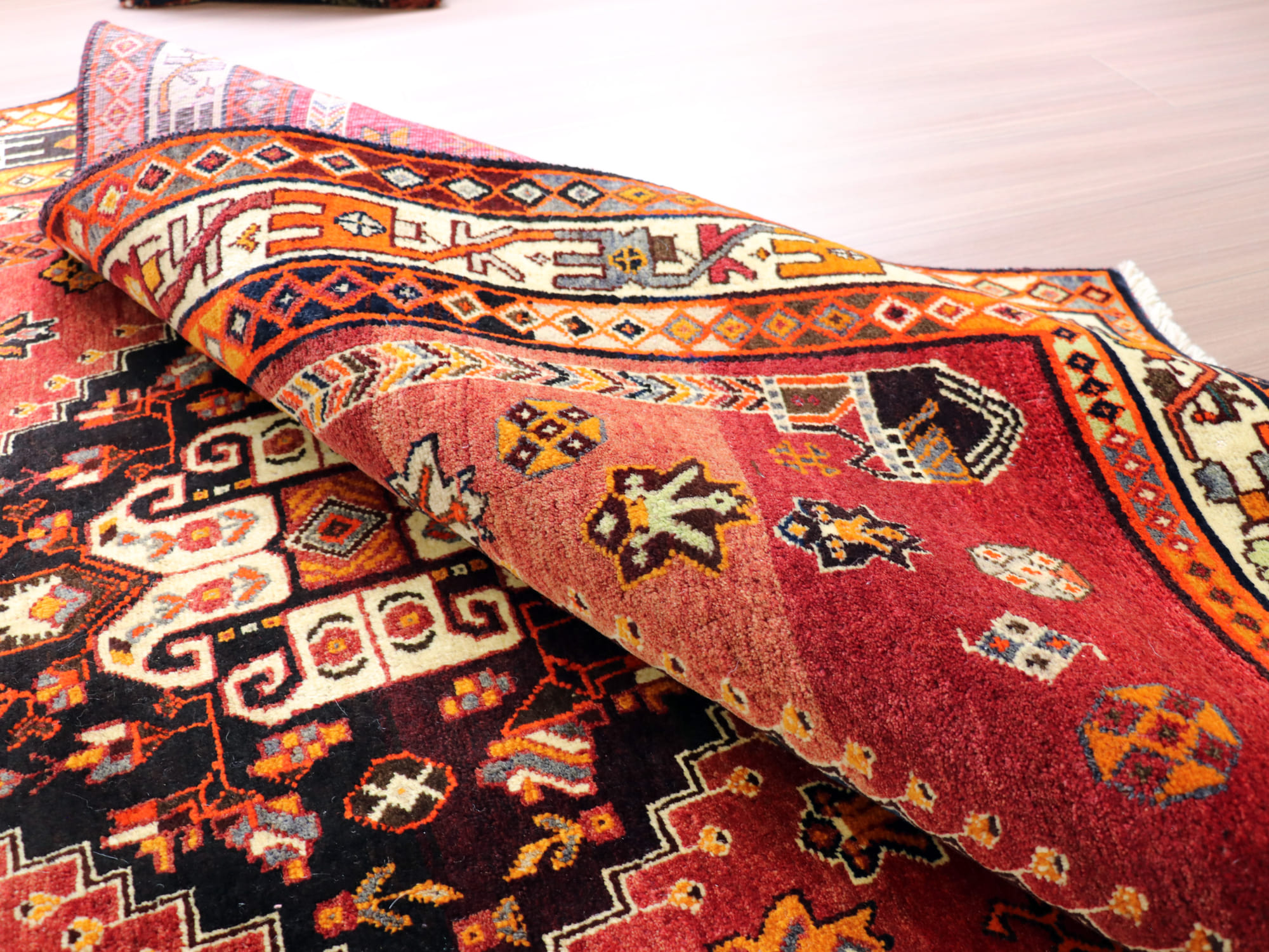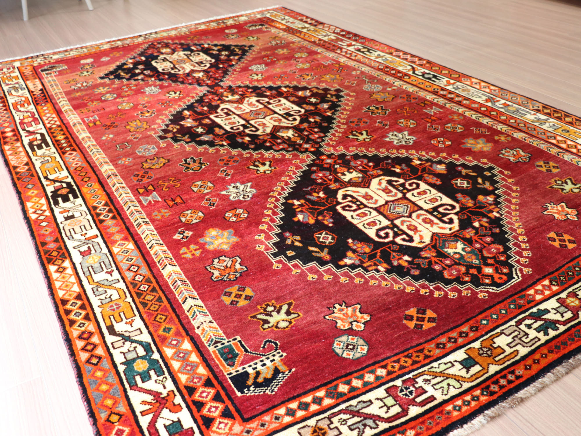 | 濃い色合いのネイビーとブラウンの色糸を使って3つのメダリオンが並んだピース。レッドのフィールドには幾何学モチーフや蝶、小花のようなものが描かれています。縁取りは人が手をつないでいるように見えるユニークなデザインです。 ギャベを織ることで知られるカシュカイ族。カシュカイ族は比較的大きな部族で、いくつものグループに分かれて広いエリアを遊牧しているのですが、同じ部族だけあって織られる絨毯のデザインは似ているものが多いのです。六角形のメダリオンデザインは、カシュカイカーペットの中でもっともポピュラーなパターンでサファビー王朝時代に数多く織られています。 |
