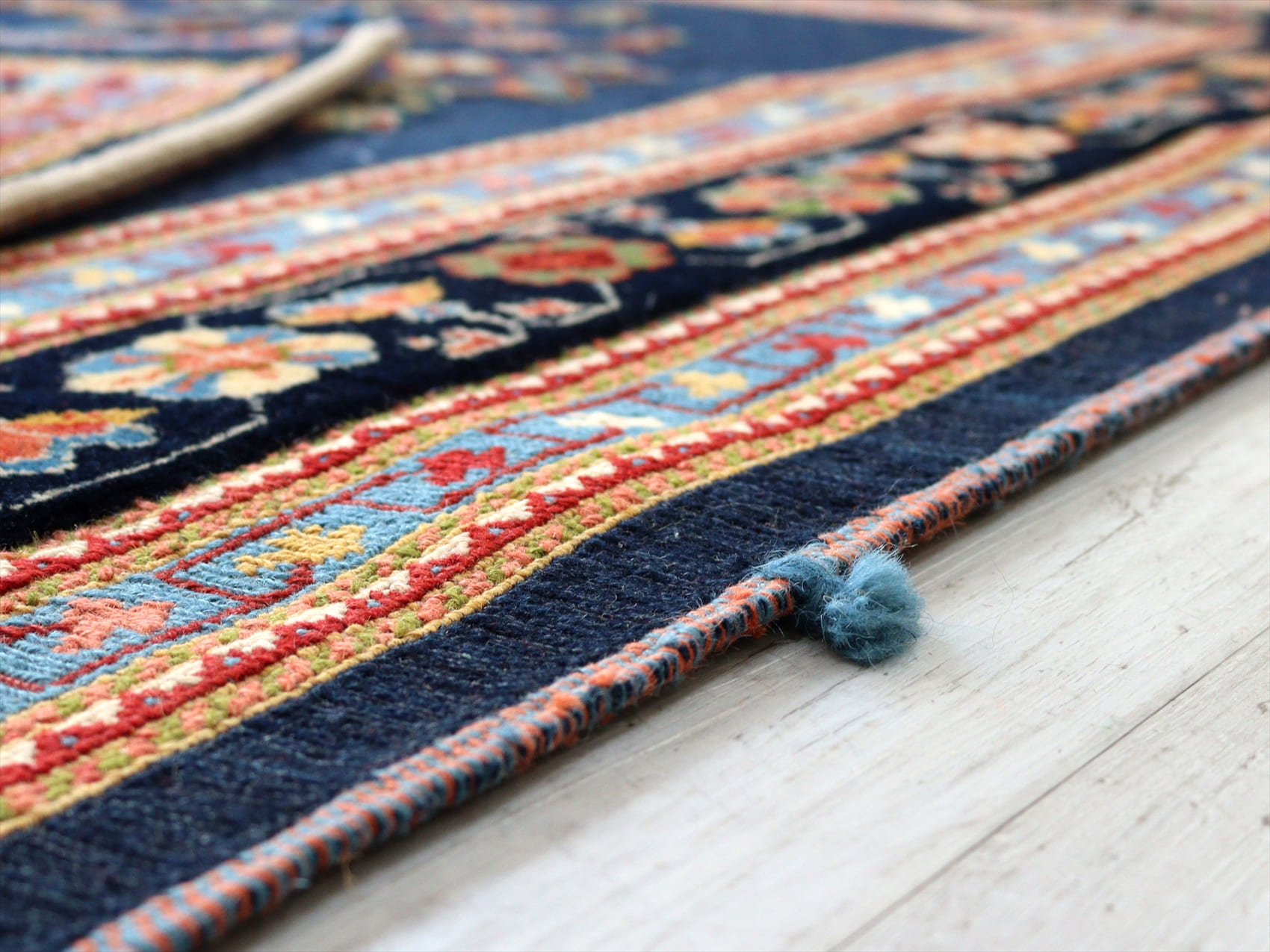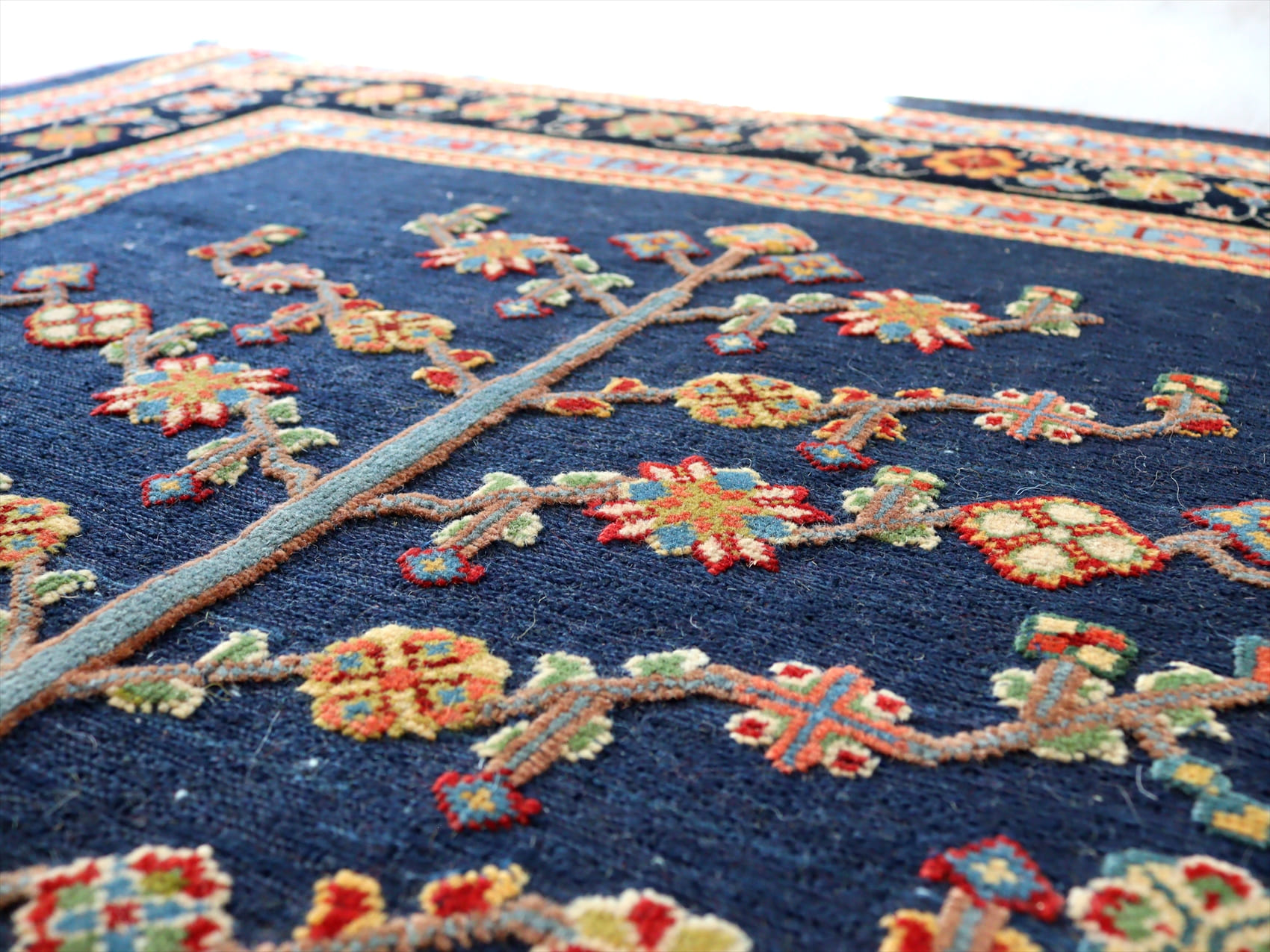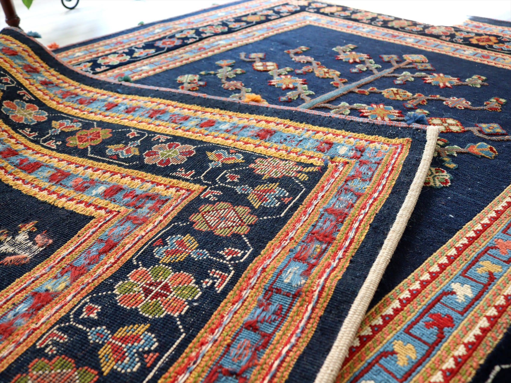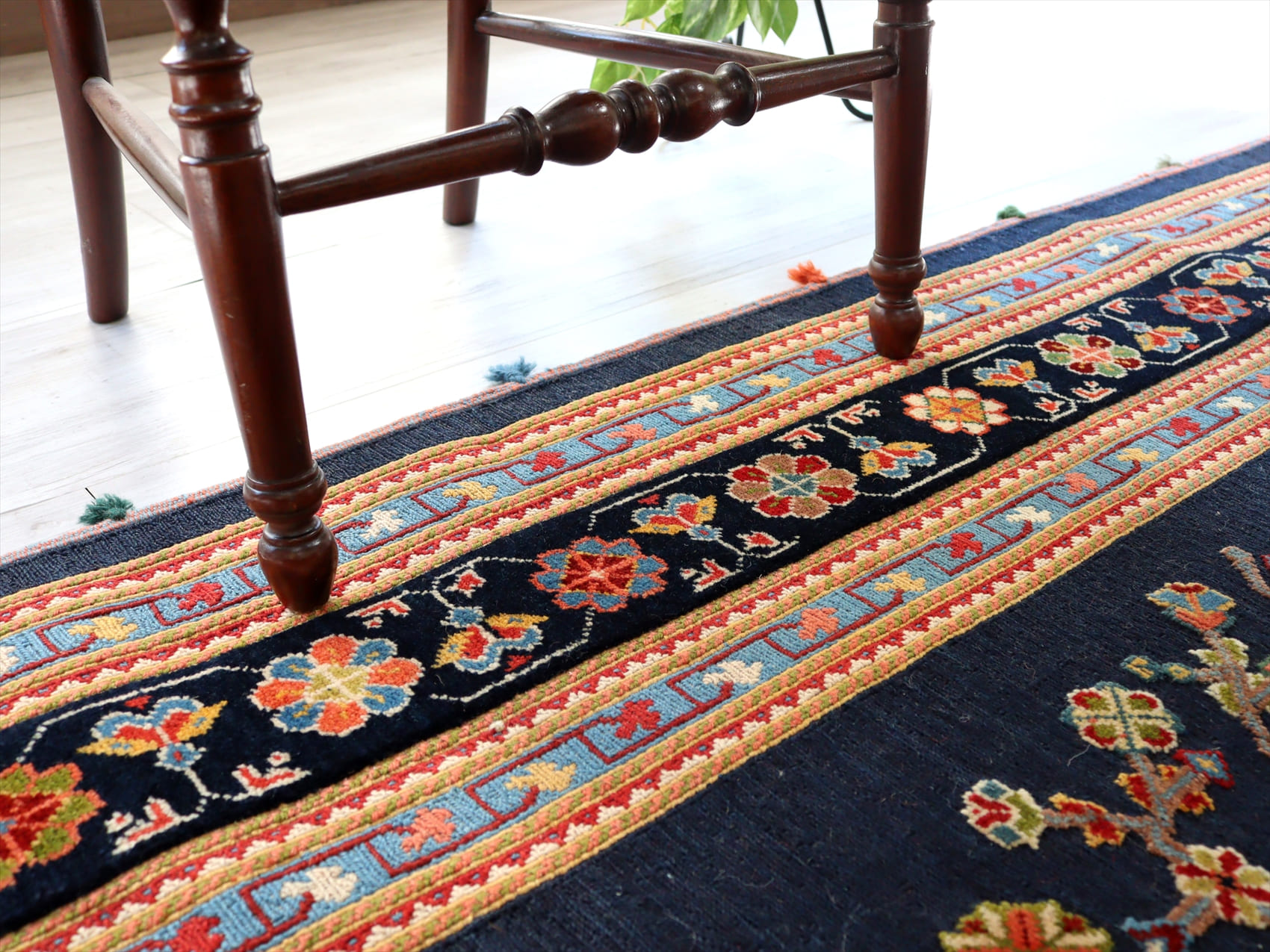 | ネイビーのフィールドにどっしりとカラフルな花がレリーフで彩られたデザイン。根元の部分には小花が咲いています。生命の樹をを囲う花が描かれたネイビーのフィールドもパイルのある織りになっていてやさしい雰囲気です。 刺繍のような織り地のスマックをベースに立体感のあるカーペット織りでモチーフをレリーフのように織り込んだ、職人技とも言える緻密な織りの一枚。ゾランヴァリ社の製品は、全てが手紡ぎ・草木染の最高級クオリティの逸品です。 |