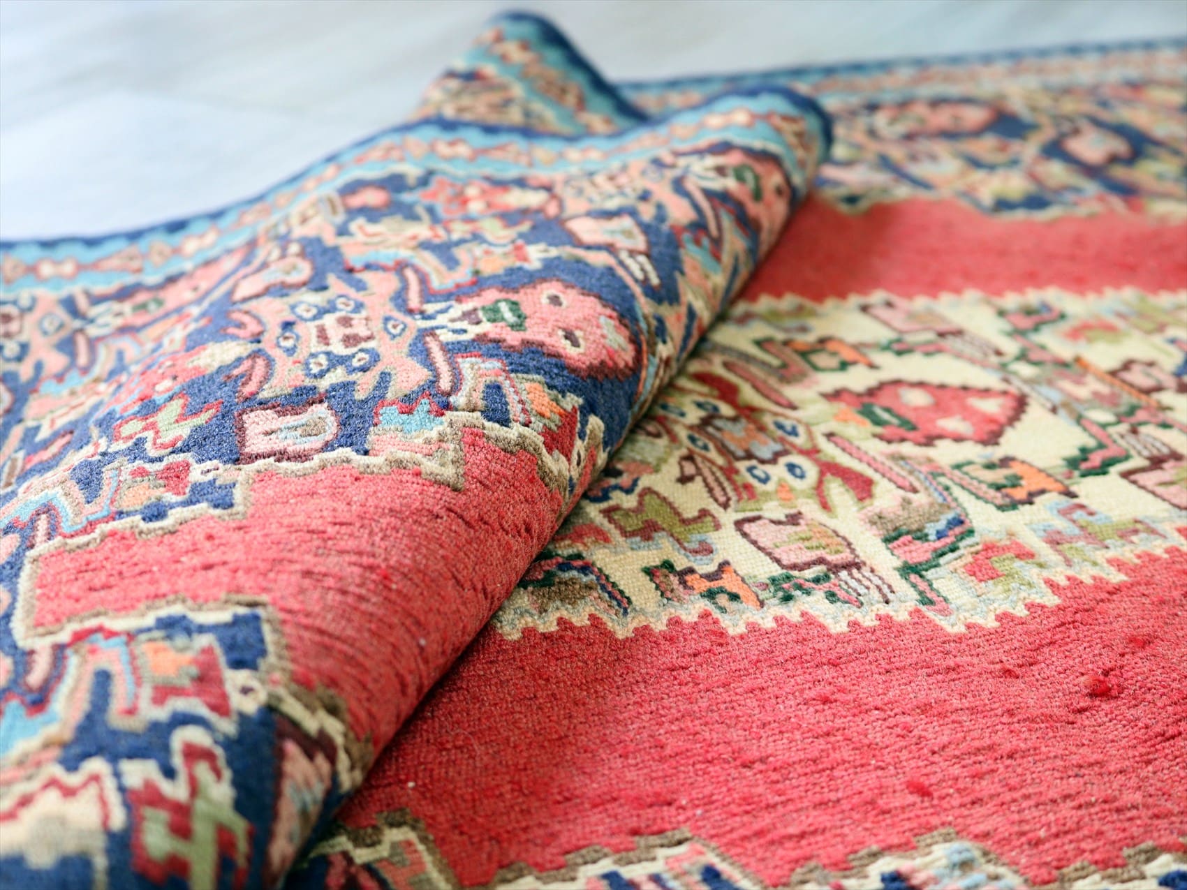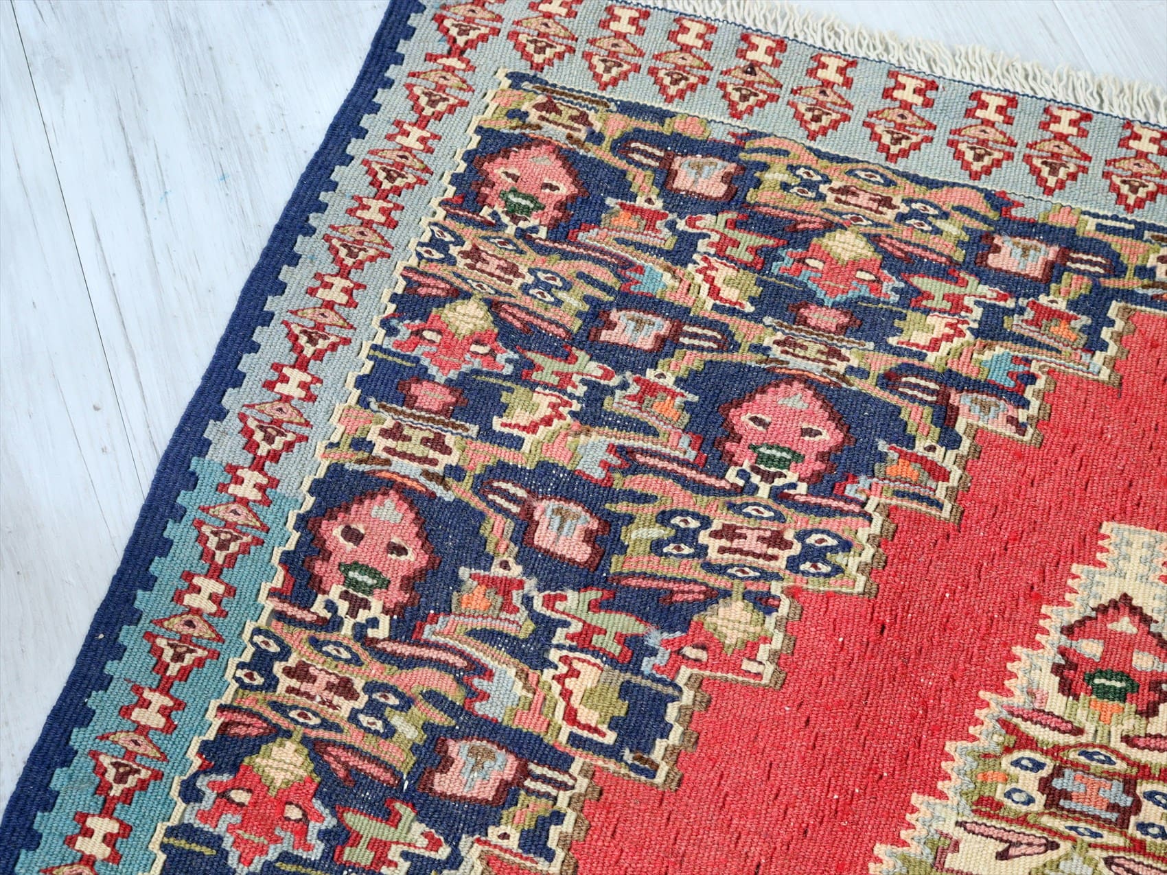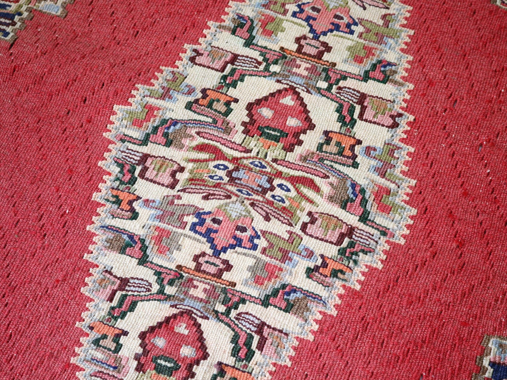 | 目がぎゅっと詰まって、しっかりとした厚みのあるキリム。(7mm前後の厚み)輸出向けに織られたキリムが数年経って出てきたもので、きれいな状態です。 |