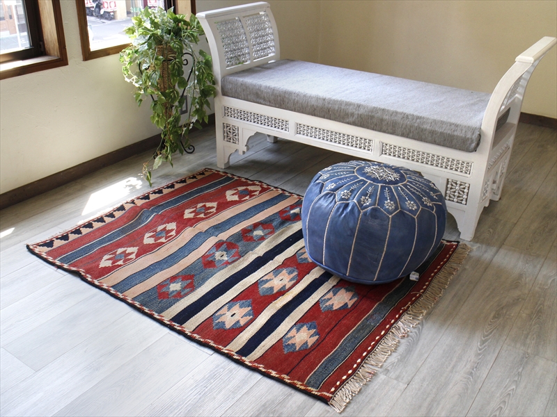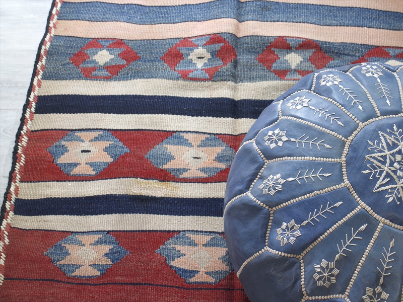 | イランの西部、トルコとの国境に近いエリアのキリムです。サイズはオリジナルではなく、長細いキリムからカットされたピース。ストライプの幅がずいぶんゆがんでいておおらかな感じがします。がっしりとした織り地で厚手です。 |
