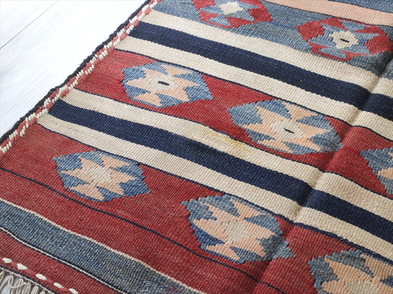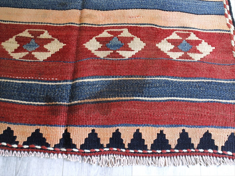 | 数か所に小さな修理があるほか、アイボリー色の部分には、使われていた時の名残で、わずかに黒ずんだ汚れが見られます。キリムの織りは厚みがあります。大型のキリムからカットされたピースで、サイズはオリジナルではありません。 |