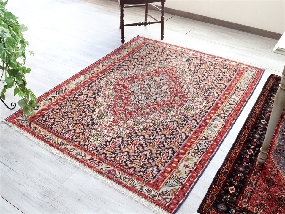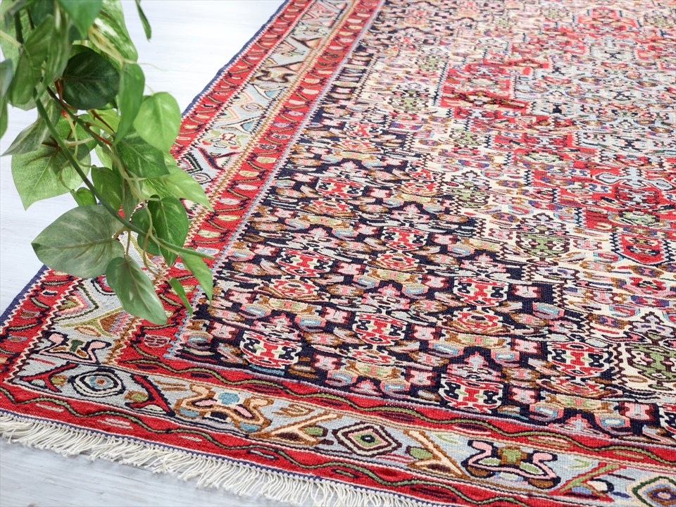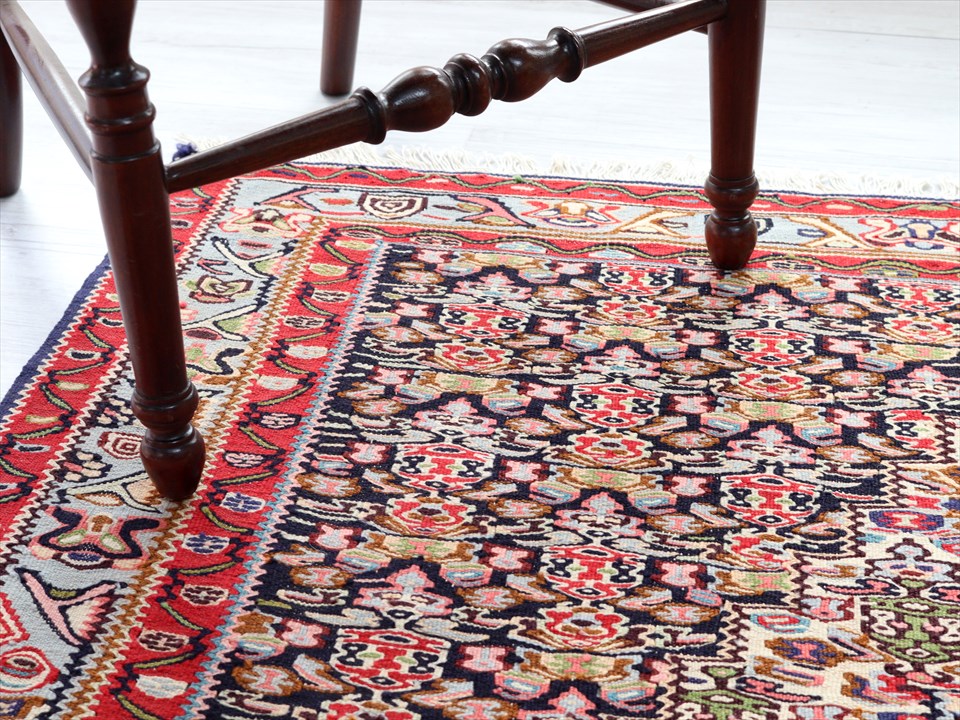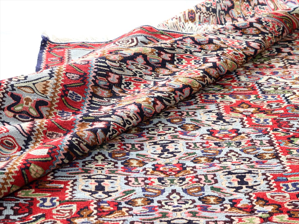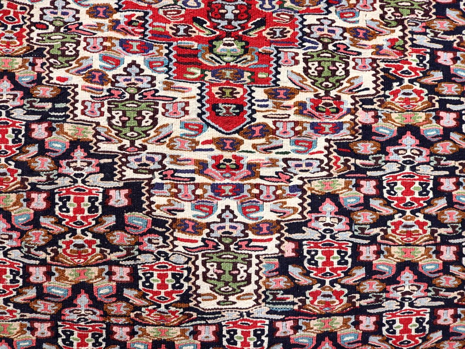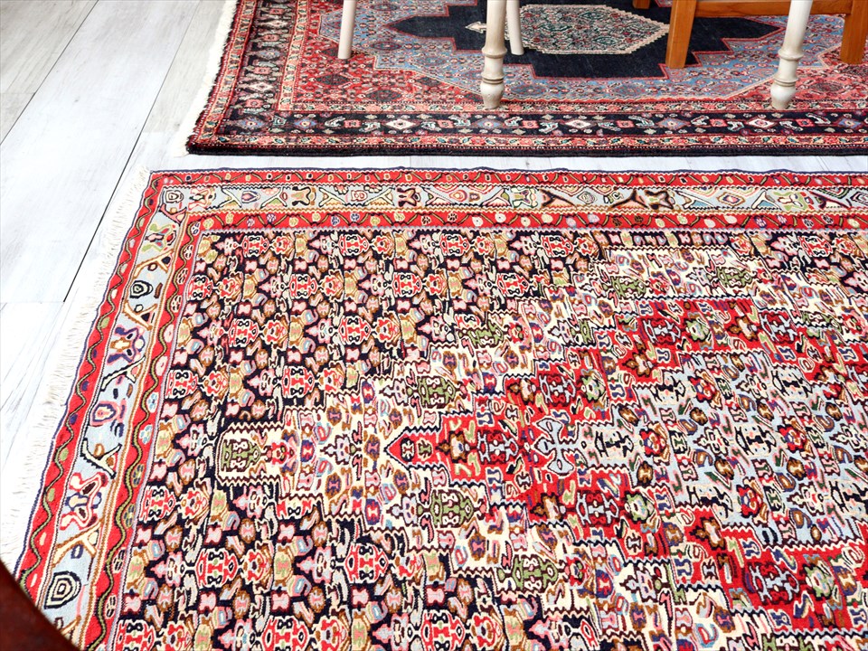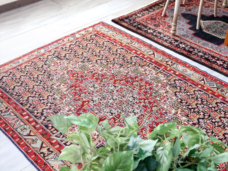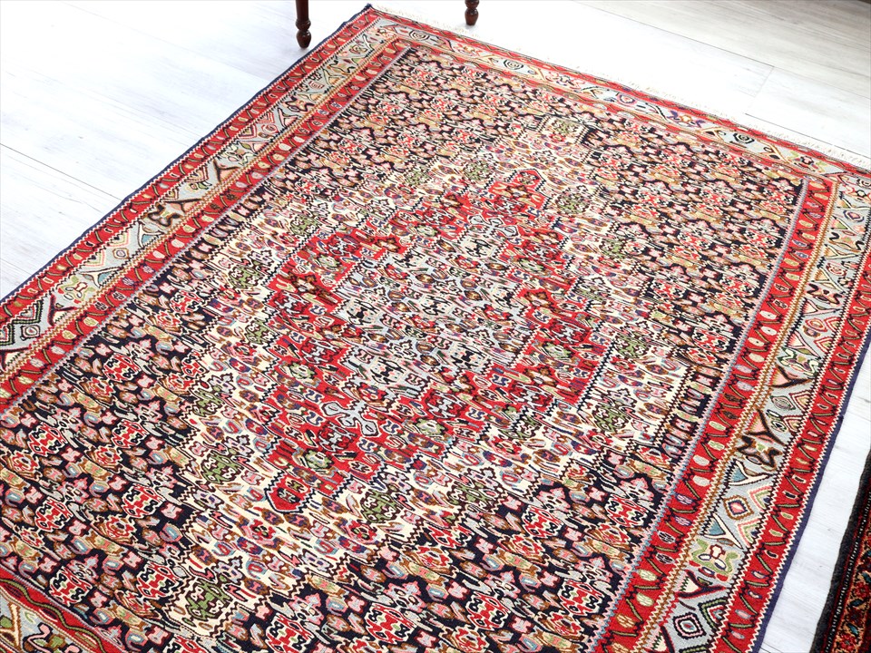 | イラン南西部、トルコとの国境に近いセネという町の特徴あるキリム。 この地域は、カシュカイ族やクルド族など、ワイルドな織りのキリムが多いのですが、セネだけは趣が違っています。サファビー王朝が好んで使ったという六角形のメダリオンに、ペルシャじゅうたんにも描かれているようなモチーフが織られており、およそ遊牧民のキリムとは違ったデザインになっているのです。(といっても、技術的には、平織りのキリムなのです) |