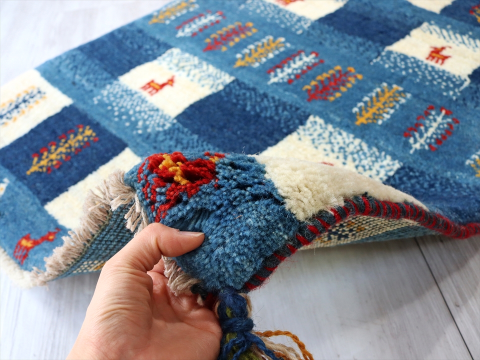 | 厚みが3cm以上あるふかふかな織りで、持ってみるとずっしりとした重さがあります。4隅に大きなポンポン飾りがついた、伝統的なスタイルのギャッベです。 ギャッベの中で最もベーシックな織りのクラス。カシュカイ族の人々が遊牧生活する中で目にするシカやヒツジなどの動物や、健康長寿の願いが込められた生命の樹などの定番なモチーフが織り込まれています。 |