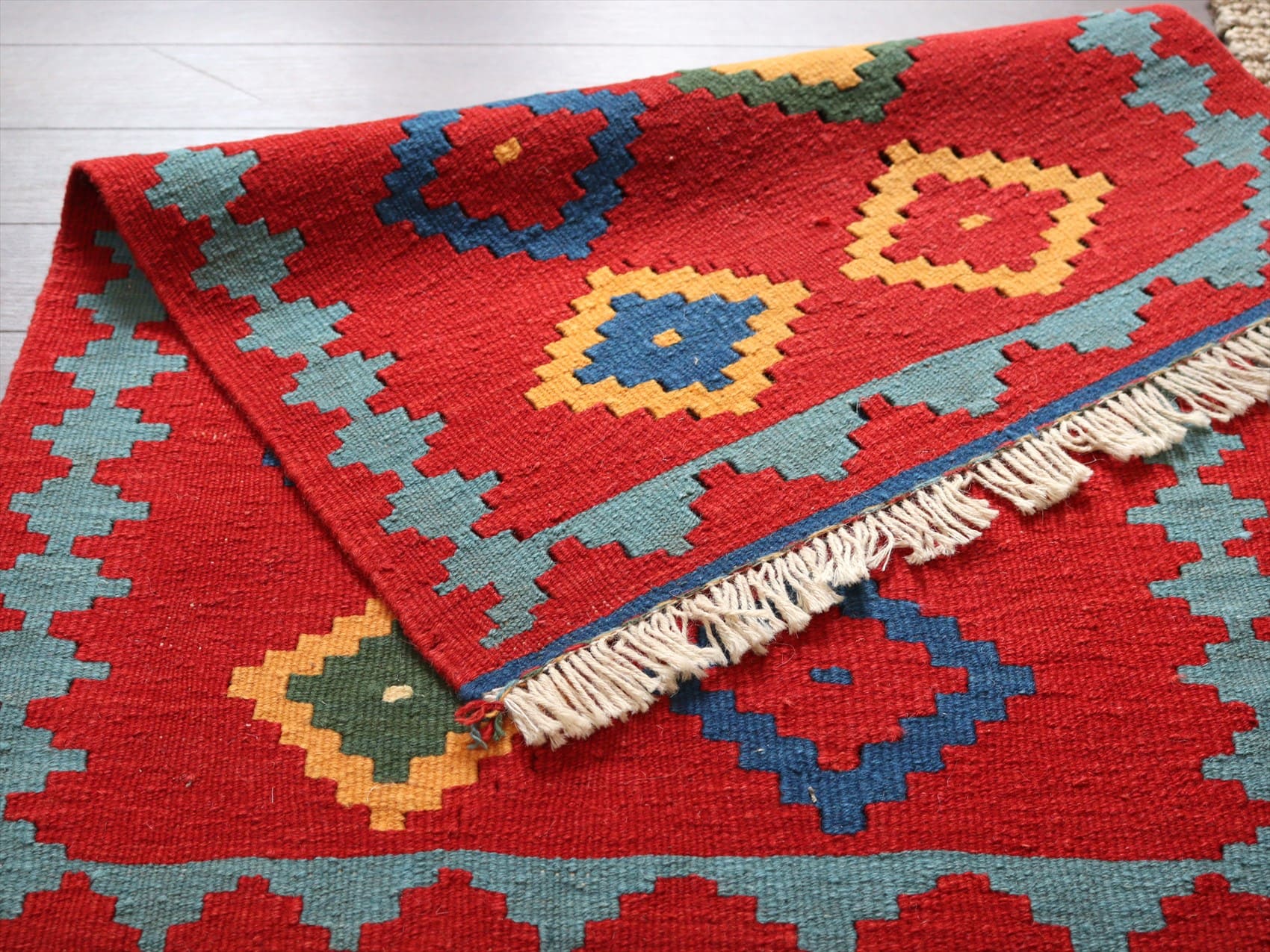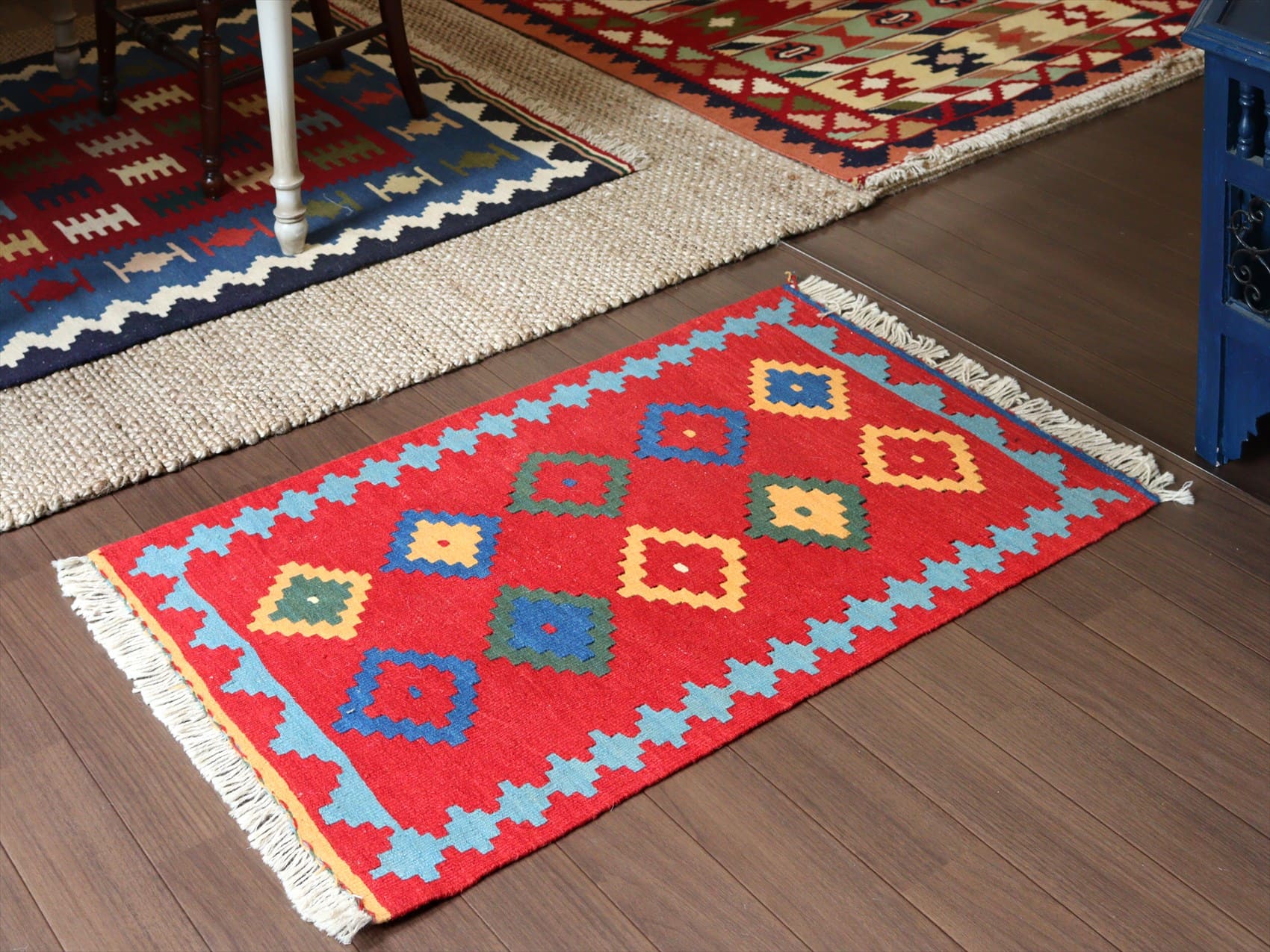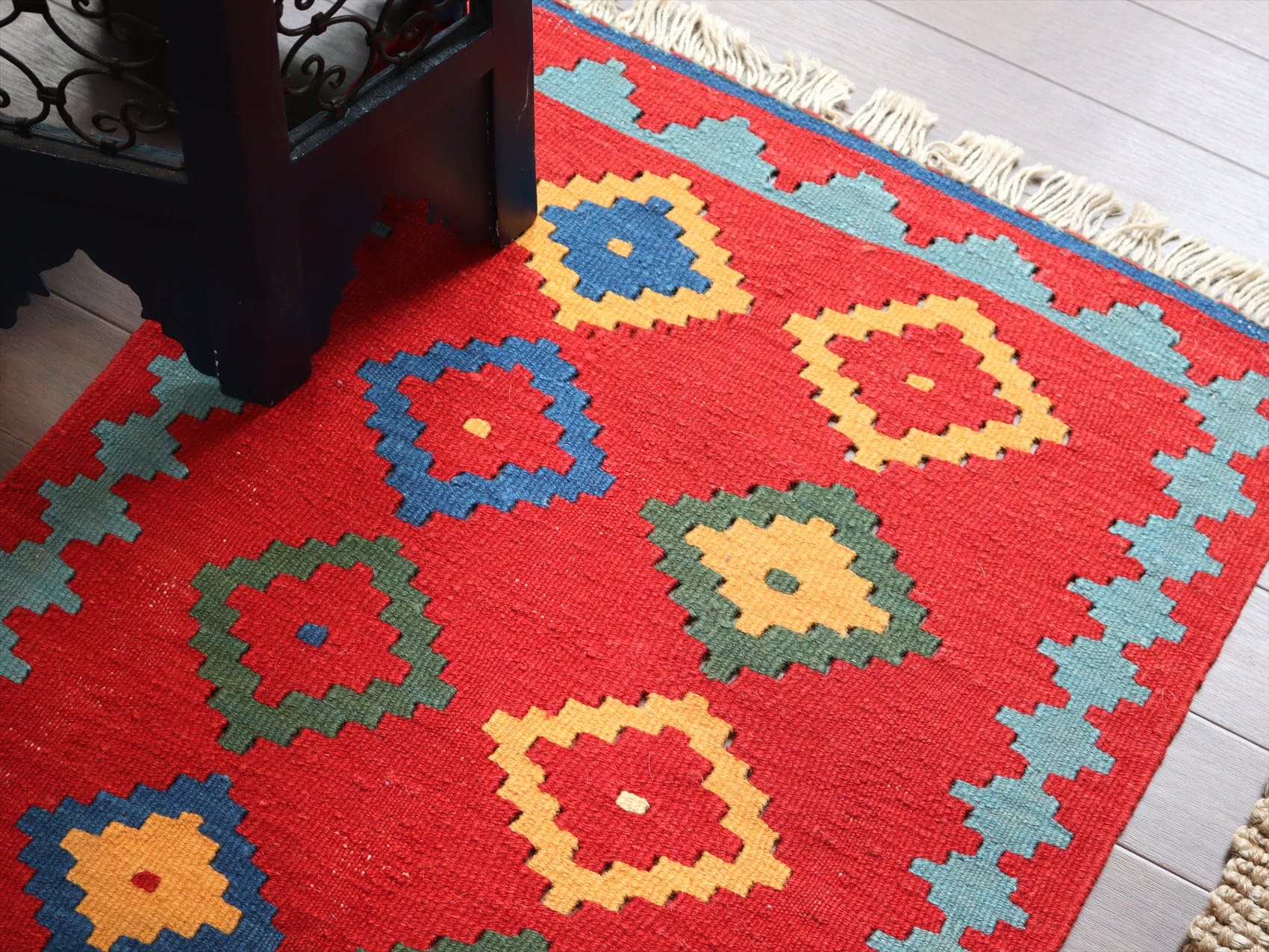 イラン手織りキリム カシュカイキリム93×61cm 玄関マットサイズ レッド/ブルー