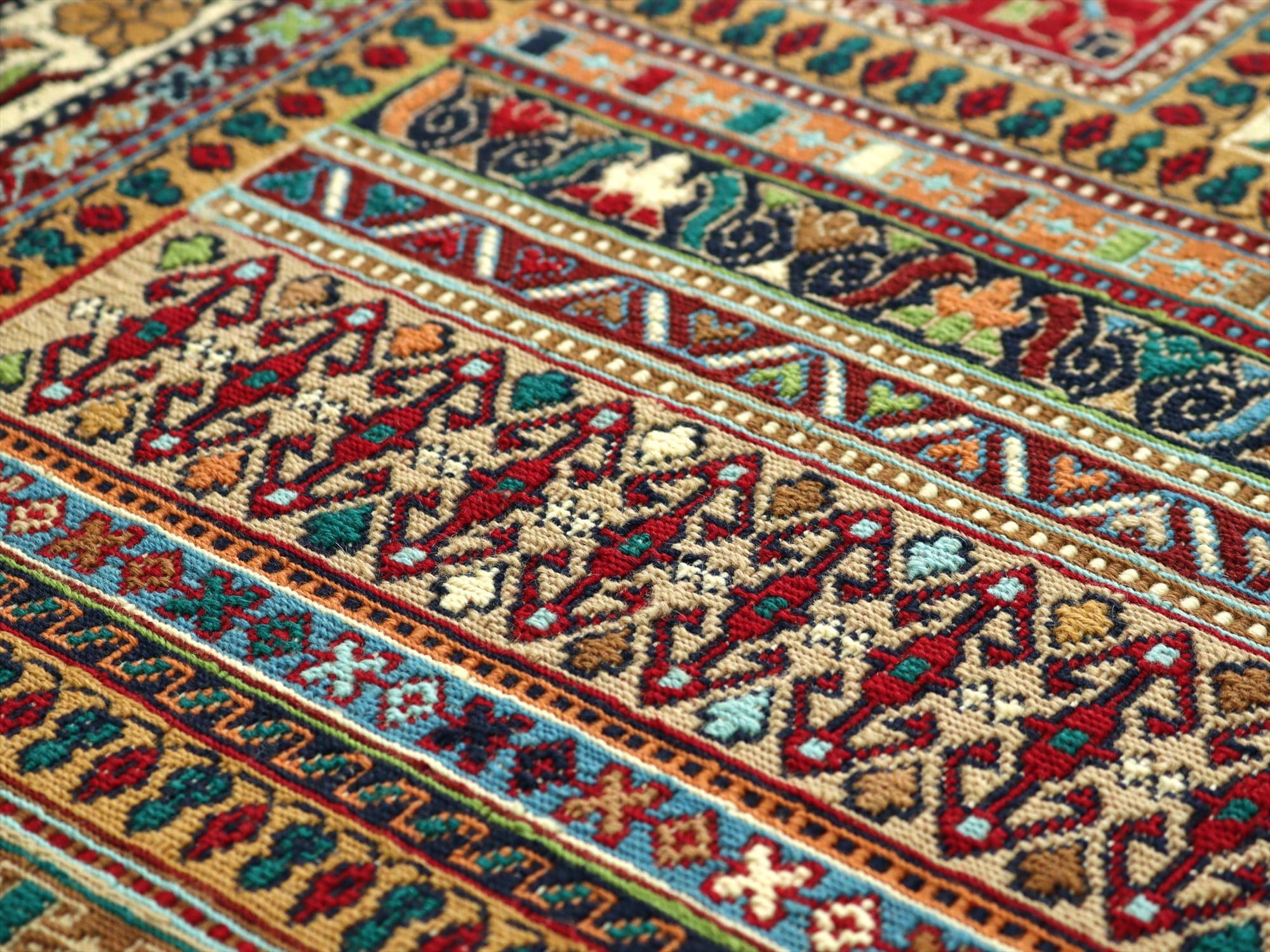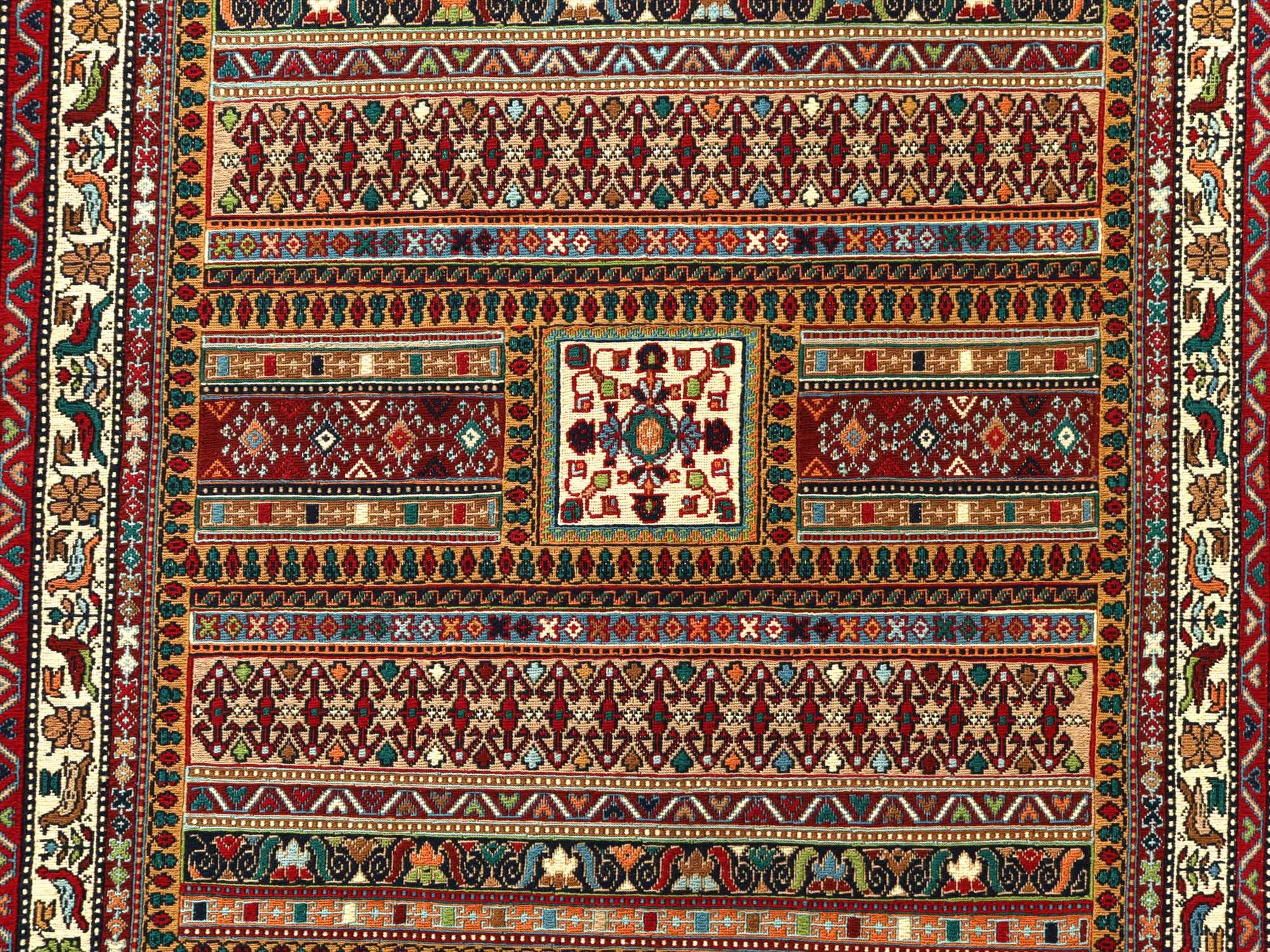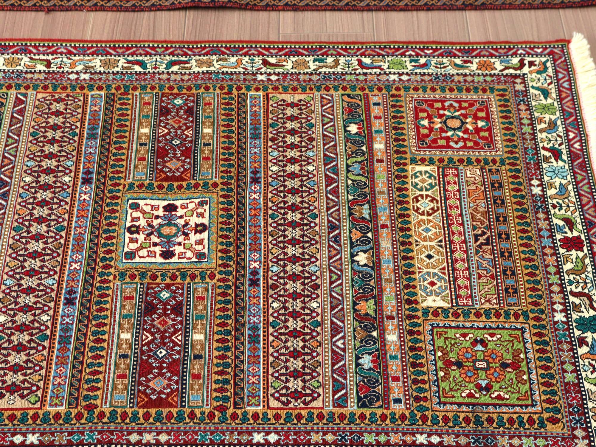 | 細かな織りのスマックです。落ち着いた色合いで渋め。 「ラフラ」とはボーダー模様に細かなモチーフを織り込んでゆくスタイルのデザインのことを指し、現在ではイラン南部シルジャン地方の最も得意とするキリム織りのひとつとなっています。 表面は刺繍のように見えますが、これは後から刺したものではなく、キリムを織るときに、縦糸と横糸のほかにもう一本飾り糸を前後しながら絡めて織ってゆくスマックという技法です。 |