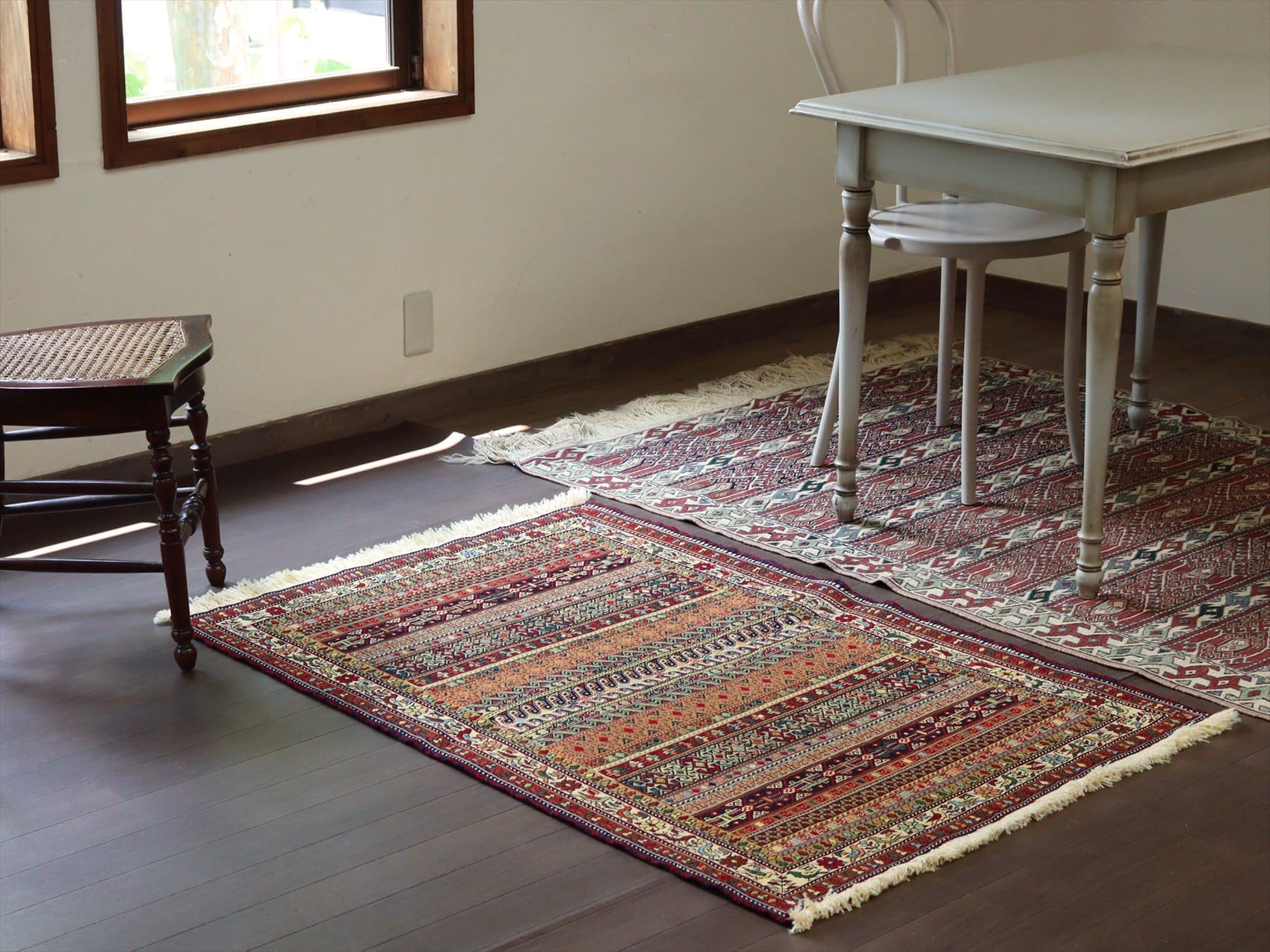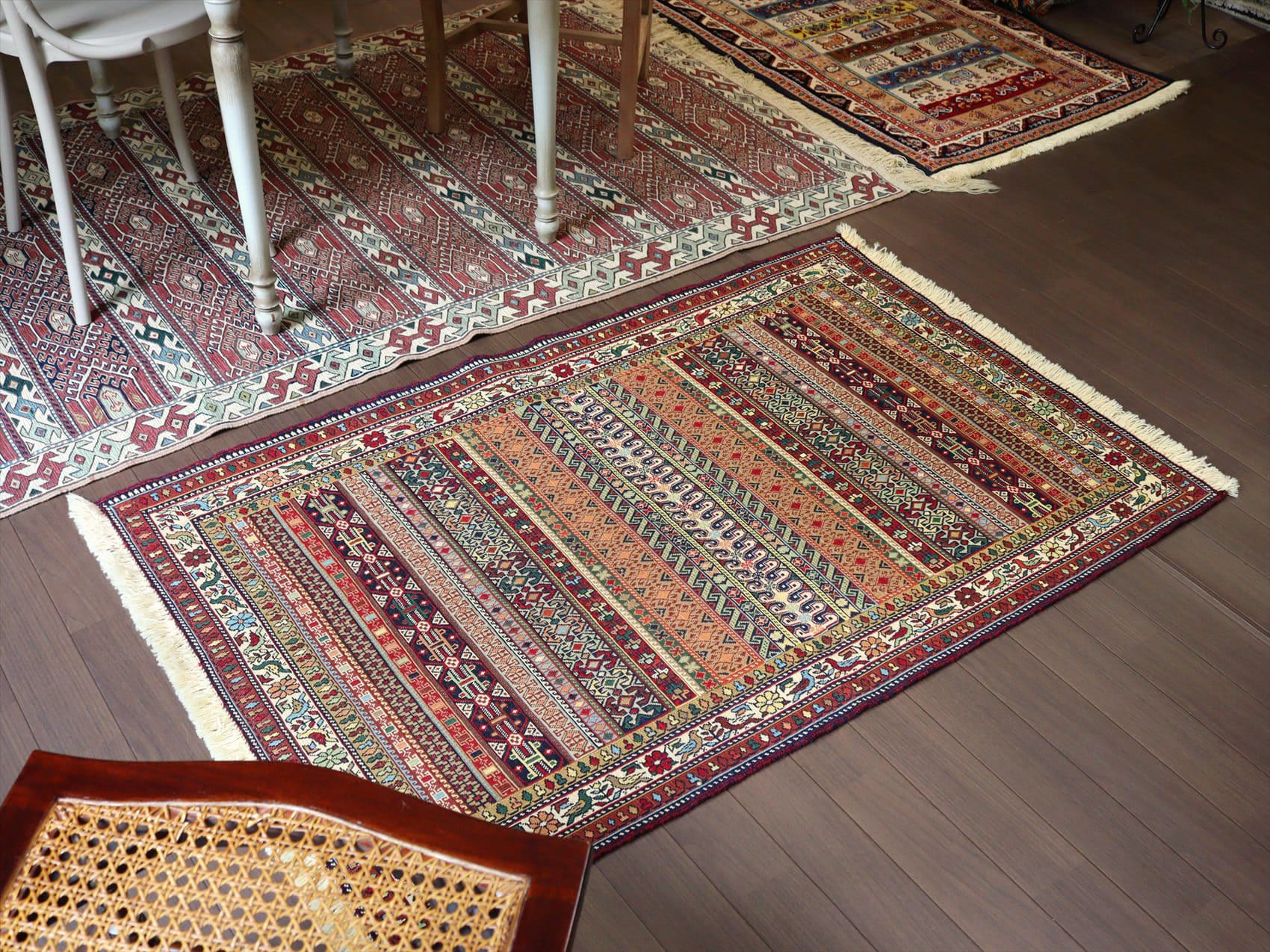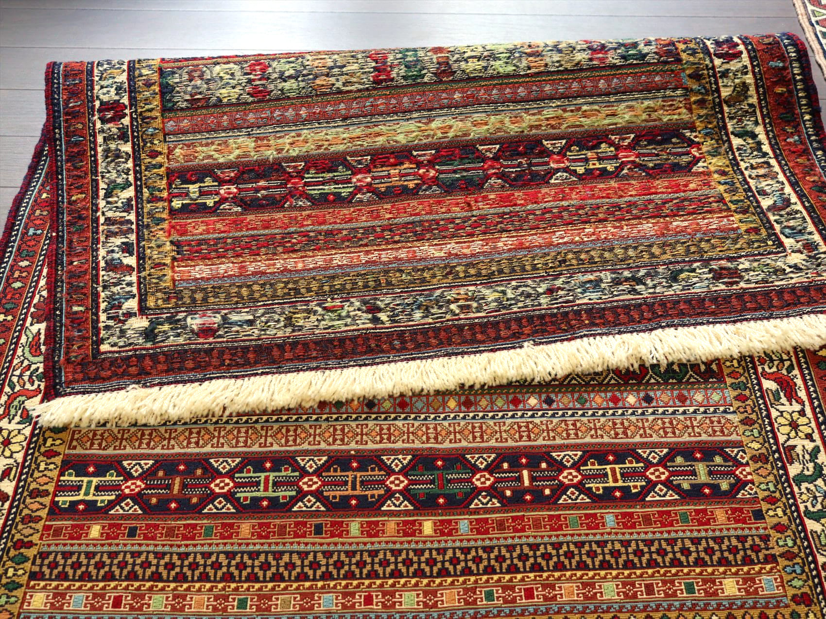 | 細かな織りのスマックです。落ち着いた色合いで渋め。 「ラフラ」とはボーダー模様に細かなモチーフを織り込んでゆくスタイルのデザインのことを指し、現在ではイラン南部シルジャン地方の最も得意とするキリム織りのひとつとなっています。 表面は刺繍のように見えますが、これは後から刺したものではなく、キリムを織るときに、縦糸と横糸のほかにもう一本飾り糸を前後しながら絡めて織ってゆくスマックという技法です。 |