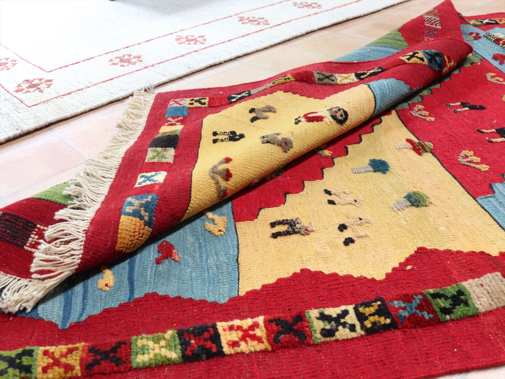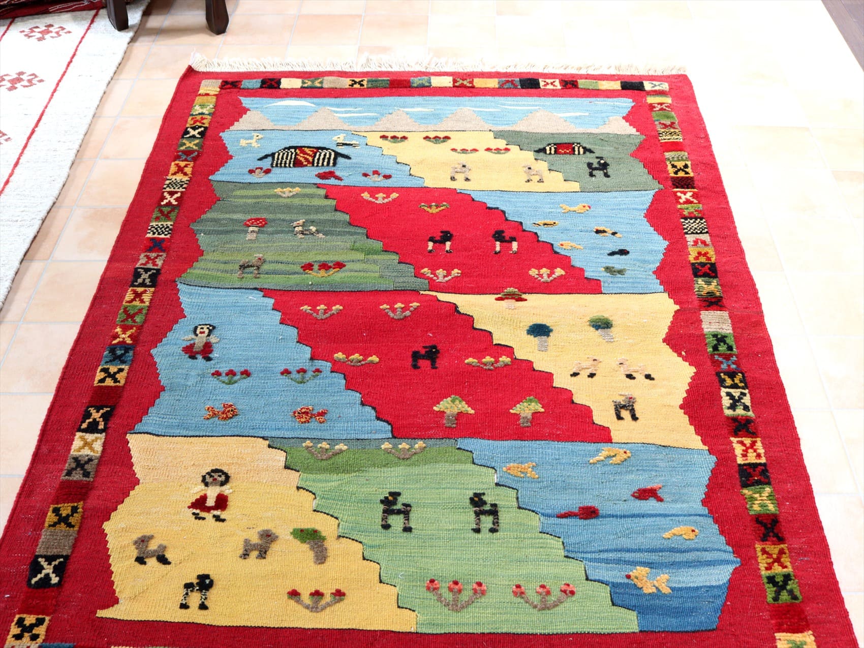 ギャッベキリム 遊牧民の織る風景のラグ140×103cm 遠くに見える山々 人間と動物