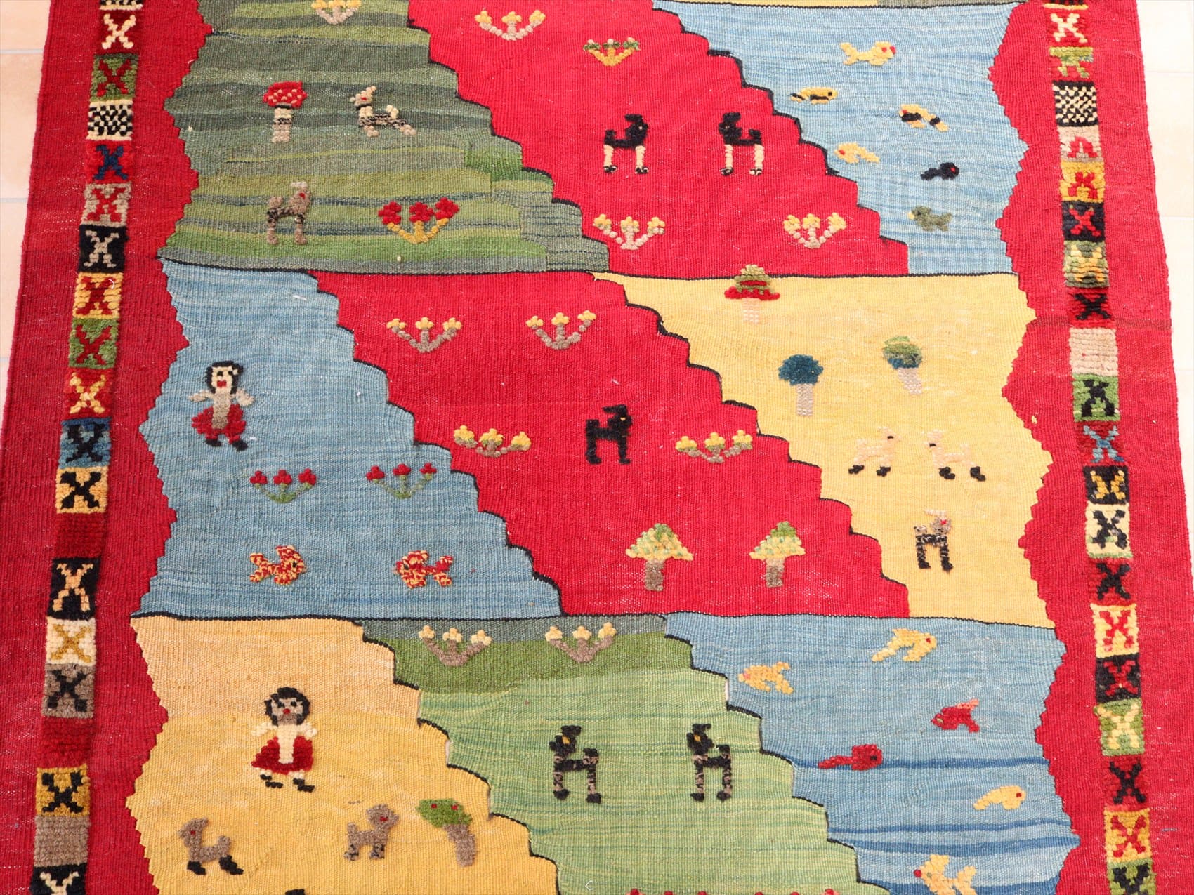 | イラン南西部、ザクロス山脈の麓に暮らすカシュカイ族の楽しいキリム。現在でも遊牧生活を続けているカシュカイ族の生活の様子とのどかな風景が描かれています。 大きなテント、草原の動物、湖で生き生きと泳ぐ魚が登場します。周りを囲むようにタイル枠が織られていて、モチーフやタイルの枠縁はいずれもパイル織りになっています。 |