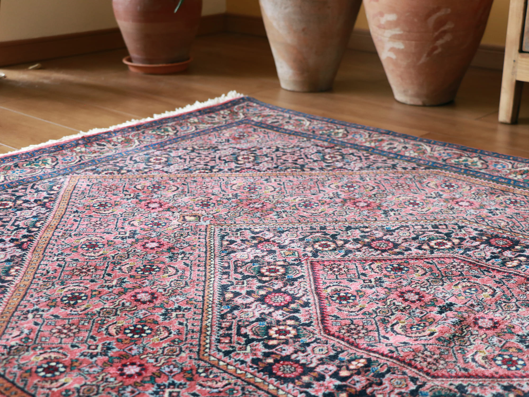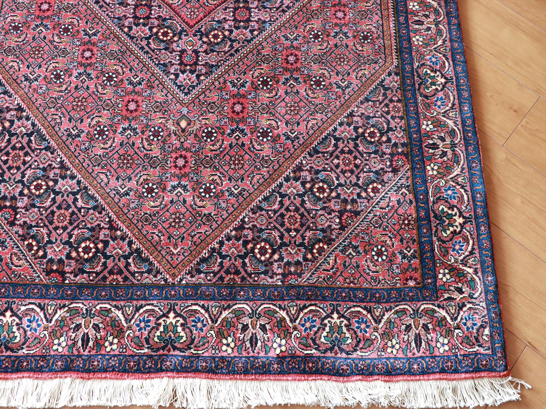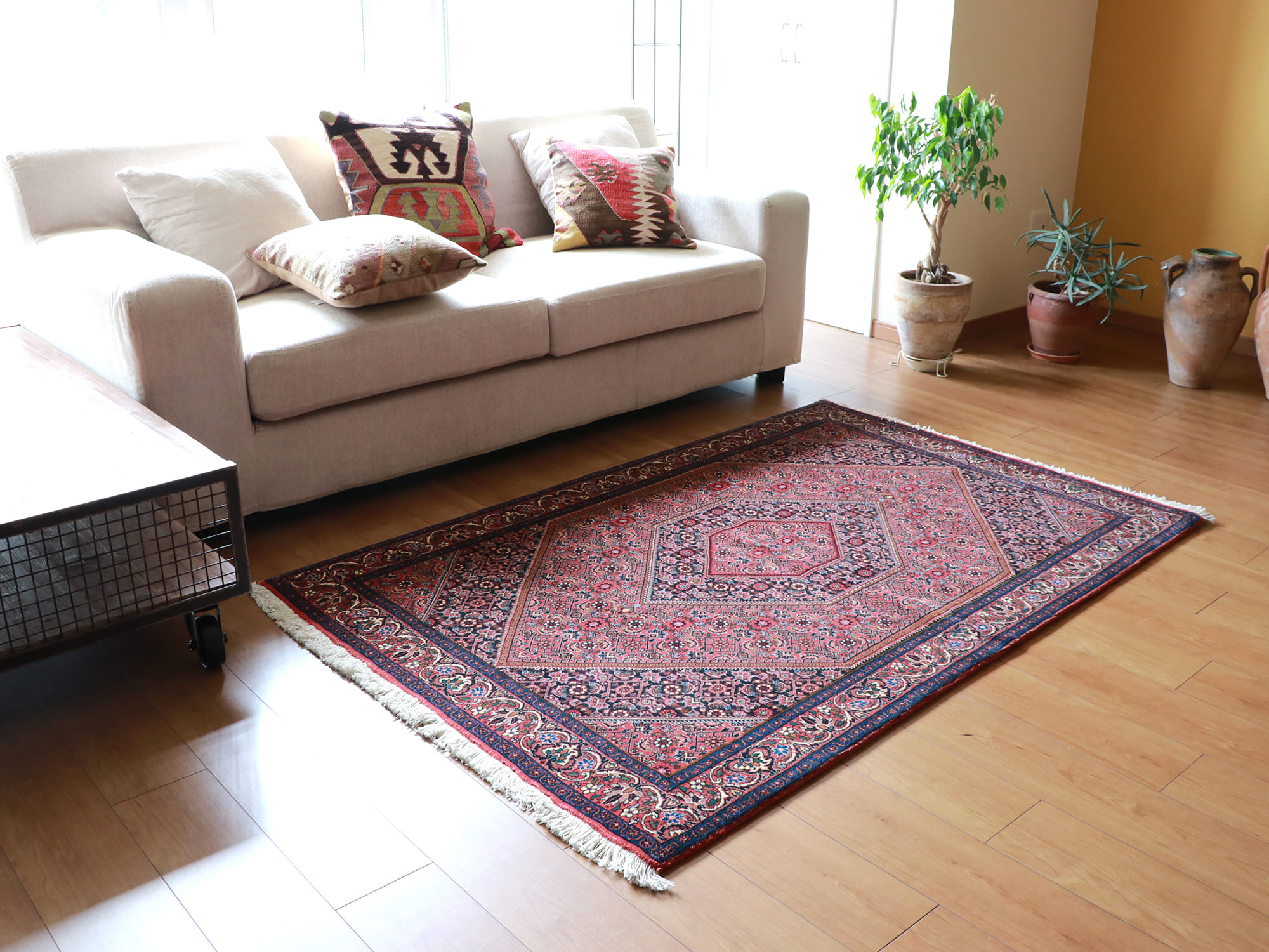 | イラン北西にある都市ビジャールで織られたじゅうたんです。この地域には主にクルド系の民族が住んでおり、絨毯はトルコ結びで作られています。ビジャールのじゅたんは織りの目が詰まっており、砂やほこりが入りにくいため耐久性に優れていると言われています。 織り目の細かな表面は、ツヤがあり、光の当たる方向によっては明るく輝くようにも見えます。細かな織りのラグとしては、重厚感があり全体の厚みは1.2-1.3cmほどのふっくらしたじゅうたんです。 |