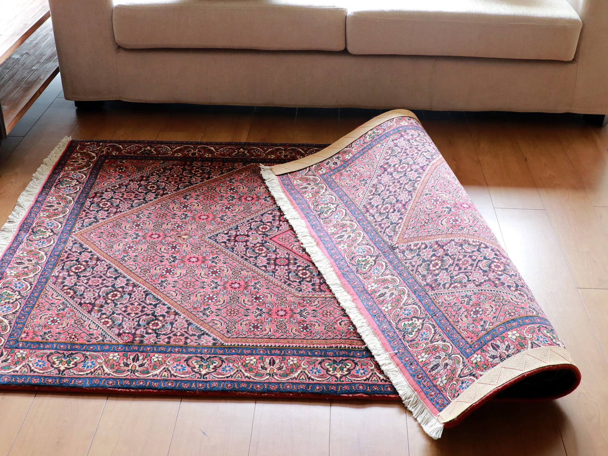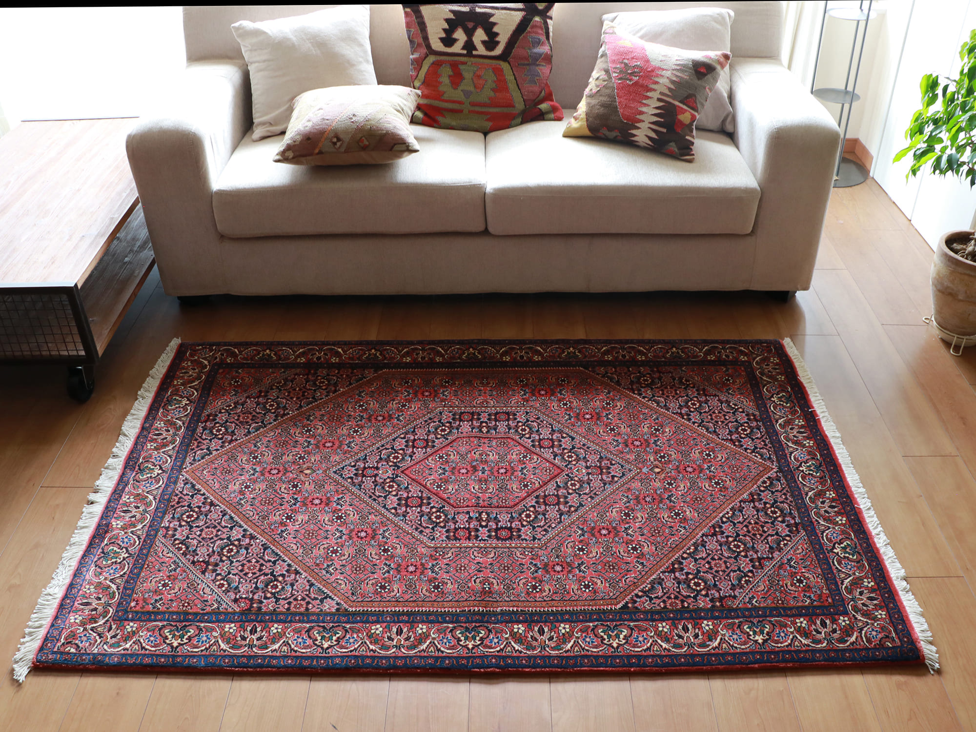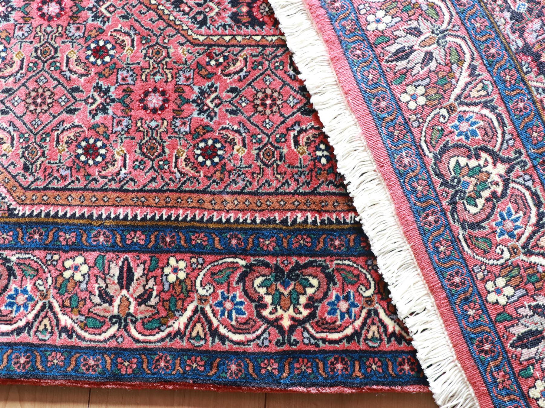 | イラン北西にある都市ビジャールで織られたじゅうたんです。この地域には主にクルド系の民族が住んでおり、絨毯はトルコ結びで作られています。ビジャールのじゅたんは織りの目が詰まっており、砂やほこりが入りにくいため耐久性に優れていると言われています。 織り目の細かな表面は、ツヤがあり、光の当たる方向によっては明るく輝くようにも見えます。細かな織りのラグとしては、重厚感があり全体の厚みは1.2-1.3cmほどのふっくらしたじゅうたんです。 |