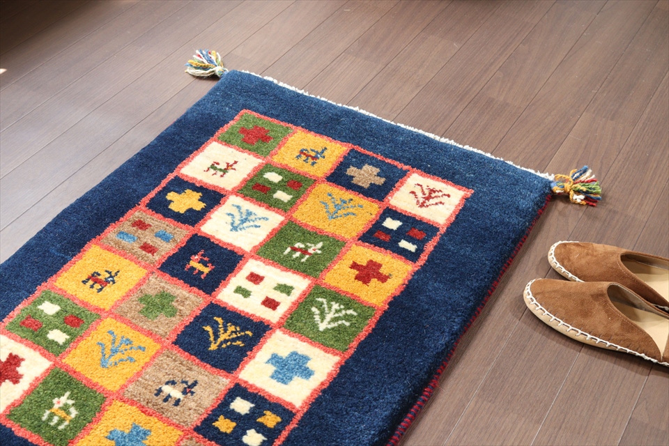 ギャッベ 玄関マット ネイビー88×62cm カラフルタイル
