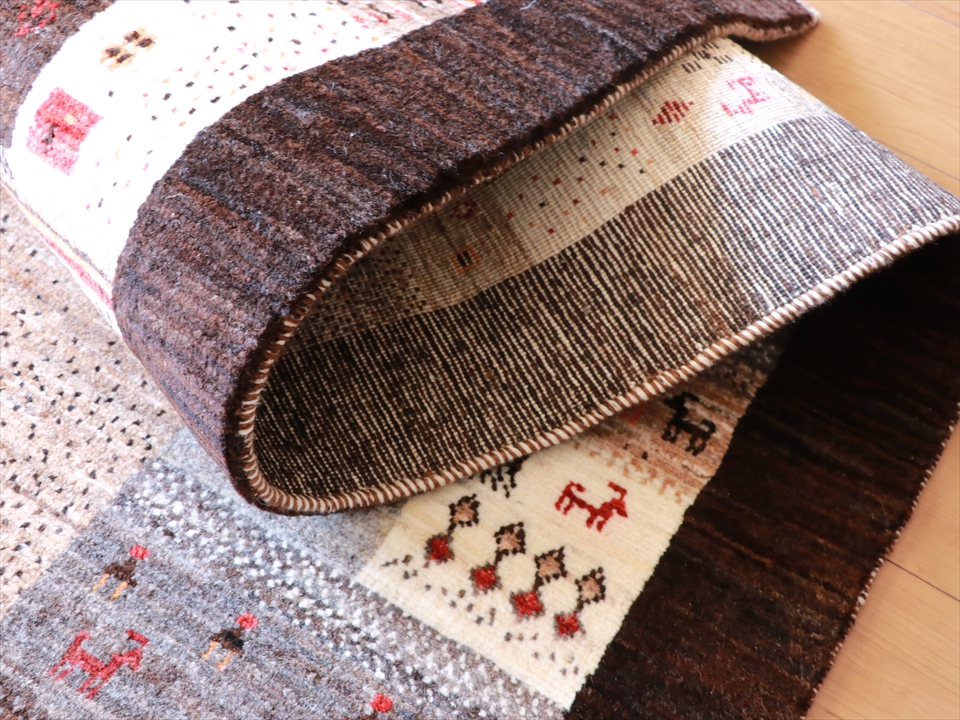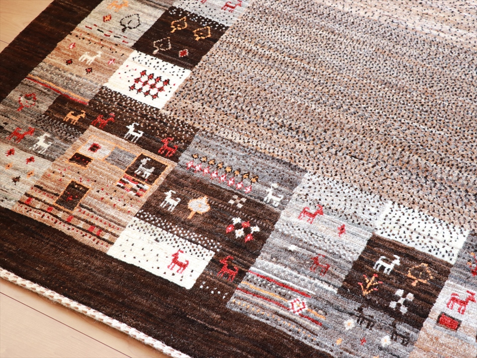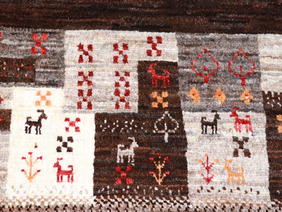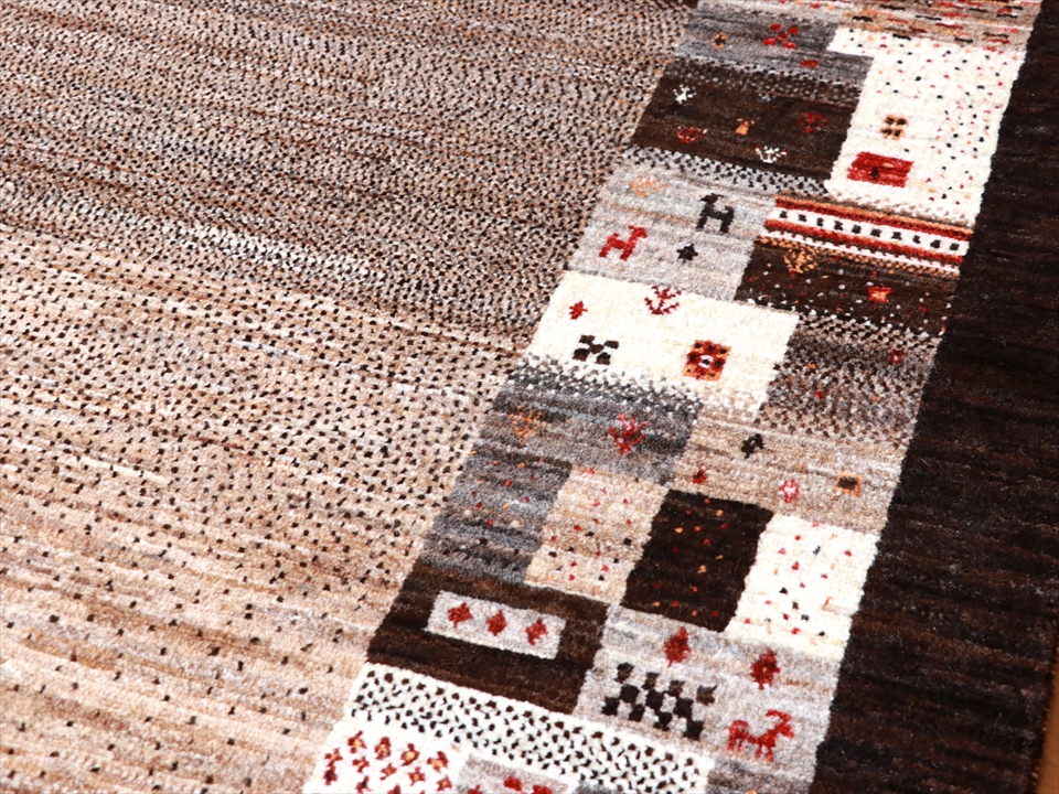| クールなかっこよさと、大人っぽいかわいらしさを合わせたモノトーンカラーのギャッベ。中央のフィールドは、グレーがかったベージュにこげ茶色のドットを加えたグラデーション。いずれも、無染色の天然の羊毛の色を使ってあり、羊毛の濃淡が自然な感じに出ています。 同様に天然の色で織られた周囲のモザイクタイルには、アクセントカラーのレッドやイエローで動物や草花などのモチーフがデザインされています。ひとつひとつのモチーフの細かさから、緻密な織りのギャッベであることがおわかりいただけます。 |