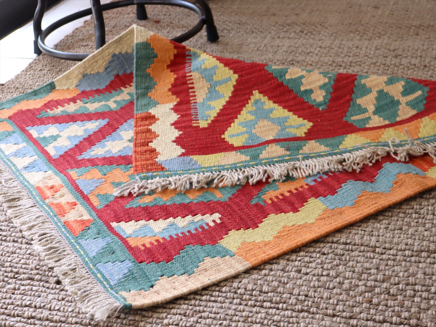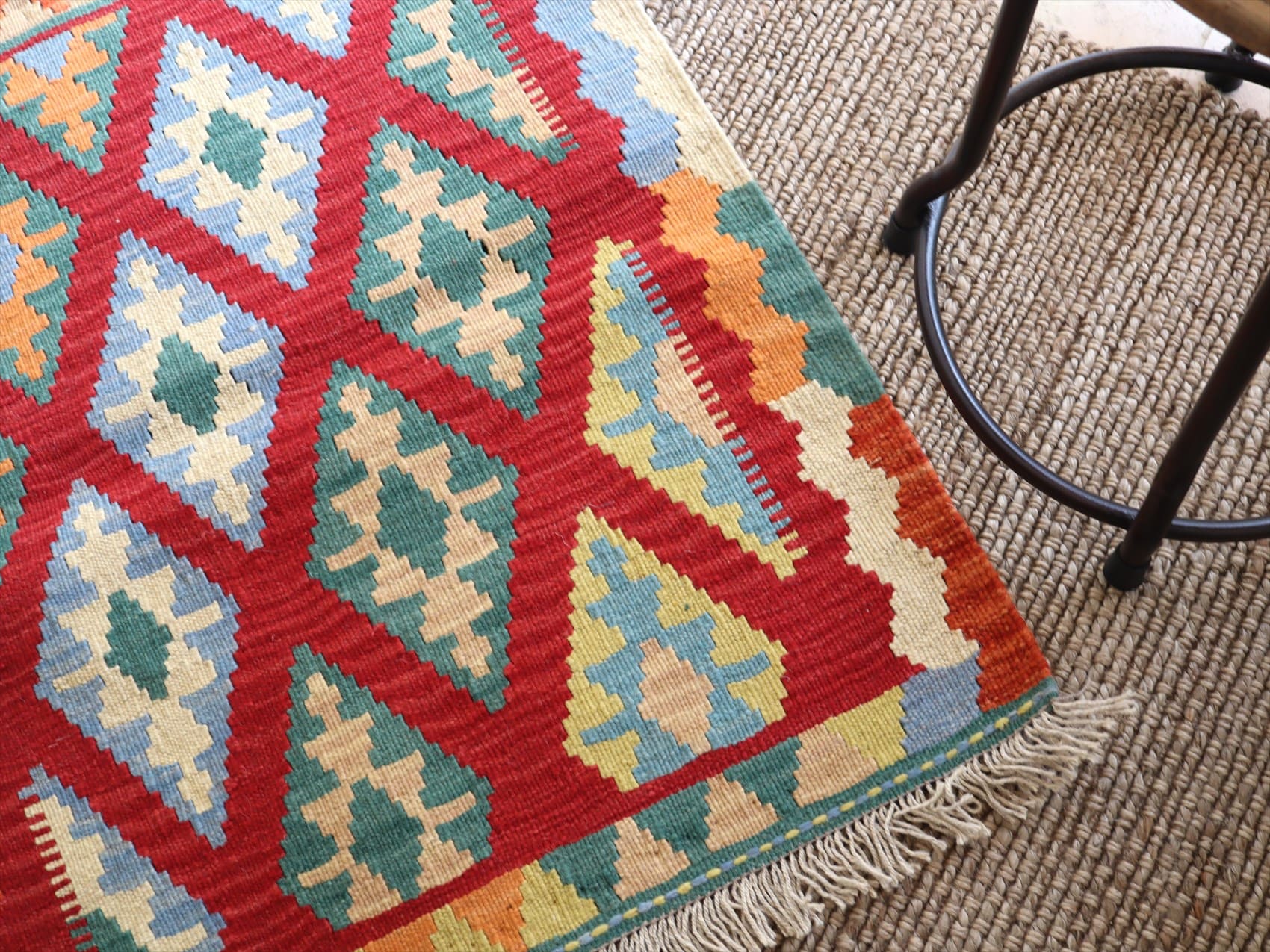 | ポップな明るい色使いの、手織りキリムです。イラン南部に暮らす遊牧民、カシュカイ族の伝統柄が織り込まれています。 |