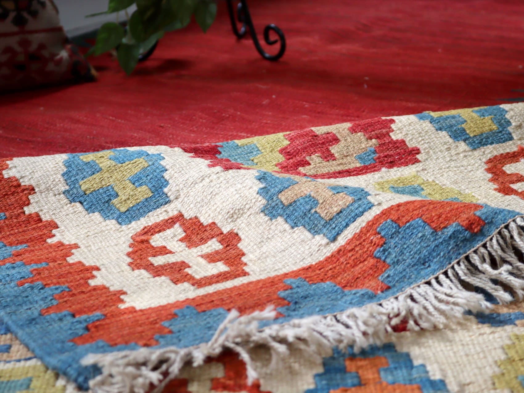 | ポップな明るい色使いの、手織りキリムです。イラン南部に暮らす遊牧民、カシュカイ族の伝統柄が織り込まれています。 |