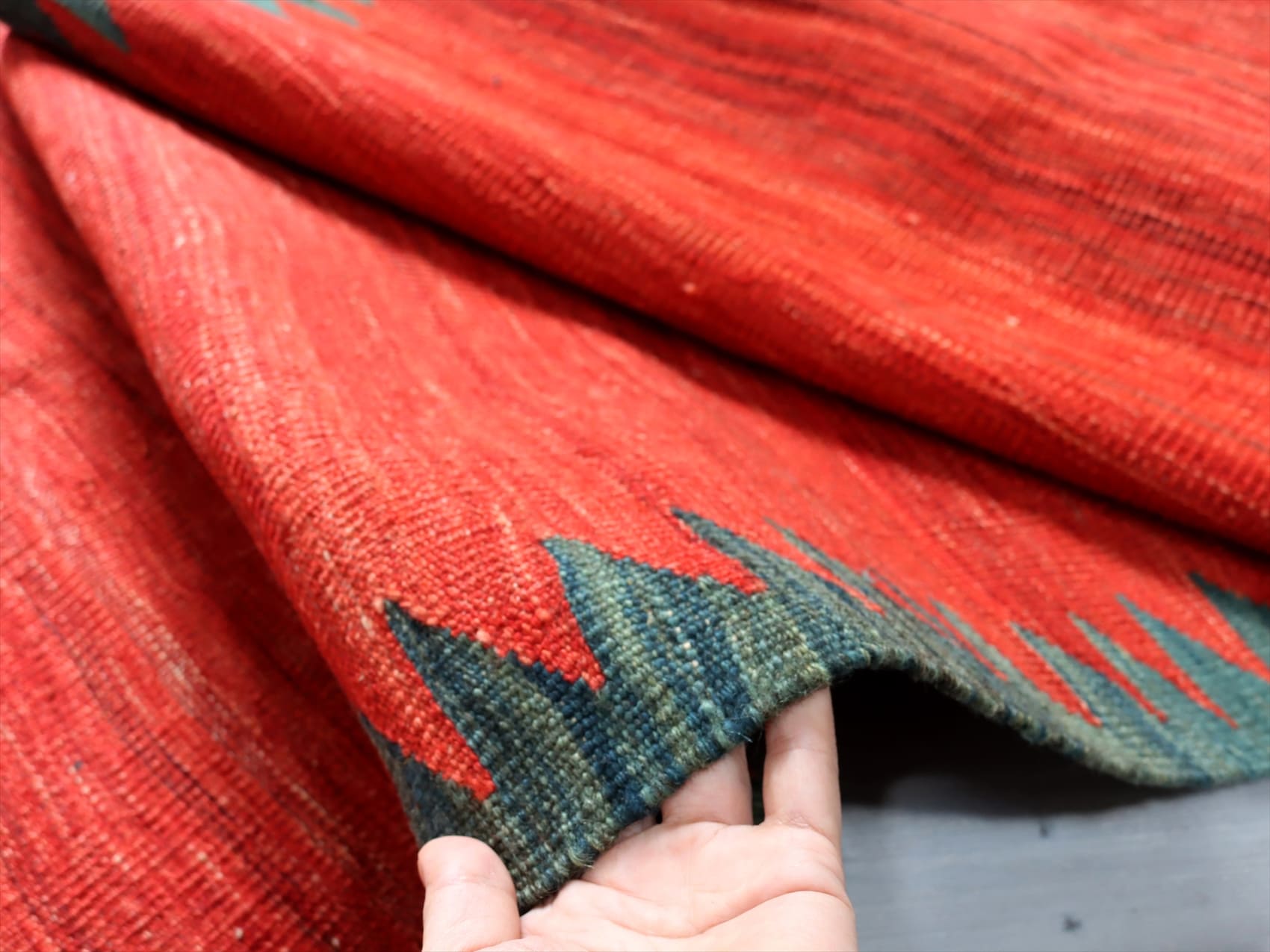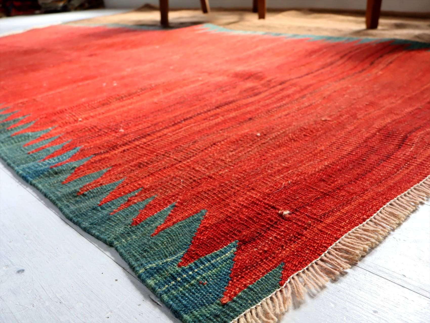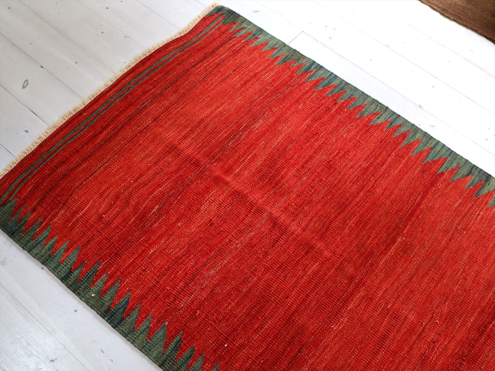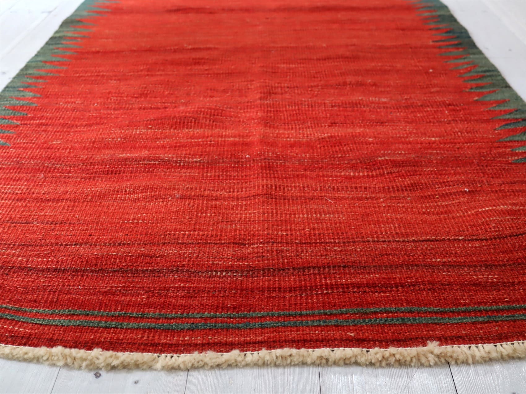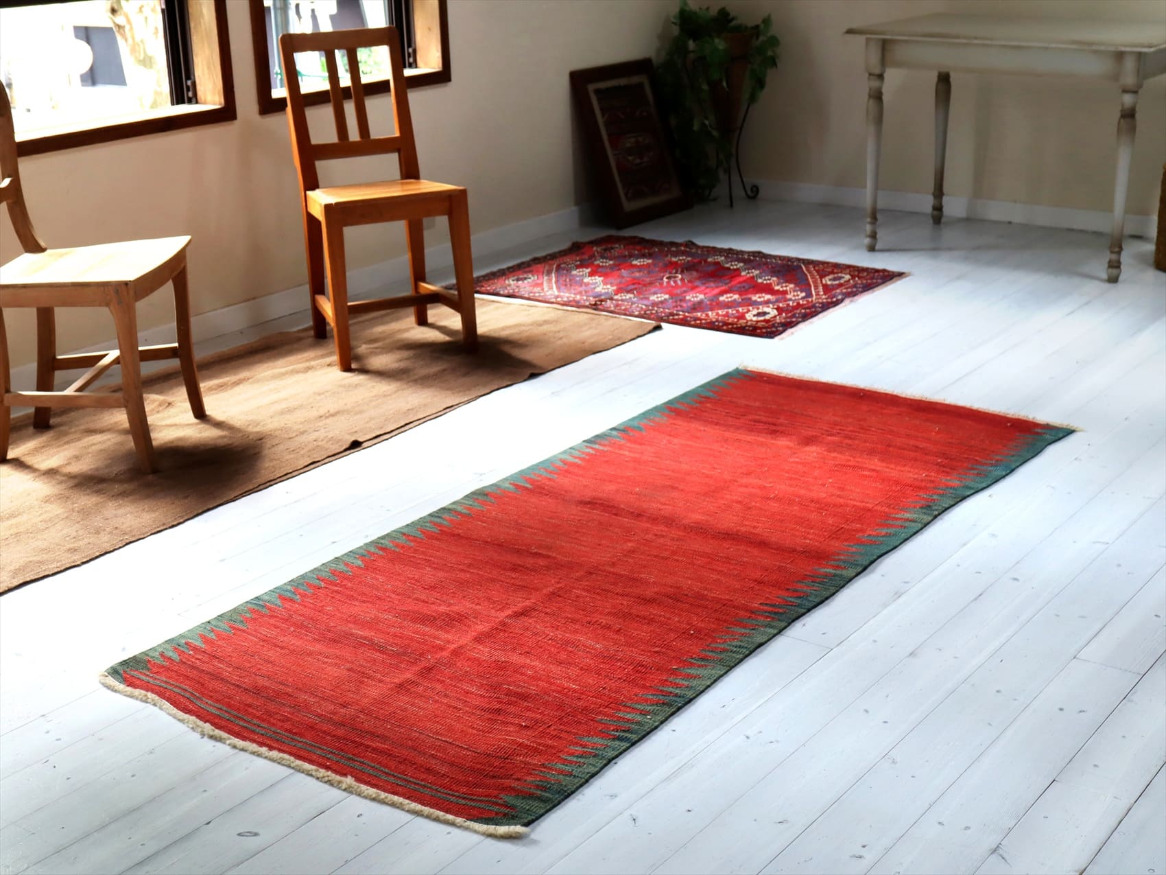 - カシュカイ族の草木染キリム 大きなランナー203×88cm シンプルなレッド&グリーン