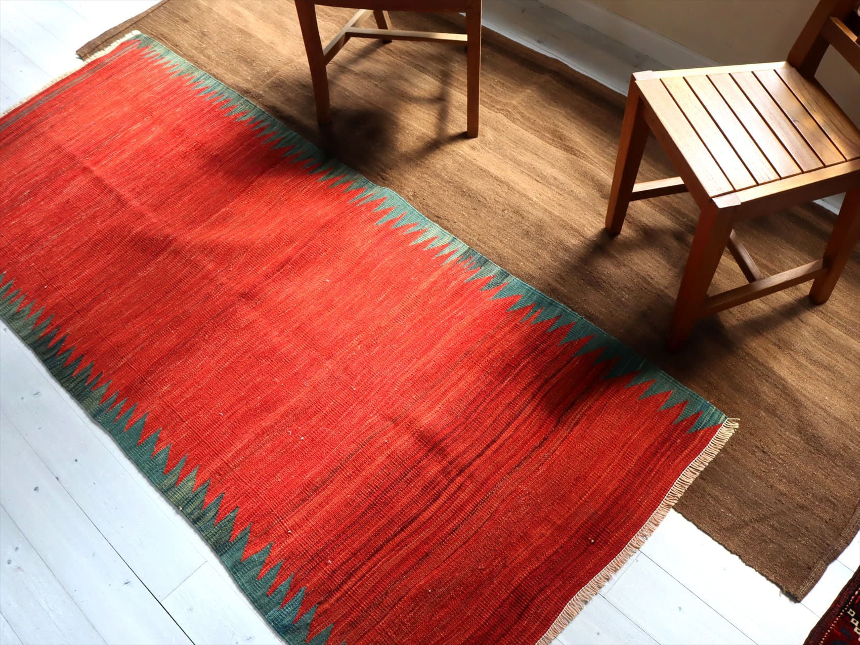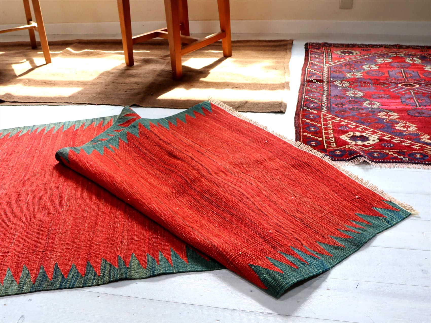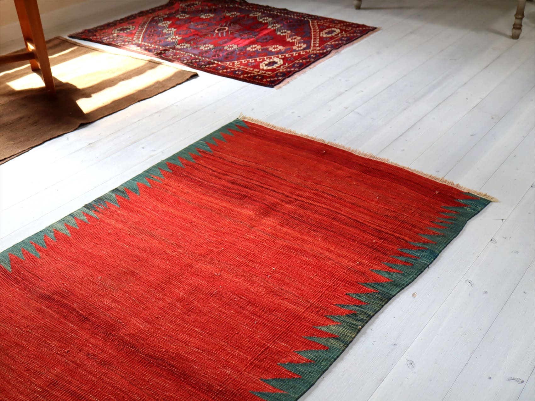 カシュカイ族の草木染キリム 大きなランナー203×88cm シンプルなレッド&グリーン