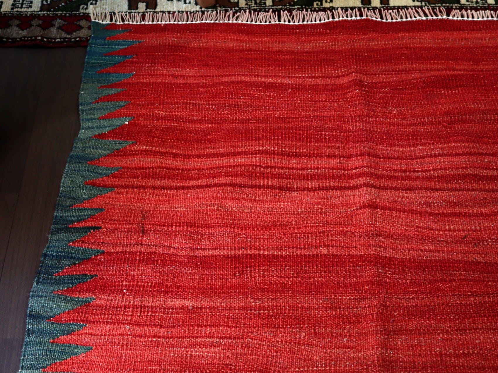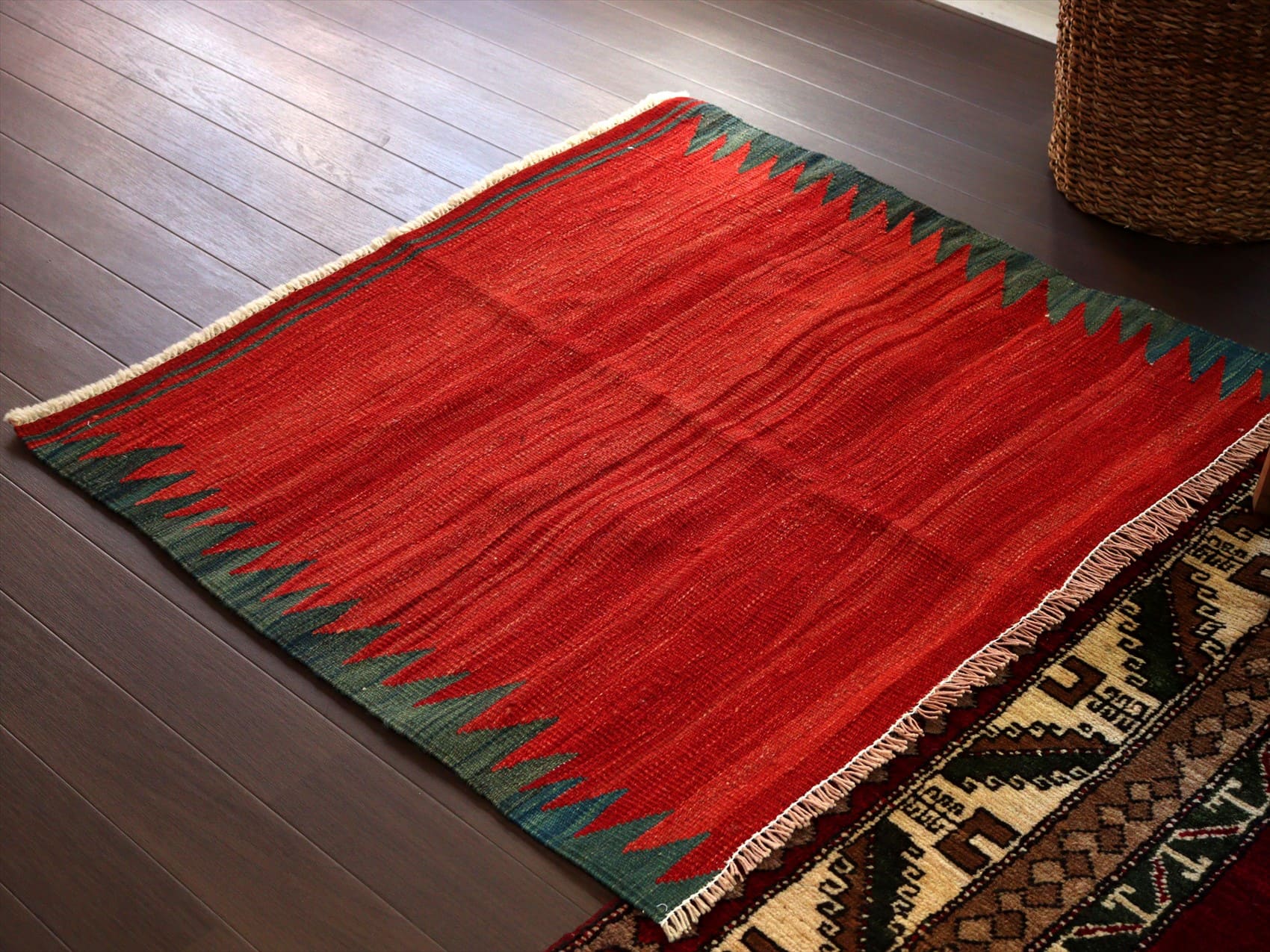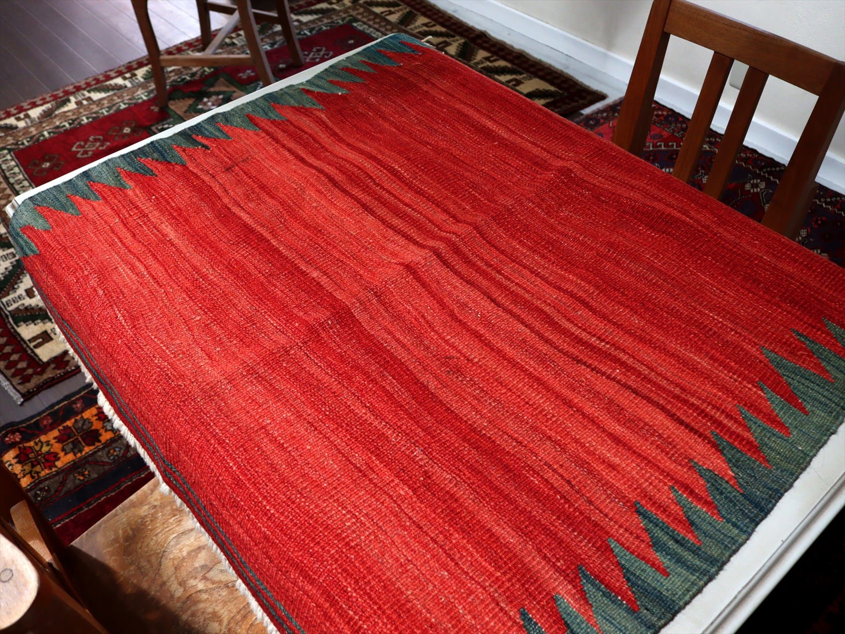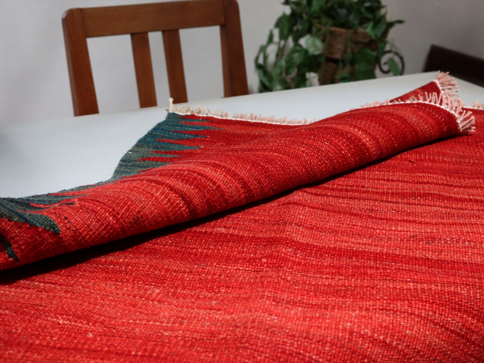 - カシュカイ族の草木染キリム 大きなランナー83×92cm シンプルなレッド&グリーン