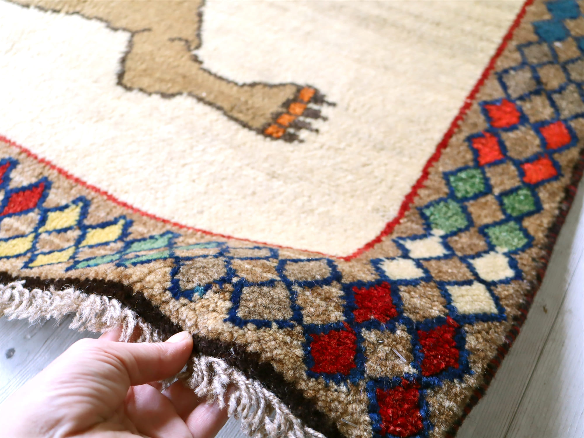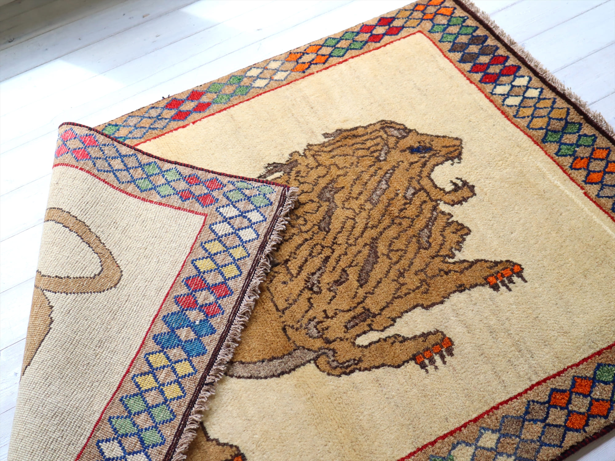 Key:old gabbeh lion gabbeh,lion rug,vintage rug, Tribal rug, オールドギャベ, ライオンギャッベ, ライオンラグ, ラグ, ギャッベ, ギャベ, 部族絨毯, トライバルラグ, ヴィンテージ, コレクタブル, ウール製, イラン, ペルシャ ,手織り, じゅうたん, 絨毯, アイボリー, 白, ブラウン, 茶色, ベージュ