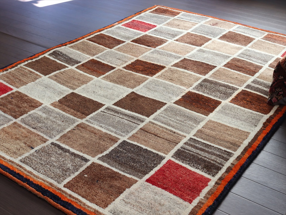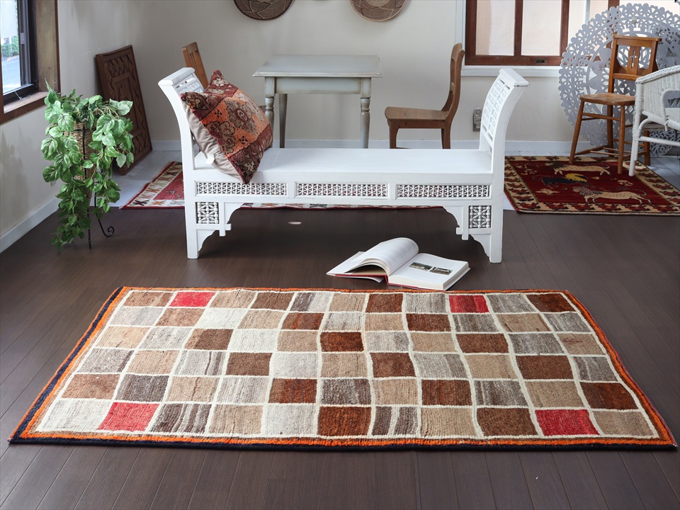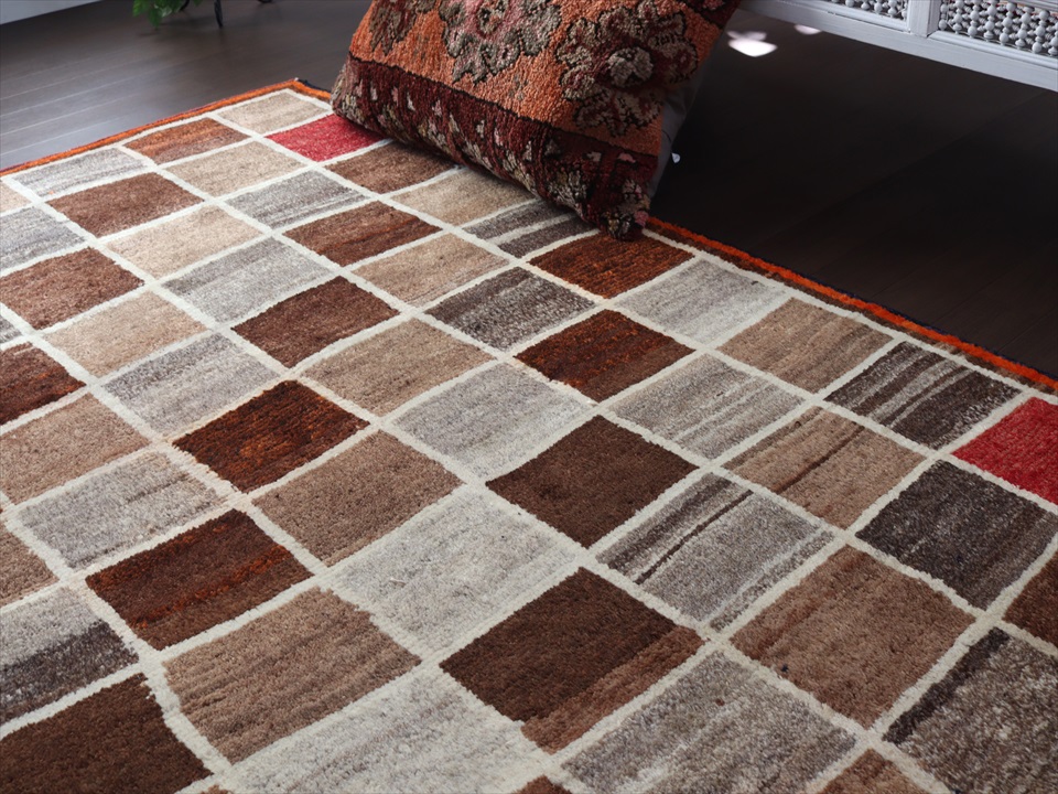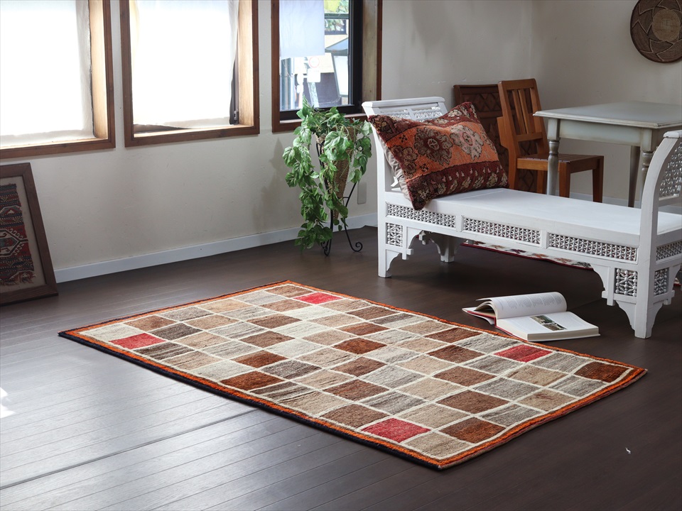 | 温かみがある色合いのカラフルタイルのギャッベ。手織りゆえタイルのデザインがゆがんでいますが、手織りならではの味わいが感じられます。シンプルなデザインなのでモダンなお部屋にもおすすめです。 |