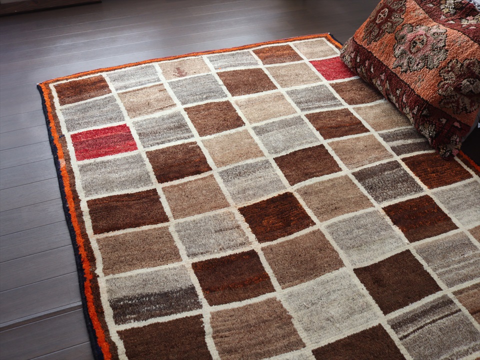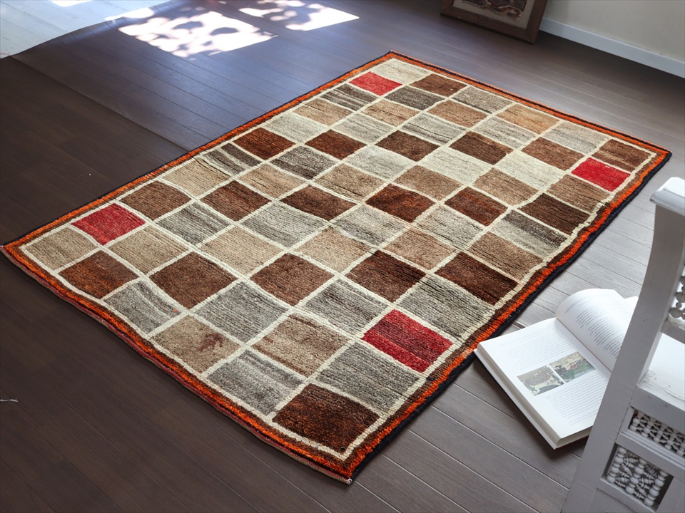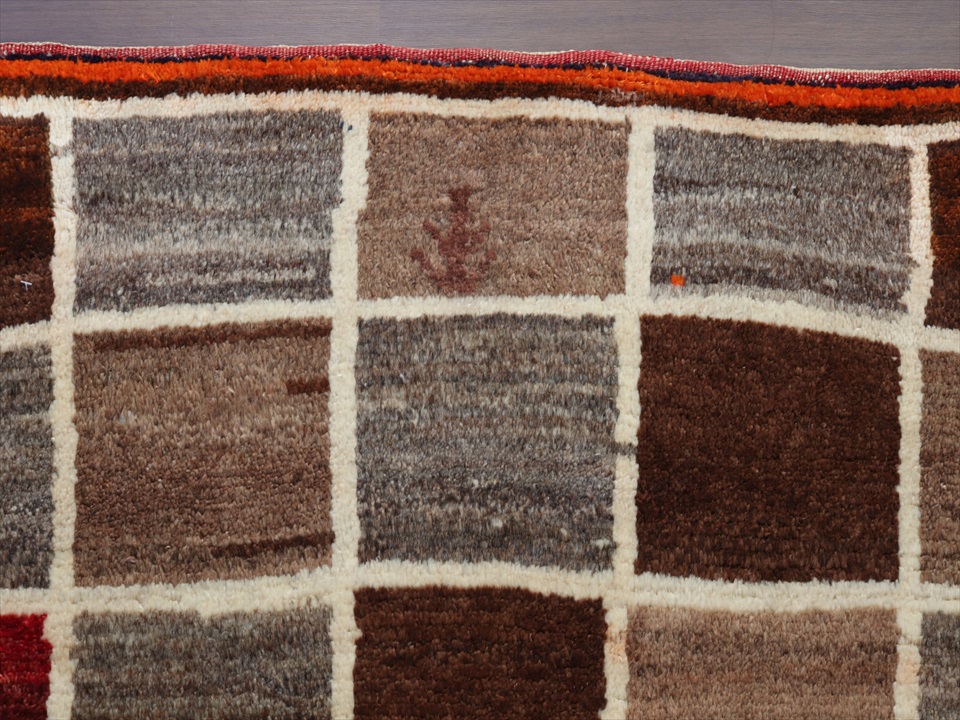 Key:old gabbeh, vintage rug, Tribal rug, オールドギャベ, ラグ, ギャッベ, ギャベ, 部族絨毯, トライバルラグ, ヴィンテージ, ウール製, イラン, ペルシャ, 手織り, じゅうたん, 絨毯, レッド, 茶色, 幾何学模様, タイル, 格子柄