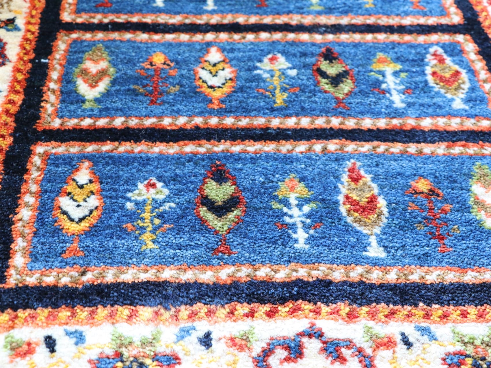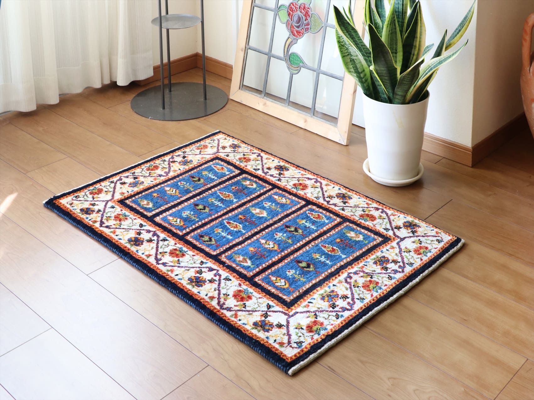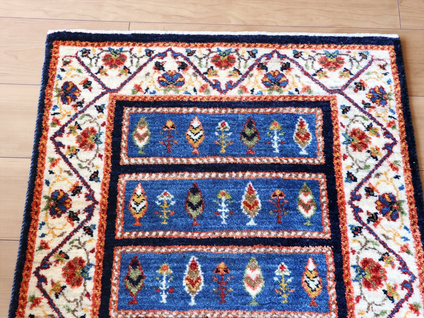 | インディゴ藍で染めたブルーに、アイボリーのボーダーを合わせたクラシックデザインのギャッベ。細長くのびるイトスギの樹はカラフルな木の葉のように表現されていて、ひとつひとつ少しずつ違う表情をみせています。周囲は、蔓の絡まるバラでしょうか。古くから織り継がれてきた伝統柄ですが、色使いのためかモダンなアート作品のようにも見えます。 |