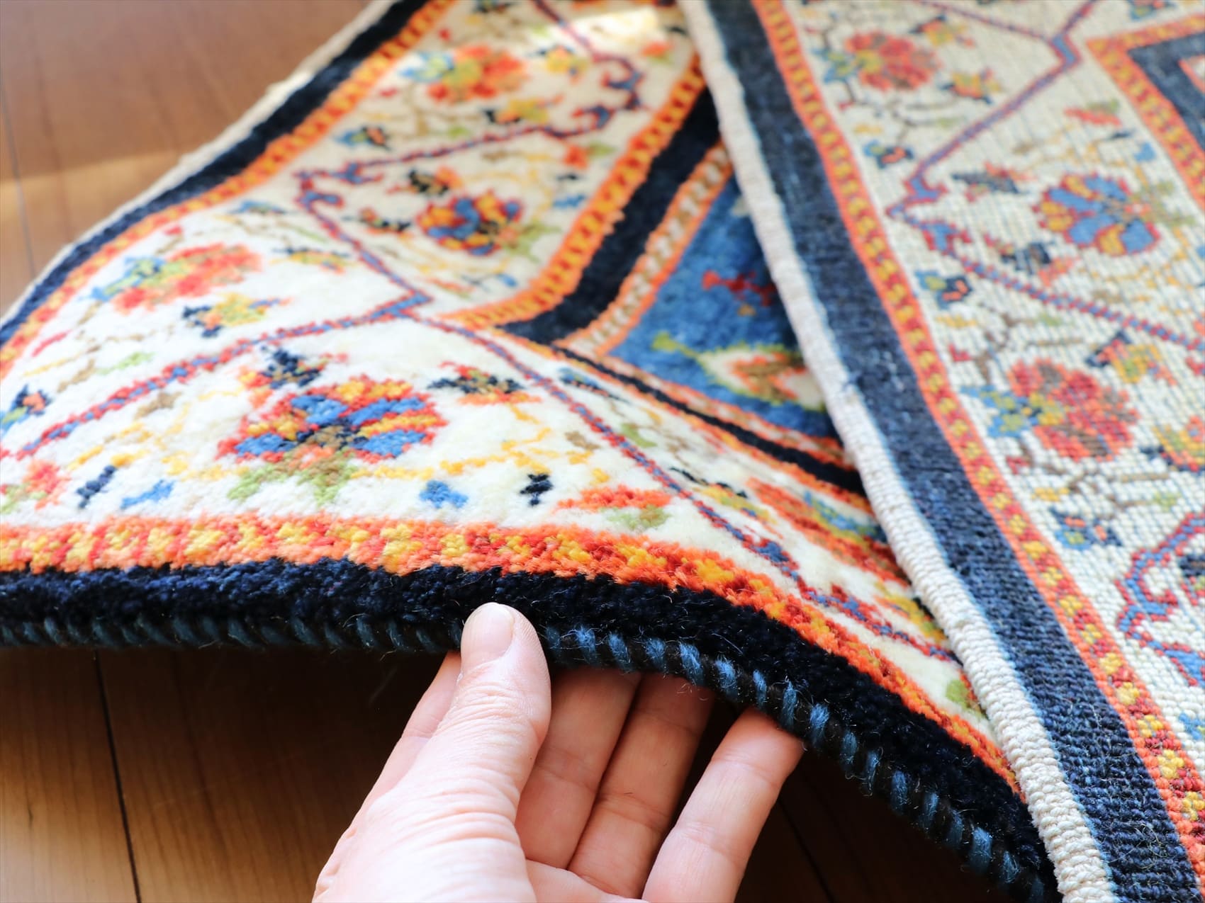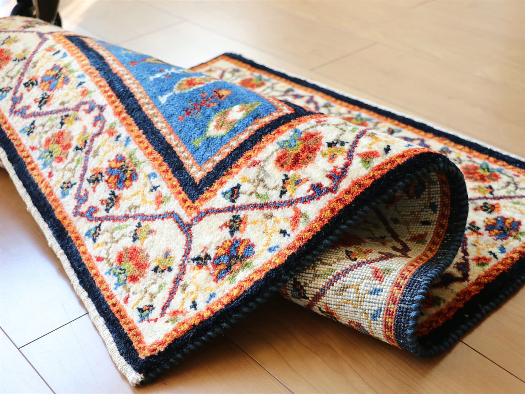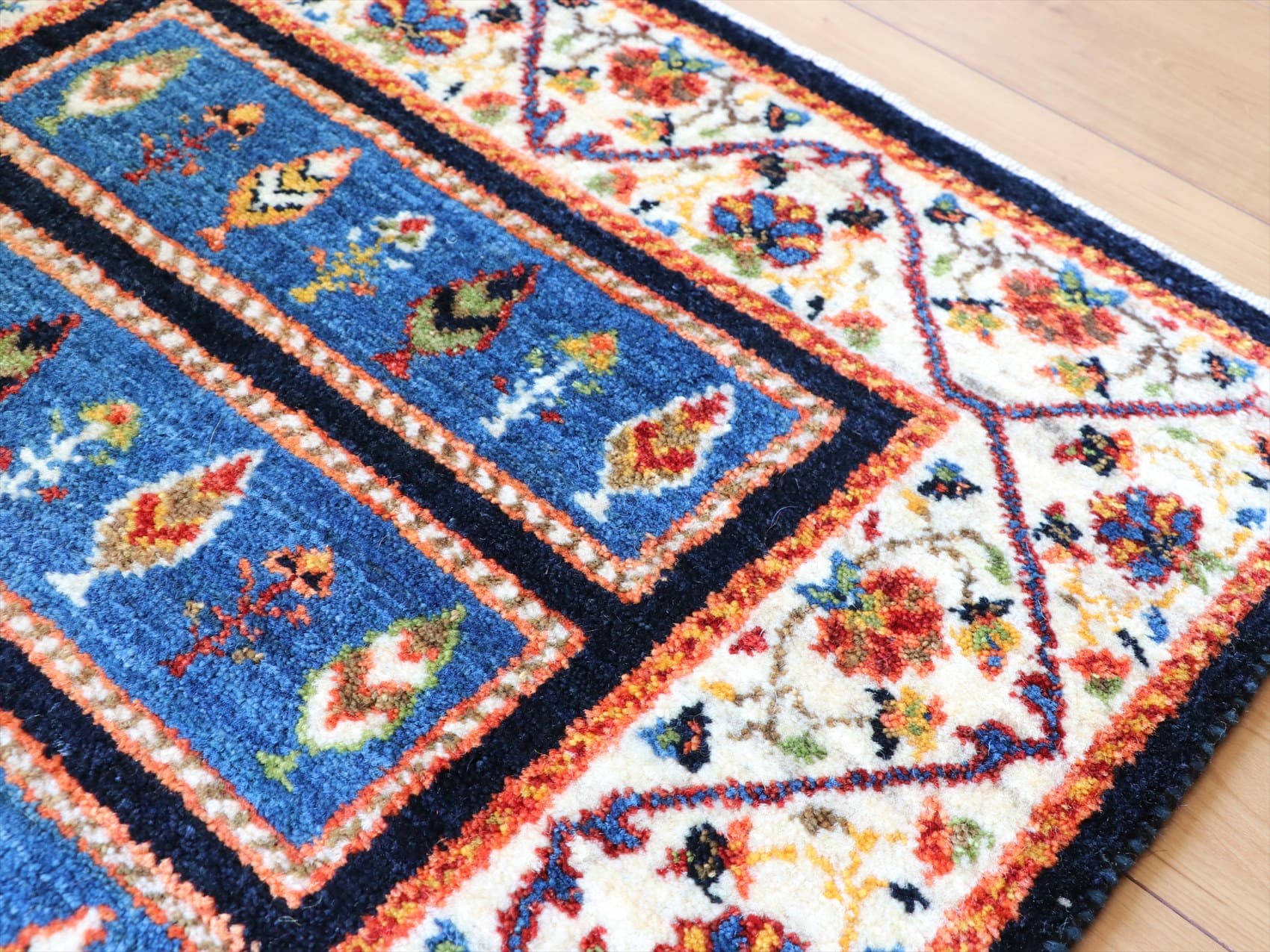 | わずかですが、正面から見て左下の隅が少し短く、全体のカタチにゆがみがあります。織りは、ギュッと引き締まって整った織り。 細かな織りのギャベとしては、ふっくらとしていて、ベースを含めたラグ全体の厚みは1.3-1.4cm。毛足(パイル)が長いため、モチーフはくっきりとせずぼやけた感じなのですが、その分、手紬の毛糸の一本一本まで見えるようで、手間をかけて織りあげた手仕事のすばらしさがわかります。 【Luribaft ルリバフ】 ルリ族の伝統柄をアレンジして、現代風に仕上げたクラシックデザインが特徴。天然染料による染めの美しさ、細かな手織り、そして、何度もブラッシングしてクリーニングとシャーリングを繰り返した手間を惜しまないメンテナンスの技術と、すべての行程において技術の高い手仕事でつくられています。次の世代に受け継いで、永くお使いいただきたい、傑作のそろったコレクションです。 |