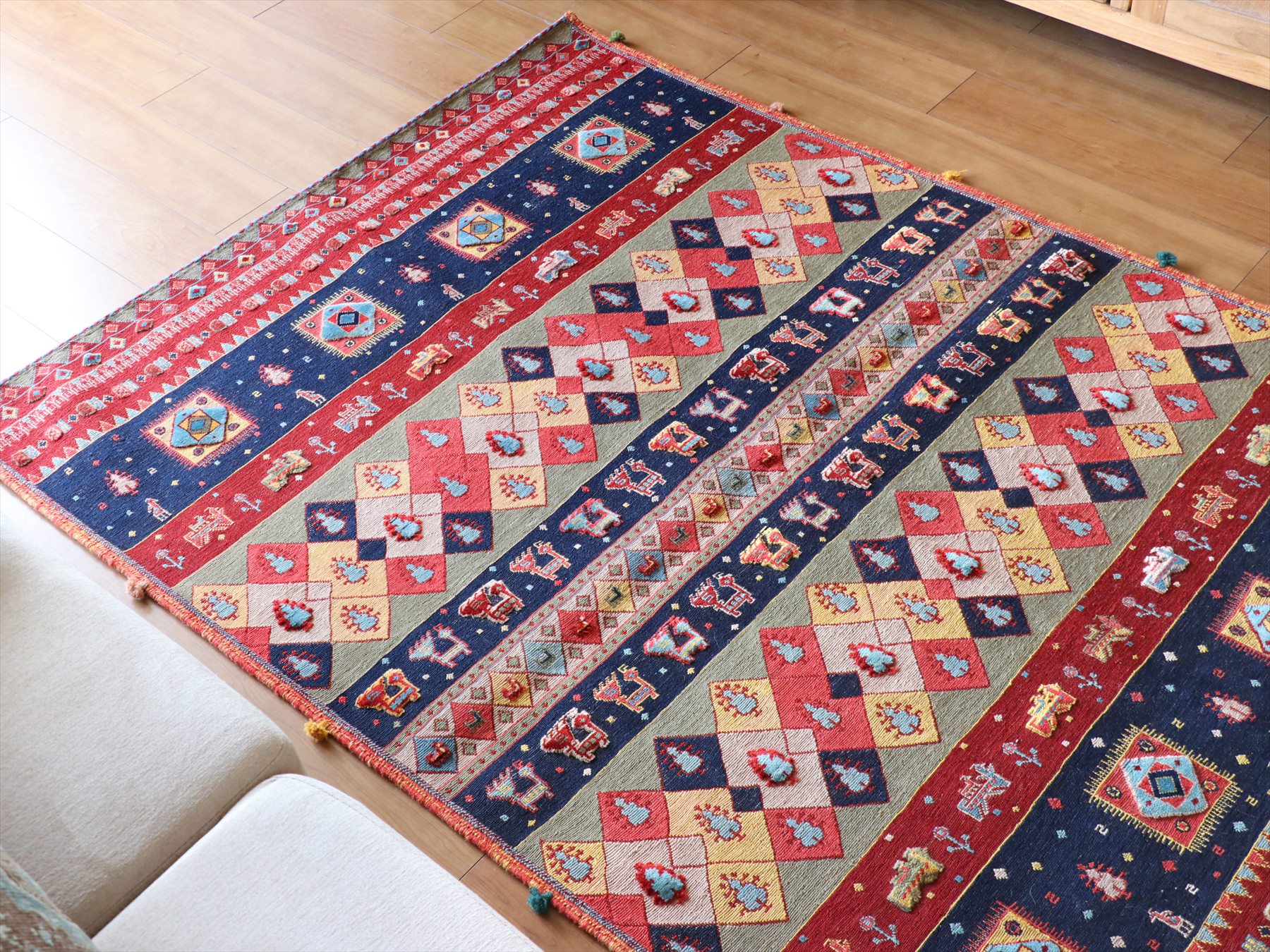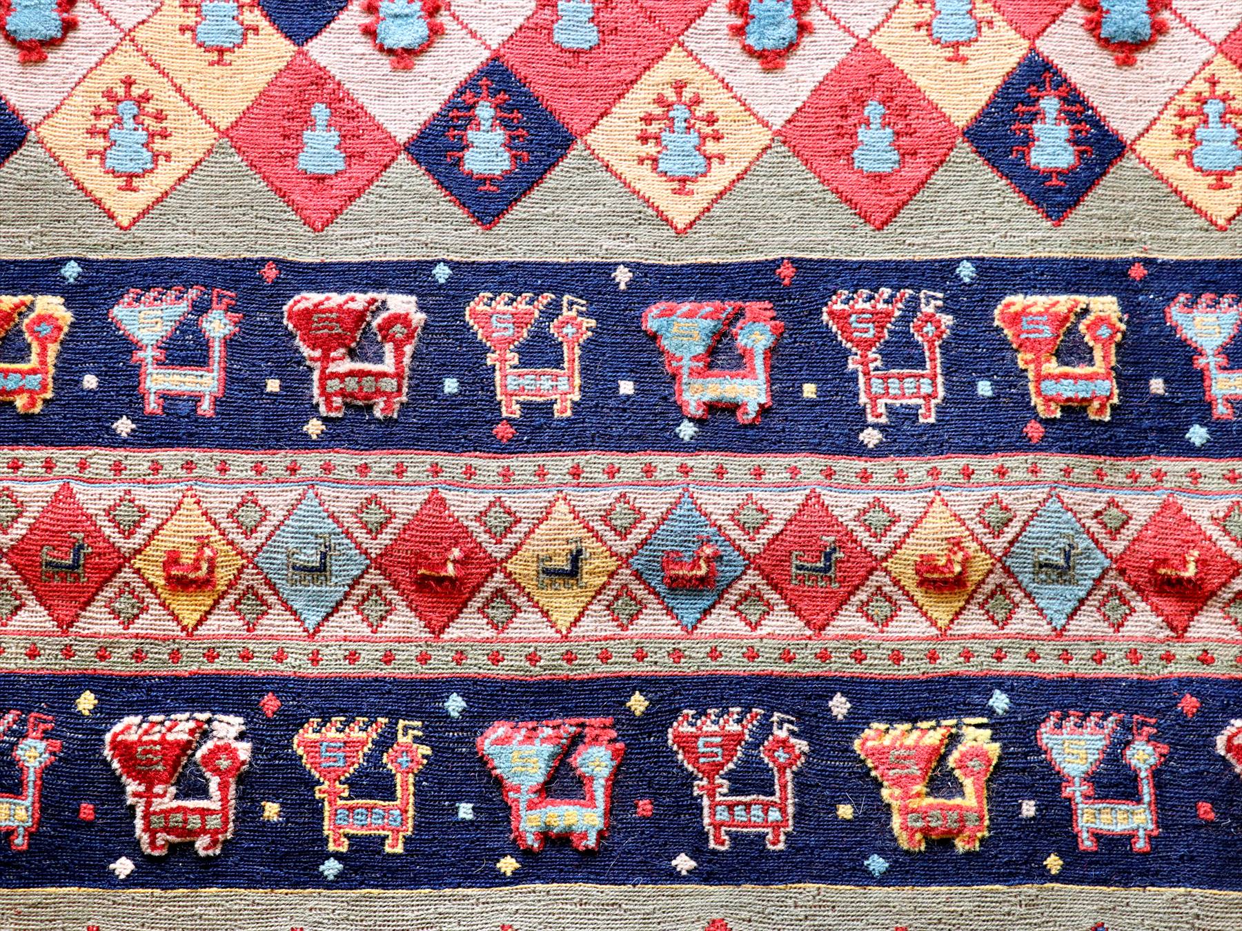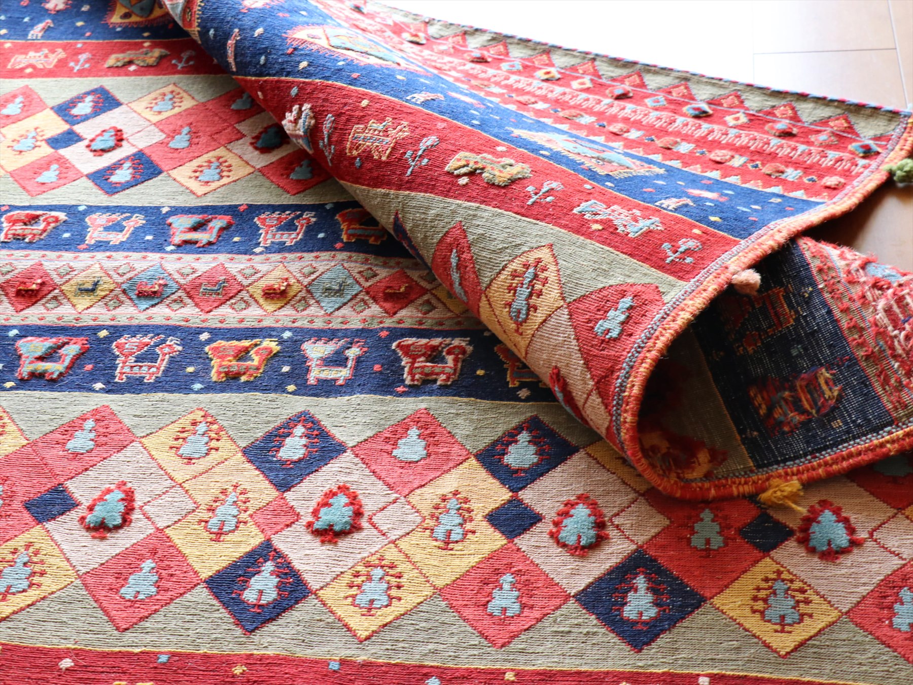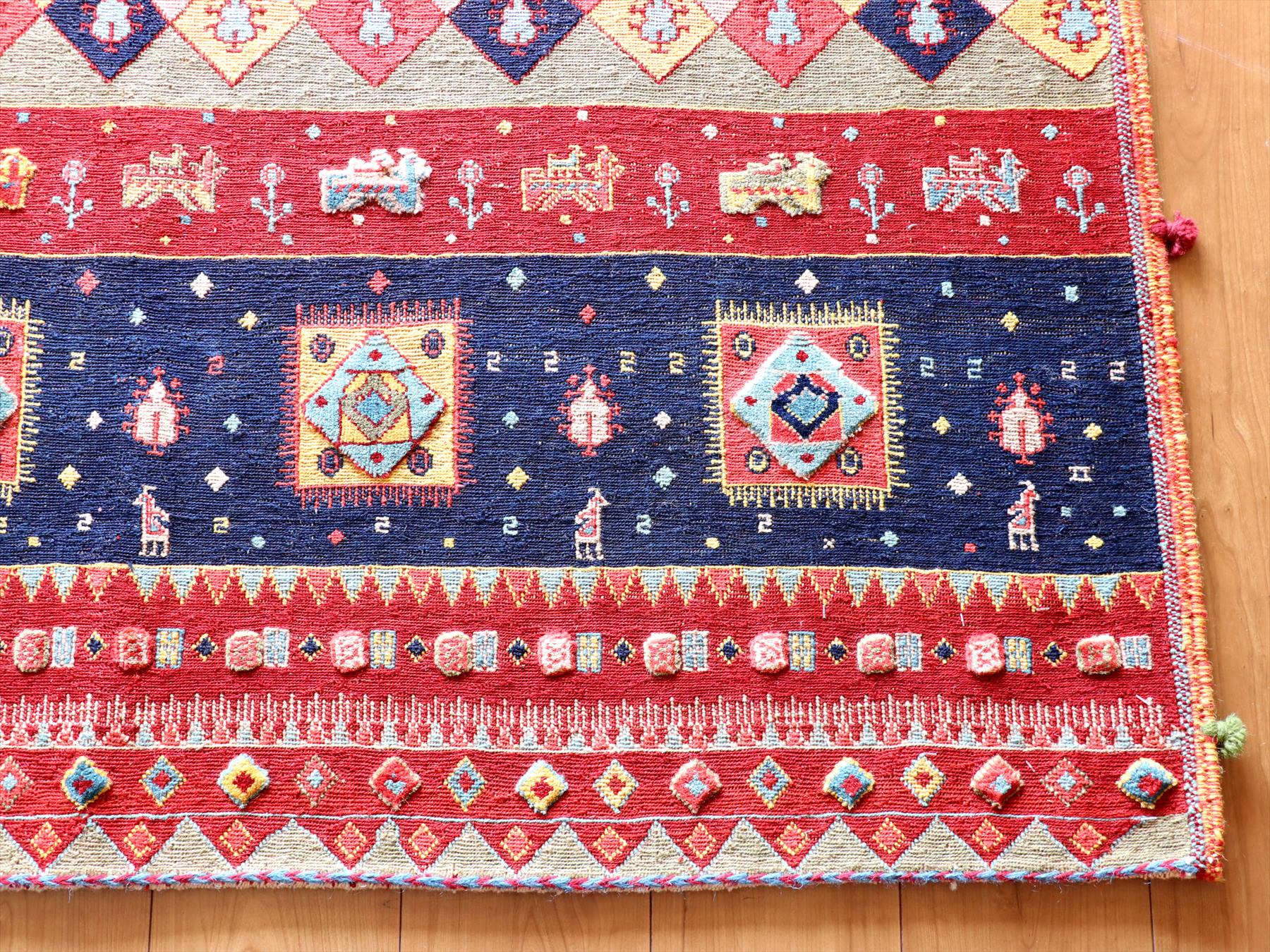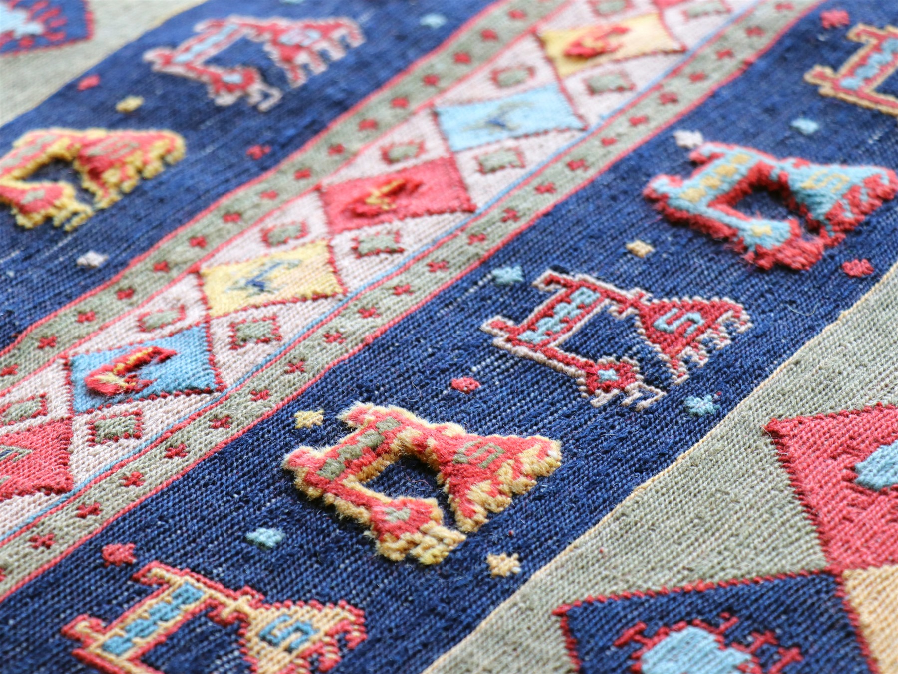 | シカやクジャク、生命の樹のモチーフがスマックとカーペット織りで描かれています。シカのモチーフは2頭づつ遠近法を用いて描かれていて特徴的です。 刺繍のようなスマック織りと、立体感のあるカーペット織りを組み合わせた職人技とも言える緻密な織りの一枚。 |