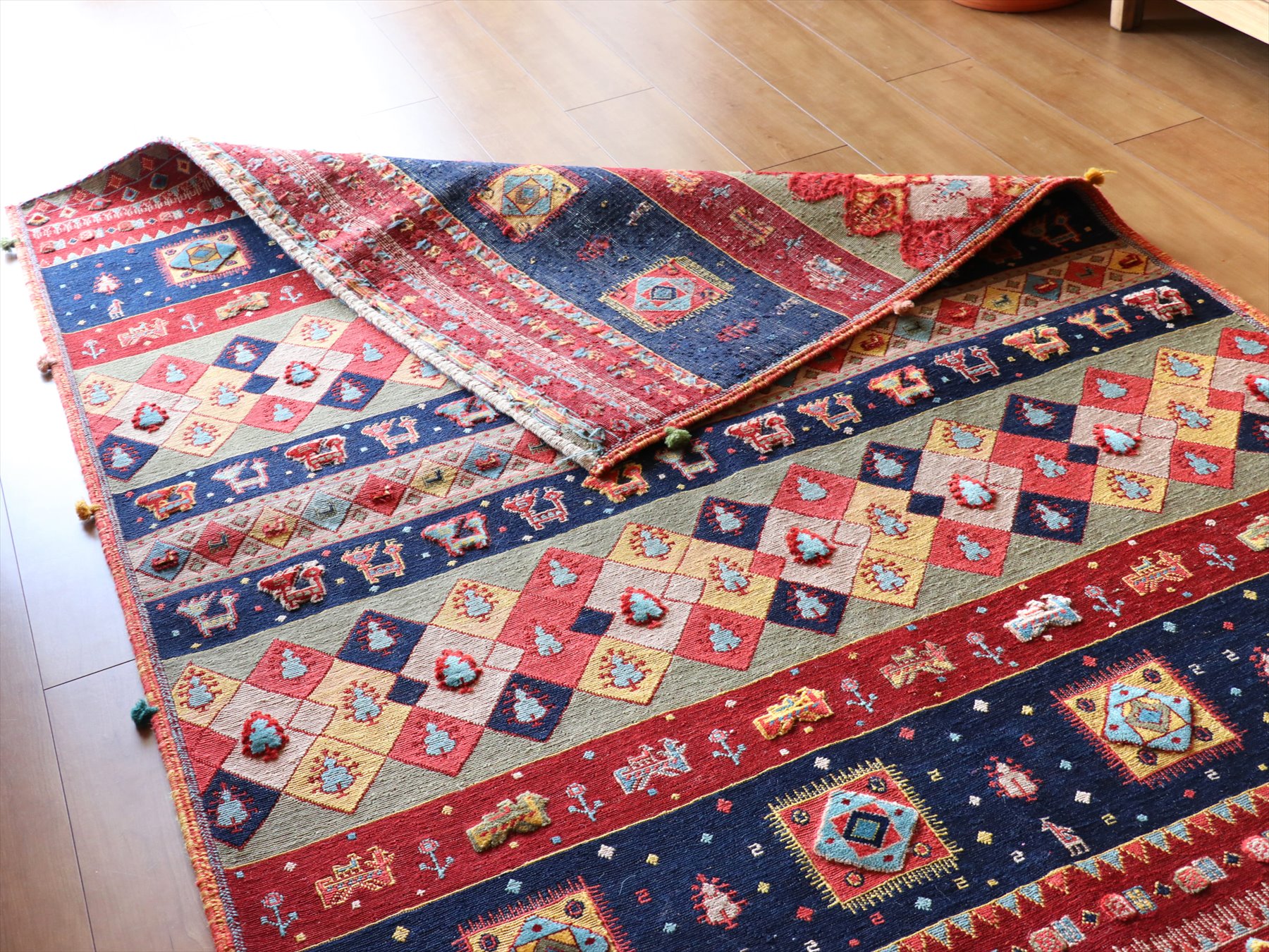 | ベースの部分は厚みがあり、しっかりとしたハリがあるスマック織りのキリムです。カーペット織りの部分はパイル(毛足)のある織りで、表面は立体感があります。 ゾランヴァリ社のスマックは、手紡ぎ、草木染、そしてもちろん手織りの最高級品。輸出前にもクリーニング、糸の処理、ゆがみの矯正など、細かなメンテナンスを行い、厳しい管理のもとでクオリティチェックを行っています。 |