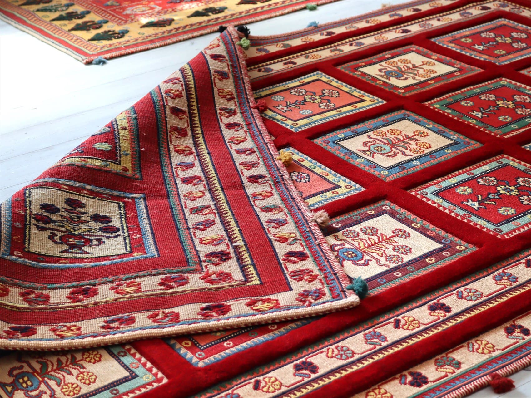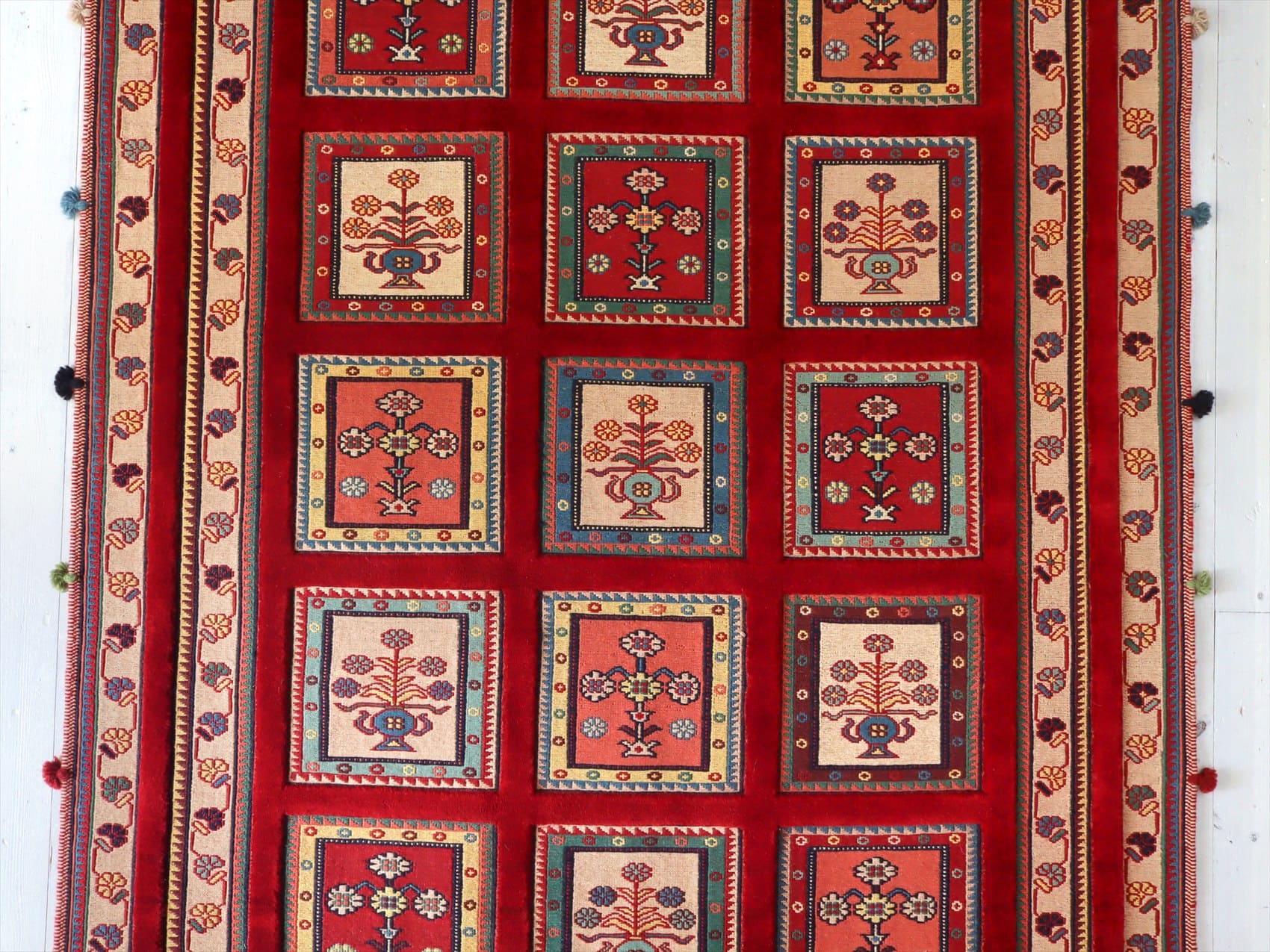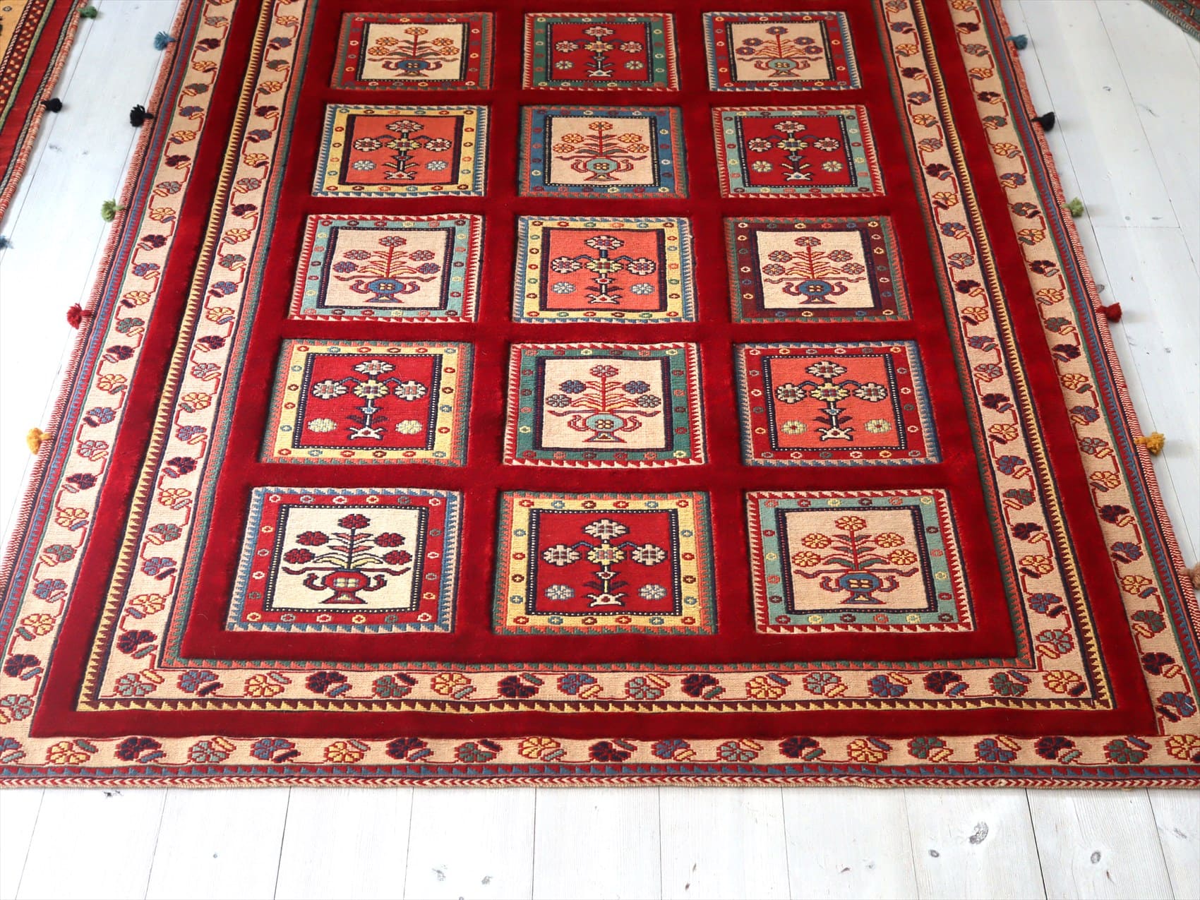 | カーペット織りで格子状に織られたタイルの中に花束が織られたデザイン。赤い枠の部分もカーペット織りです。房飾りがアクセントになっています。 刺繍のようなスマック織りと、立体感のあるカーペット織りを組み合わせた職人技とも言える緻密な織りの一枚。 |