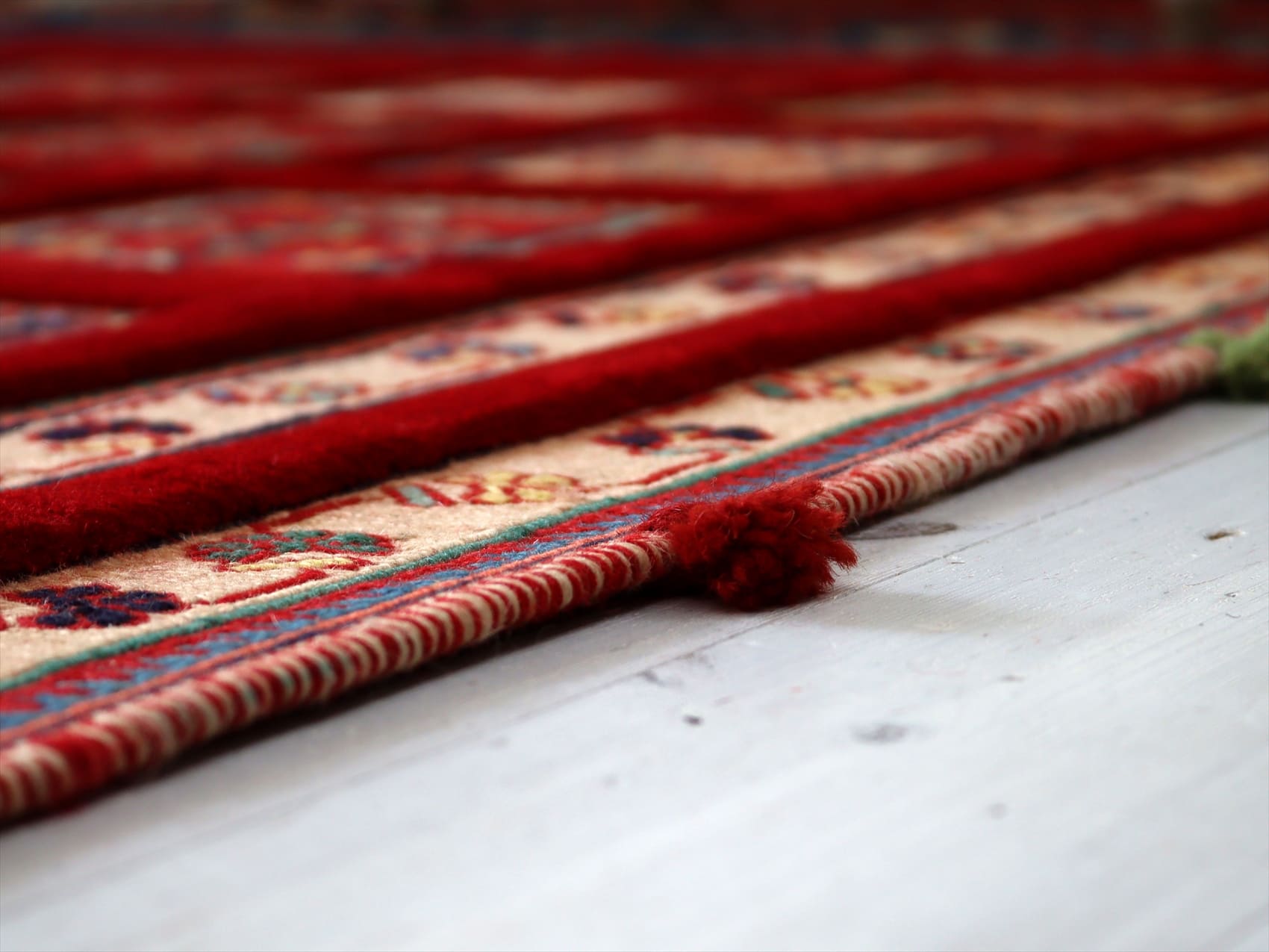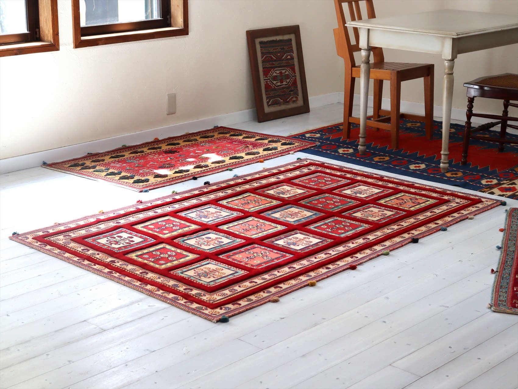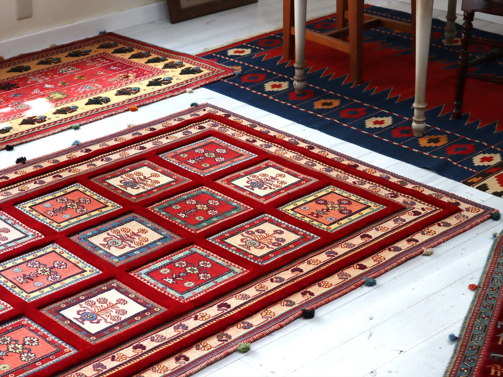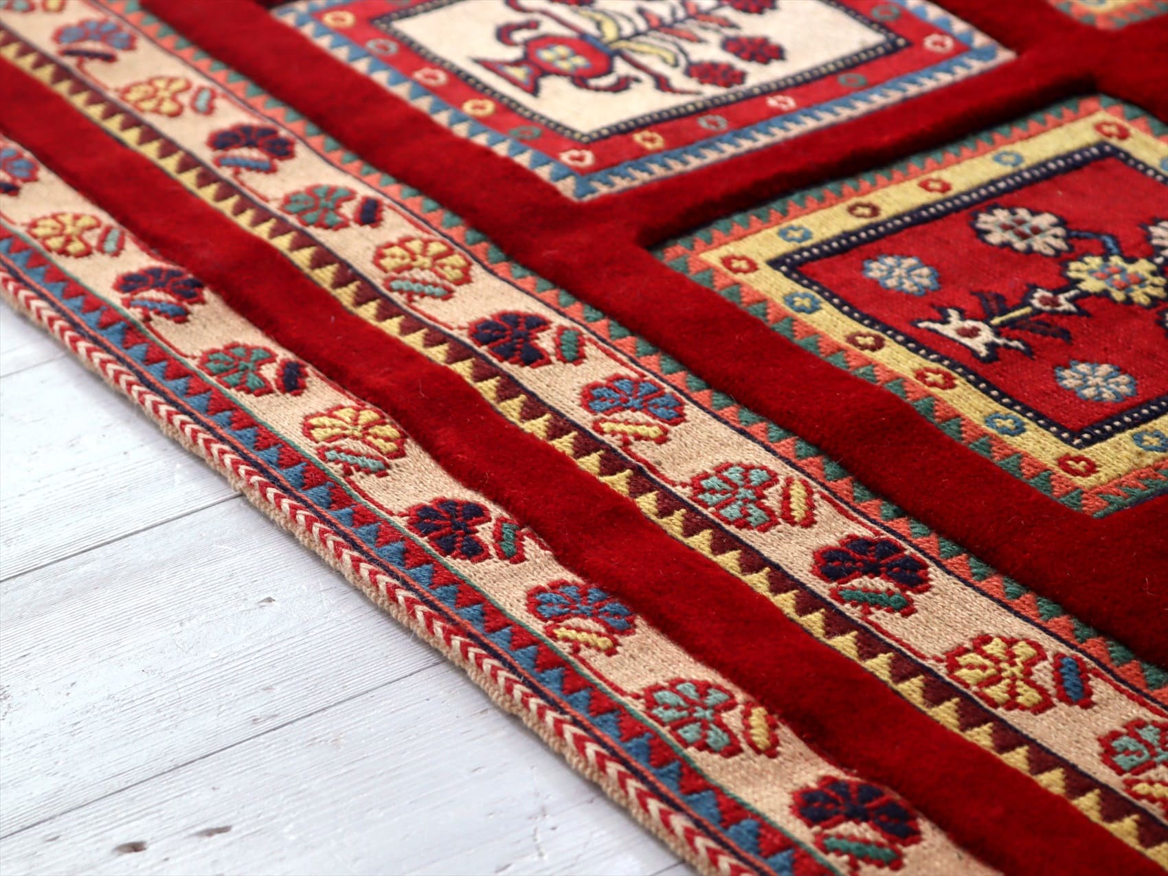 | カーペット織りで格子状に織られたタイルの中に花束が織られたデザイン。赤い枠の部分もカーペット織りです。房飾りがアクセントになっています。 刺繍のようなスマック織りと、立体感のあるカーペット織りを組み合わせた職人技とも言える緻密な織りの一枚。 |