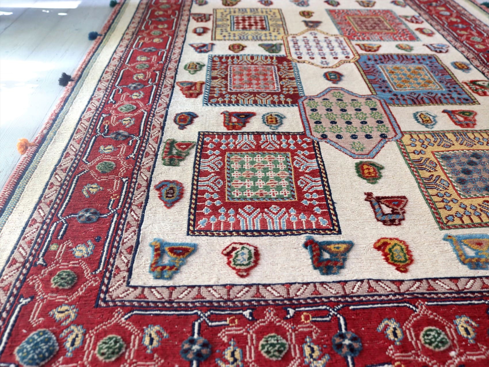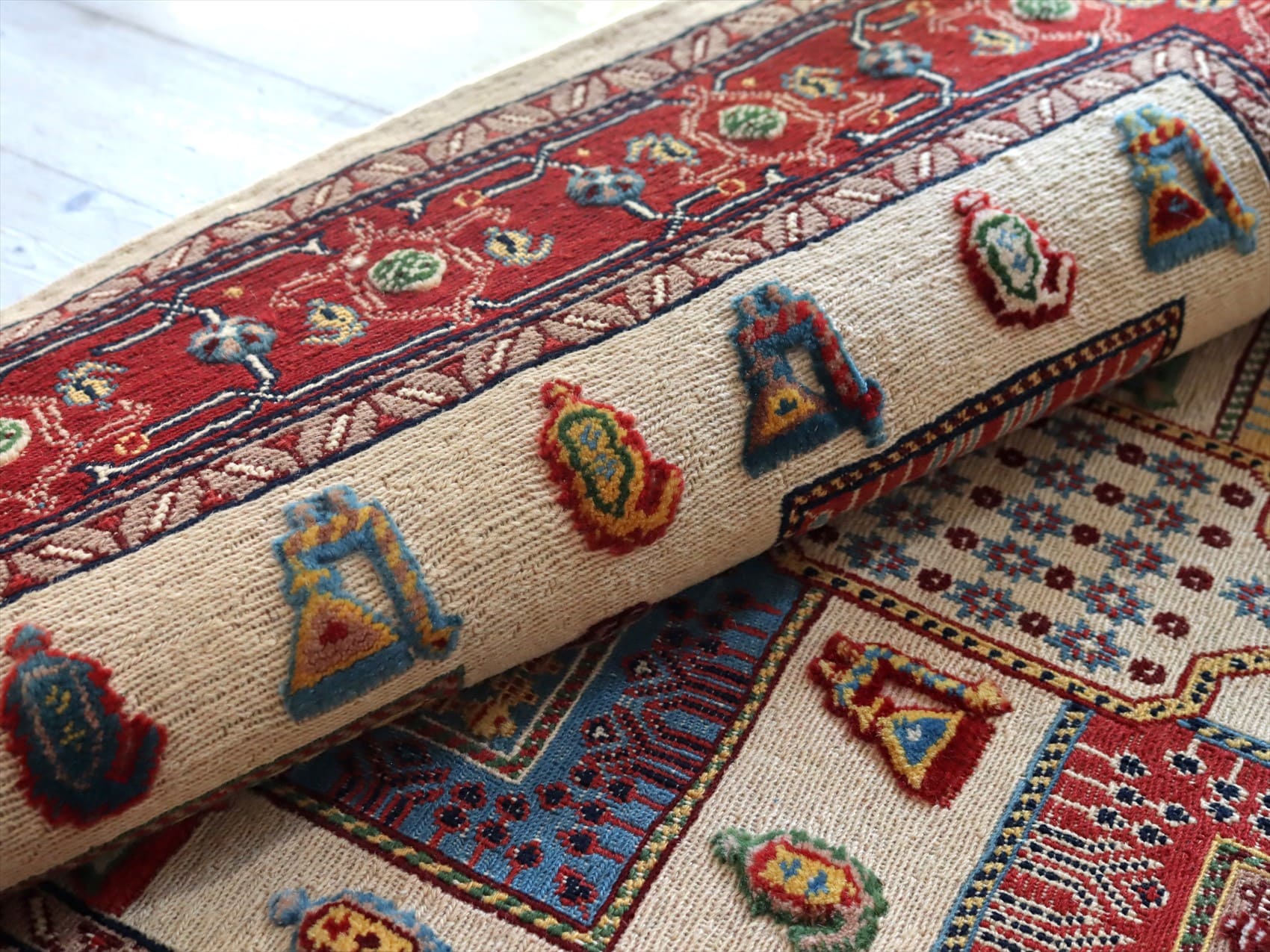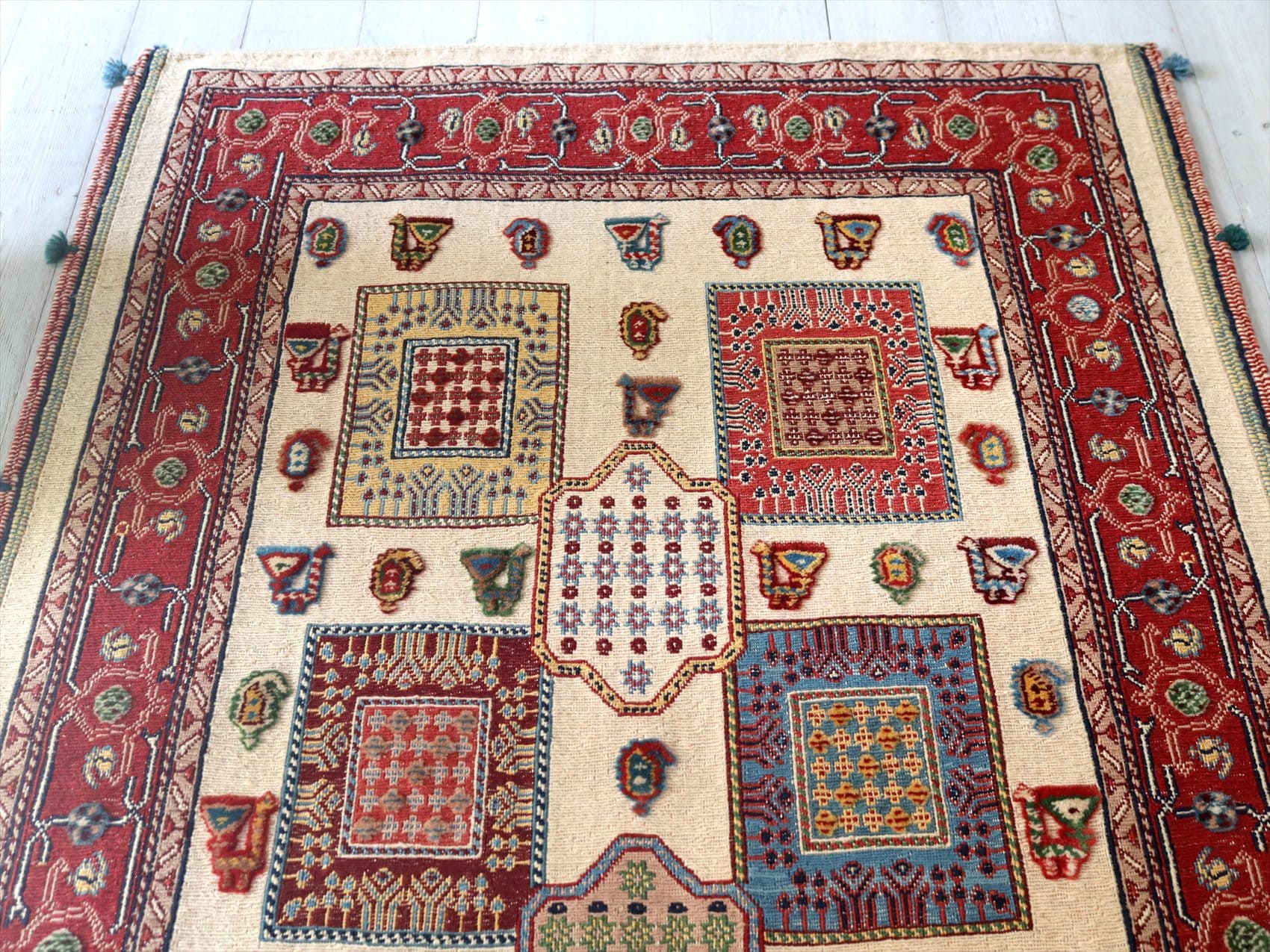 | センターのフィールドにはクジャクとボテ(ペイズリー)のモチーフ、レッドのボーダー部分には小花が連なるように織られています。モチーフはスマックとカーペット織りで描かれています。 刺繍のようなスマック織りと、立体感のあるカーペット織りを組み合わせた職人技とも言える緻密な織りの一枚。 |