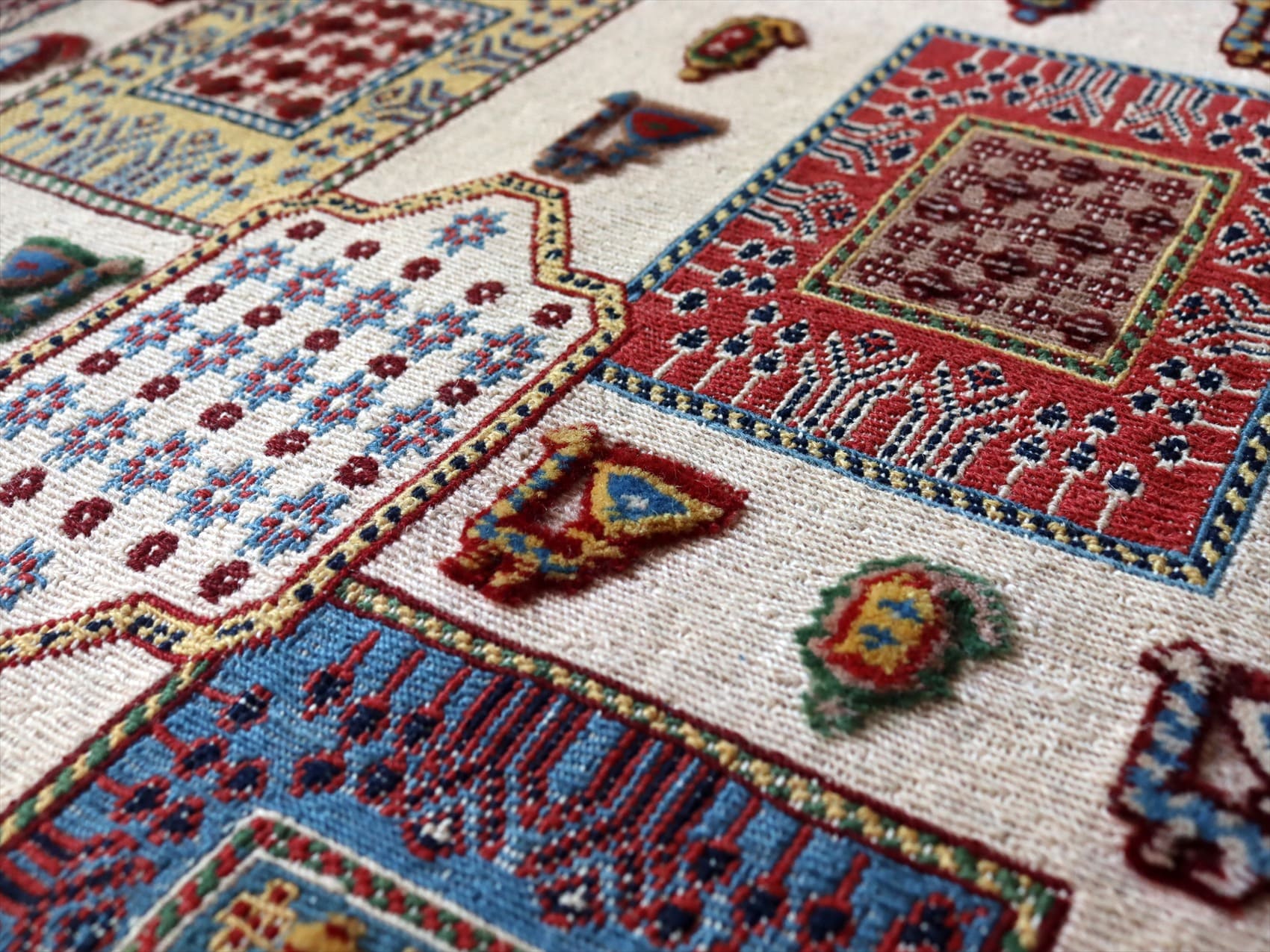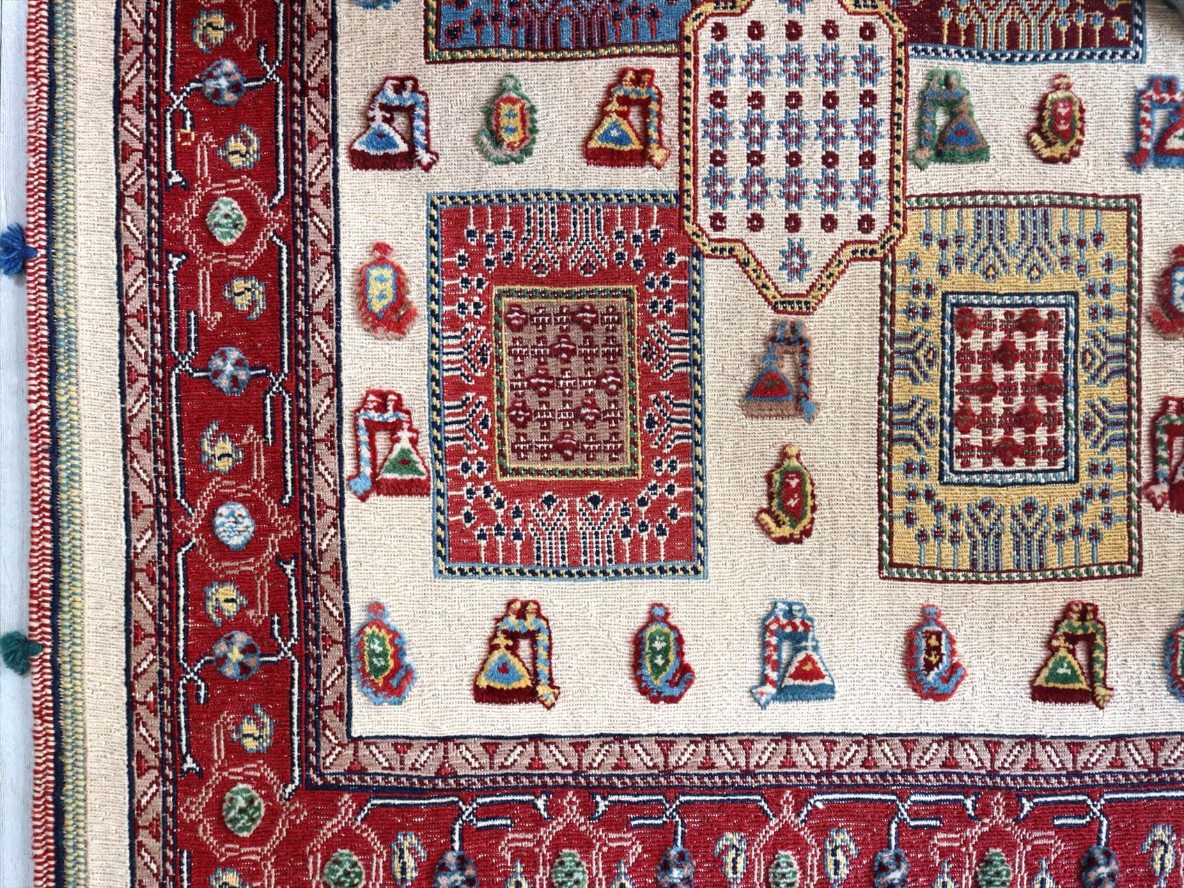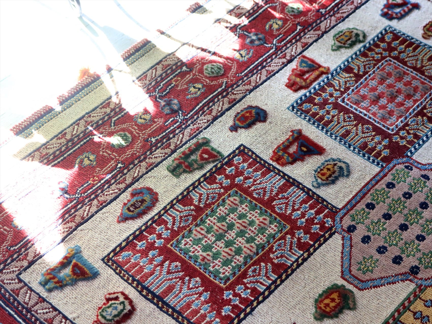 | センターのフィールドにはクジャクとボテ(ペイズリー)のモチーフ、レッドのボーダー部分には小花が連なるように織られています。モチーフはスマックとカーペット織りで描かれています。 刺繍のようなスマック織りと、立体感のあるカーペット織りを組み合わせた職人技とも言える緻密な織りの一枚。 |