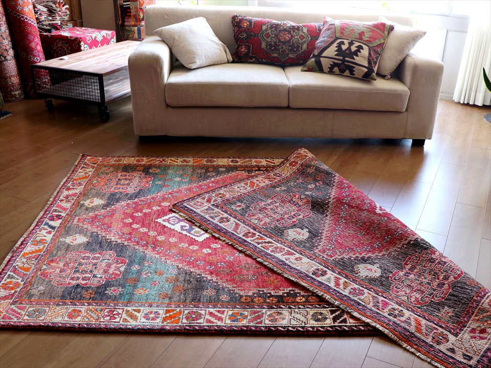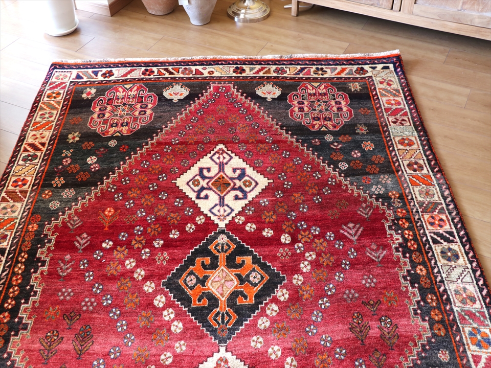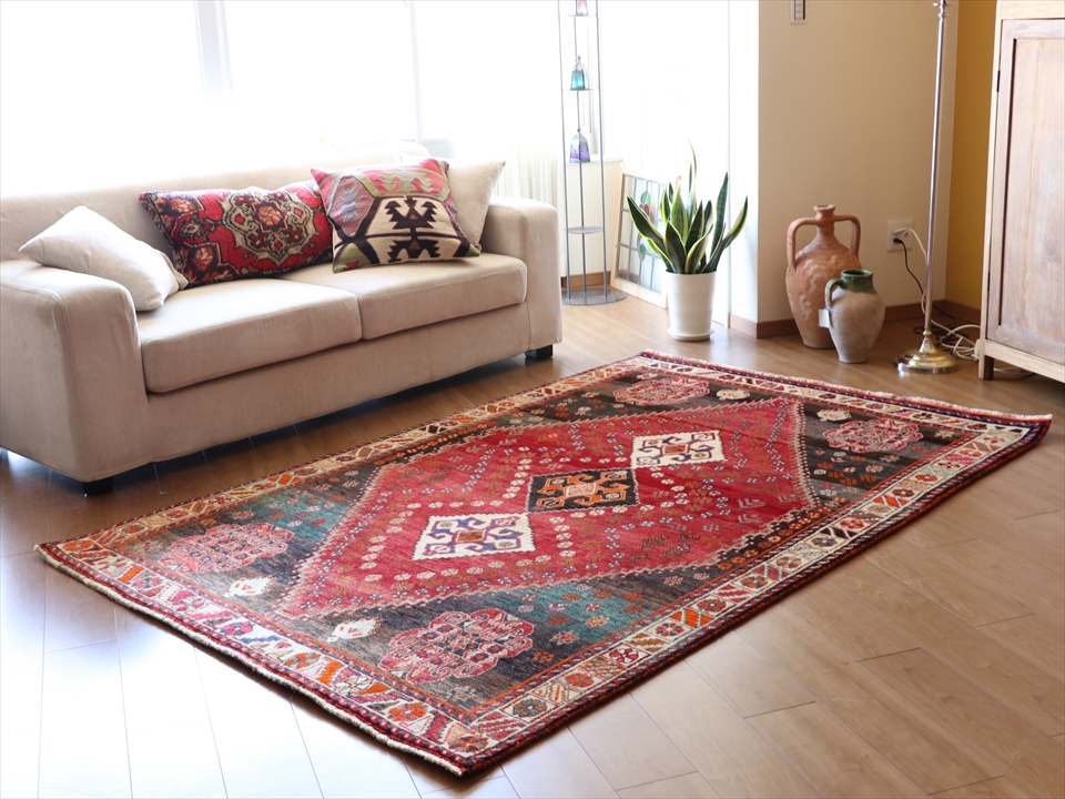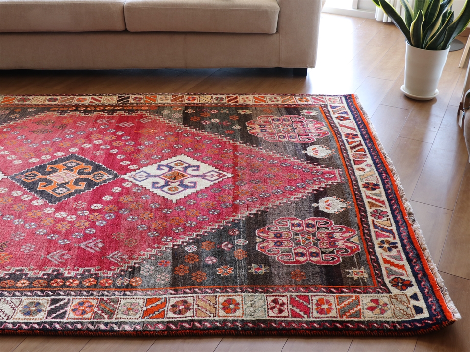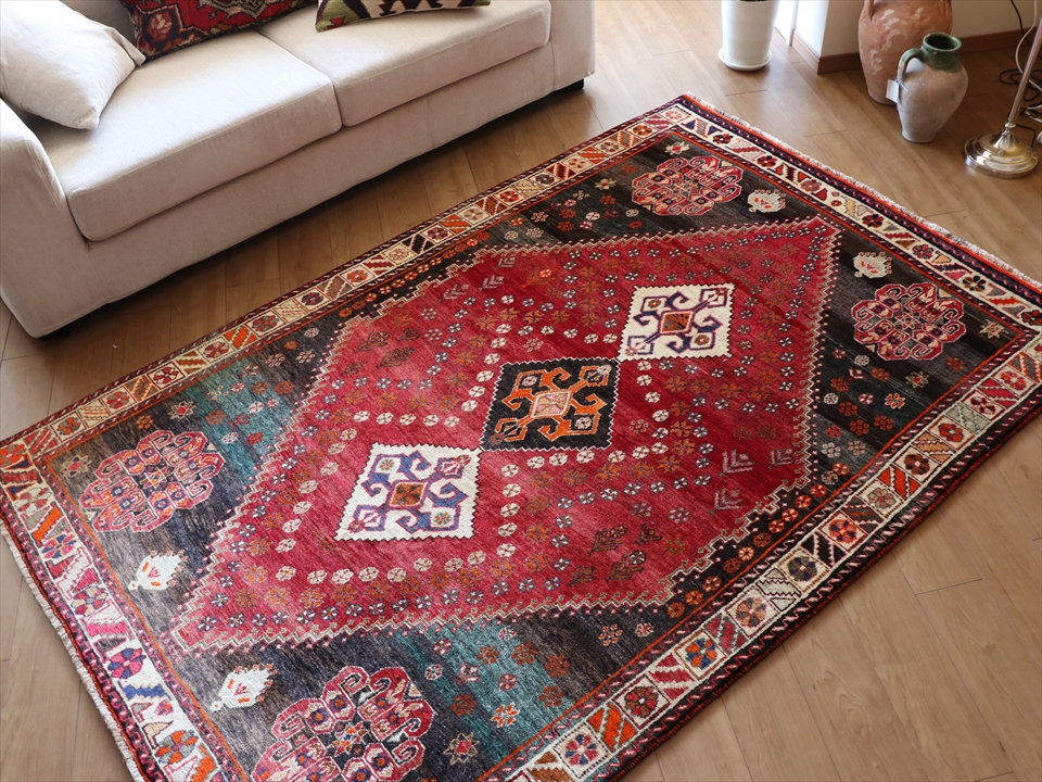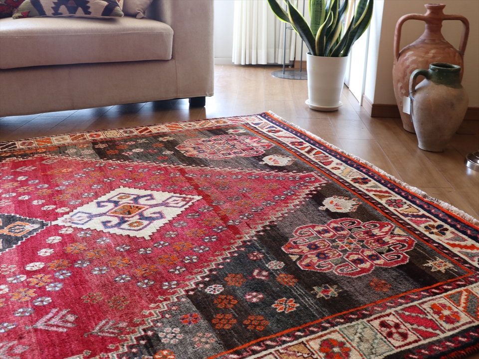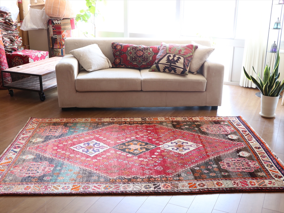 Key:Tribal Rug, Vintage rug, Area rug, Old Carpet, hand knotted, Persian carpet, Pure wool, Import, Shiraz, Fars, Qashkai tribe, トライバルラグ, エリアラグ, ヴィンテージラグ, 手織り, 一点もの, じゅうたん, 絨毯, ペルシャ絨毯, 部族絨毯, BO-HO, Collectable,