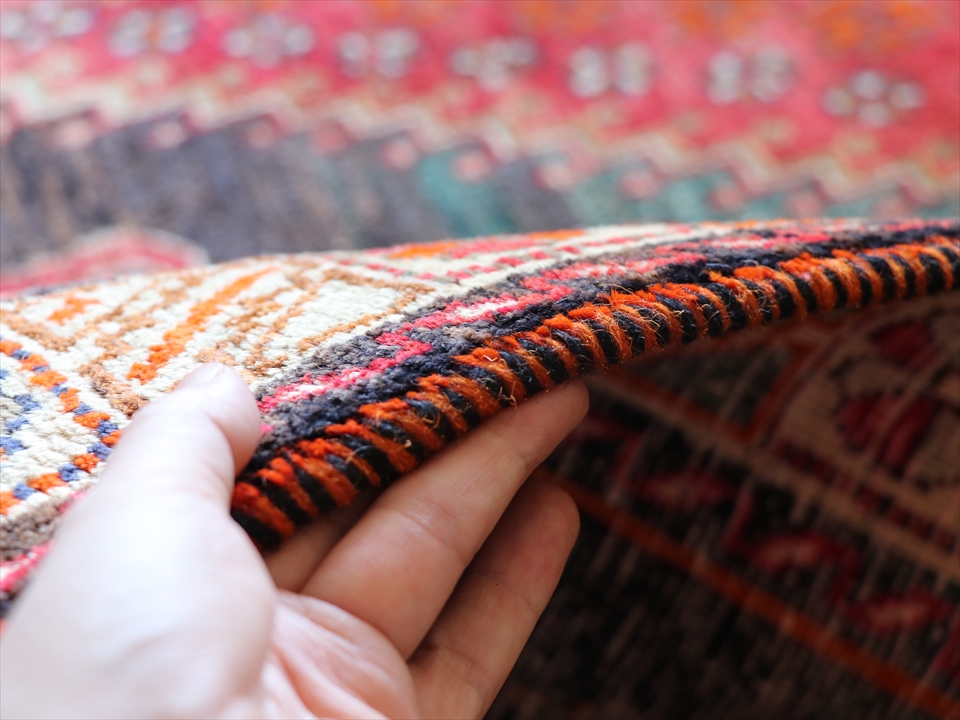 | 赤い六角形の外側の黒からグリーンへのグラデーションが、とても美しい!計算されたものではなく、偶然できた色の変化でしょうか。自由なアイデアで織られた部族絨毯ならではの魅力的な一枚です。 |