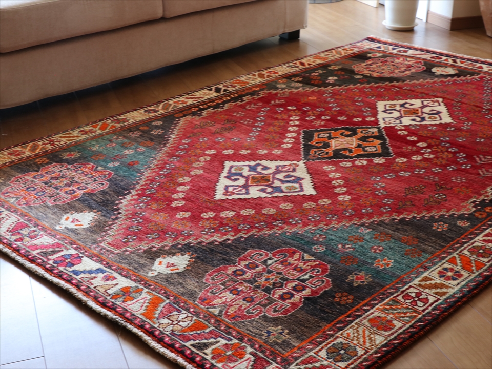 部族絨毯 カシュカイ族232×151cm レッド/グリーン 赤い六角メダリオン